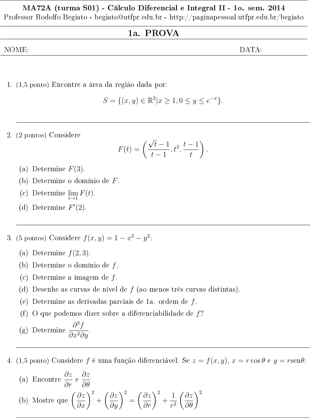 MA72A (turma S01) - Cálculo Diferencial e Integral II - 1o. sem. 2014 Professor Rodolfo Begiato - begiato@utfpr.edu.br - http://paginapessoal.utfpr.edu.br/begiato 1a. PROVA NOME: DATA: 1. (1,5 ponto) Encontre a área da região dada por: S = {(x, y) ∈ R2|x ≥ 1, 0 ≤ y ≤ e−x}. 2. (2 pontos) Considere F (t) = (√ t− 1 t− 1 , t2, t− 1 t ) . (a) Determine F (3). (b) Determine o domínio de F . (c) Determine lim t→1 F (t). (d) Determine F ′(2). 3. (5 pontos) Considere f(x, y) = 1− x2 − y2: (a) Determine f(2, 3). (b) Determine o domínio de f . (c) Determine a imagem de f . (d) Desenhe as curvas de nível de f (ao menos três curvas distintas). (e) Determine as derivadas parciais de 1a. ordem de f . (f) O que podemos dizer sobre a diferenciabilidade de f? (g) Determine ∂3f ∂x2∂y . 4. (1,5 ponto) Considere f é uma função diferenciável. Se z = f(x, y), x = r cos θ e y = rsenθ: (a) Encontre ∂z ∂r e ∂z ∂θ (b) Mostre que ( ∂z ∂x )2 + ( ∂z ∂y )2 = ( ∂z ∂r )2 + 1 r2 ( ∂z ∂θ )2