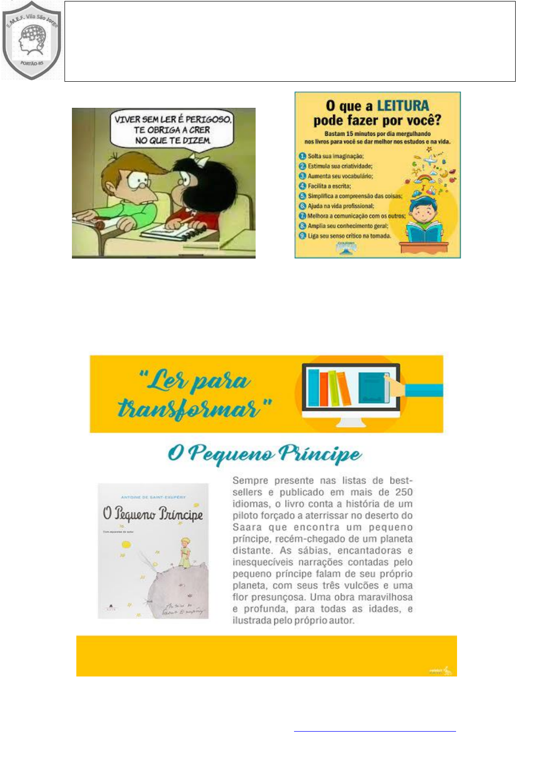 https://www.google.com OBRA: livro “O pequeno príncipe” Um pouco sobre a história “Quem poderia imaginar que a história de um aviador perdido no Saara, que só queria fazer um amigo, de uma rosa convencida e de uma raposa ainda não domesticada se tonaria um dos livros mais lidos e mais queridos de todos os tempos?” (https://www.amazon.com.br/Pequeno-Principe) EMEF VILA SÃO JORGE Componente curricular: Língua Portuguesa 6ºs ano Turma: _____ Nome: _________________________________________ Data: ___________ Professora: Cristina Severo Soares 1º TRIMESTRE Blocos 5 e 6 https://www.amazon.com.br/Pequeno-Principe Um pouco sobre o autor do livro Ocupação Escritor e piloto francês Data do Nascimento 29/06/1900 Data da Morte 31/07/1944 (aos 44 anos) RESUMO DA BIOGRAFIA DE ANTOINE DE SAINT-EXUPÉRY Por Dilva Frazão Antoine de Saint Exupéry (1900-1944) foi um escritor, ilustrador e piloto francês, é o autor de um clássico da literatura “O Pequeno Príncipe”, escrito em 1943. Entre as suas diversas frases famosas estão: "Só se vê bem com o coração. O essencial é invisível para os olhos" e "Tu te tornas eternamente responsável por aquilo que cativas". Antoine-Marie-Roger de Saint-Exupéry nasceu em Lyon (França), no dia 29 de junho de 1900. Era o terceiro filho do conde Saint-Exupéry e da condessa Marie Fascolombe, família aristocrática empobrecida. Estudou no colégio jesuíta Notre Dame de Saint Croix e no colégio dos Marianistas, em Friburgo, na Suíça. Carreira de Piloto Em 1921 ingressou no serviço militar, no Regimento de Aviação de Estrasburgo, após ter sido reprovado para a Escola Naval. Tornou-se piloto civil e subtenente da reserva. Em 1926 foi admitido na Aéropostale, onde começou sua carreira de piloto de linha, voando entre Toulouse, Casablanca e Dacar. Nessa época, publicou seu primeiro livro, O Aviador (1926) Ajudou a implantar rotas de correio aéreo na África, América do Sul e Atlântico Sul, além de ter sido pioneiro nos voos Paris - Saigon e Nova Iorque - Terra do Fogo. Nessa época, publicou Correio do Sul (1929). Na década de 30, Exupéry trabalhou como piloto de provas para a Air-France e repórter do Paris- Soir. Em 1931, publicou voo noturno, onde exaltou os primeiros pilotos comerciais que enfrentavam a morte no cumprimento do dever. Registro suas próprias aventuras em “Terra dos Homens” (1939). Com a invasão dos nazistas na França, Exupéry fugiu para os Estados Unidos. Nesse período, escreveu Carta a Um Refém (1943) e incentivado por editores americanos, que viram sua habilidade como desenhista amador, a fazer uma obra par crianças. Até ali, seus livros falavam de sua paixão profissional: a aviação. O Pequeno Príncipe Em 1943, Antoine de Saint-Exupéry escreveu seu livro mais importante O Pequeno Príncipe (1943), uma fábula infantil para adultos, cuja obra é rica em simbolismo, com personagens como a serpente, a rosa, o adulto solitário e a raposa. O personagem principal do livro vivia sozinho num planeta pequeno, onde existiam três vulcões, dois ativos e um já extinto. Outro personagem representativo é a rosa, cujo orgulho, levou o pequeno príncipe a uma viagem pela terra. Na viagem, encontrou outros personagens que o levaram ao desvendamento do sentido da vida. A obra foi traduzida no mundo inteiro. Morte Em 1943, Antoine de Saint-Exupéry voltou para a força aérea no norte da África e tal como o Pequeno Príncipe no final do livro, Saint-Exupéry parece ter apenas desaparecido da terra, morreu em um acidente de avião, durante uma missão de reconhecimento, no dia 31 de julho de 1944, abatido por um caça alemão. Seu corpo nunca foi encontrado. Em 2004, foram encontrados os destroços do avião que pilotava, a poucos quilômetros da costa de Marselha, na França. TAREFA A SER REALIZADA: TÍTULO: BATE PAPO LITERÁRIO Subtítulo: Café literário! Chá literário! Chimarrão literário! Piquenique literário! Quer escolher qual deles utilizar na sua tarefa? Pois pode escolher entre um destes para produzir seu vídeo! A proposta é cada aluno gravar um momento em que conversa, ou seja, um “bate papo literário” com alguém (pode ser a mãe, o irmão, um amigo...) e enquanto toma seu café, ou chimarrão, realiza seu piquenique, ou toma seu chá, neste momento passa a contar a história sobre os acontecimentos deste livro. Enquanto aborda os fatos em algum momento, deve explicar e mencionar, sem parecer que está respondendo questões, estas informações estarão contidas no seu jeito de contar/narrar a história. Vai “costurando” a sua narrativa de maneira que ao final da sua fala tenha contemplado todas as questões abaixo: 1) Qual a história do livro "O pequeno príncipe"? 2) Quais são os personagens e suas funções na história? (É só ir contando a história conforme ela acontece que dará conta de falar de todos eles, pois a história acontece a partir destes encontros. Não pode apenas citá-lo, deve falar sobre as características destes personagens, o assunto que conversaram e que aprendizado cada encontro apresentou). 3) Relate com mais detalhes um dos encontros que considera ter sido mais importante na história narrada, para contar durante a produção do seu vídeo. (É só escolher um dos encontros e no momento em que for falar sobre este no seu vídeo, fale dando mais detalhes). 4) Como o príncipe reagiu diante das explicações e dos ensinamentos da raposa? 5) Crie duas perguntas que só quem leu o livro saberia responder. Estas duas questões devem ser perguntadas pela pessoa que irá participar do vídeo junto com você. Esta pessoa pode participar de outros momentos de suas escolhas, realizar outras perguntas, mas estas 2 são determinadas que devem ser realizadas por ela. Esta pessoa pode ser alguém que irá lhe dar dicas, ajudar a lembrar sobre o que deve falar, desde que não faça a atividade por você, apenas ajude na realização, com pistas que podem ser p