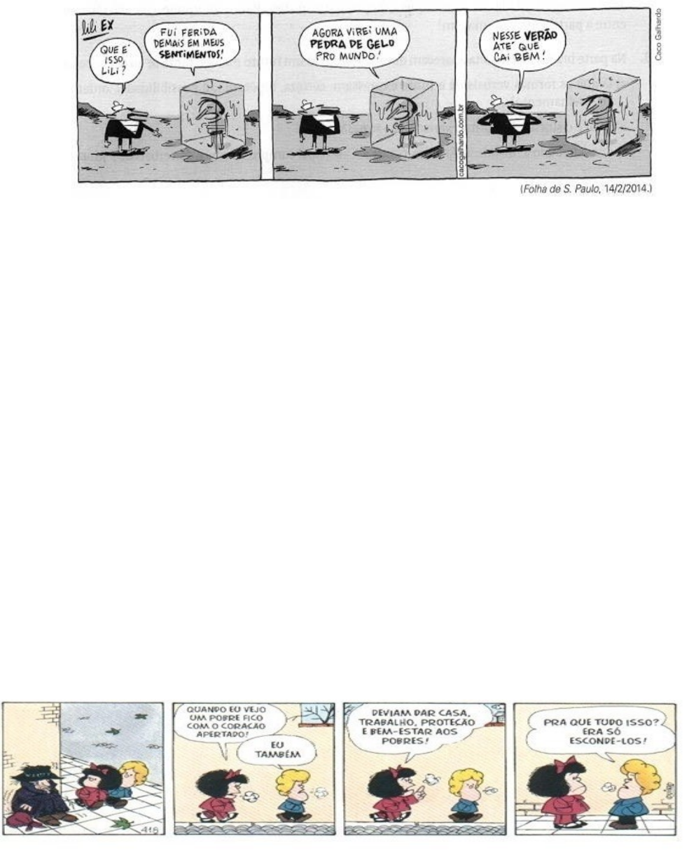 EXERCÍCIOS DE FIXAÇÃO – LÍNGUA PORTUGUESA 9.ANO DENOTAÇÃO E CONOTAÇÃO FIGURAS DE LINGUAGEM 1. Leia esta tira, de Caco Galhardo: a) No contexto, a declaração "virei uma pedra de gelo", feita pela personagem feminina, tem sentido denotativo ou conotativo? Por quê? _________________________________________________________________________________ b) A linguagem visual da tira dá à expressão pedra de gelo sentido denotativo ou conotativo? _________________________________________________________________________________ 2. Leia estes enunciados: I. Finalmente vou matar minha fome com esse lanche. II. A bateria das crianças parece não acabar. III. O sujeito que assaltou a loja estava mascarado. De acordo com as frases acima, é correto afirmar: a) a expressão “matar a fome” está no sentido denotativo e indica que a pessoa irá acabar com a fome ao comer o lanche. b) a palavra “bateria” refere-se a quantidade de energia das crianças e está sendo usada em sentido denotativo. c) o termo “mascarado” está sendo utilizado no sentido denotativo, pois o sujeito estava usando uma máscara para não ser reconhecido. d) todas as orações estão em sentido figurado, ou seja, apresentam o sentido subjetivo das palavras. e) todas as orações estão em sentido literal, ou seja, apresentam o sentido real das palavras. 3. Leia a tirinha, analise e assinale a opção correta: Na tirinha acima, o sentido conotativo é utilizado para: a) manifestar o sentimento da personagem no segundo quadro. b) demonstrar a solução dada pela personagem no último quadro. c) destacar o interesse das pessoas em situações de extrema pobreza. d) minimizar o susto das personagens ao encontrarem com um mendigo. e) indicar a importância da melhoria de vida das pessoas pobres. 4. Observe a imagem abaixo, identifique a figura de linguagem utilizada e justifique sua resposta: 5. Classifique as figuras de linguagem usadas nas seguintes frases em hipérbole e eufemismo. a) Eu morri de rir com aquela história. b) Você está ficando muito cheinha. c) Ele veio voando para casa. d) Já disse isso um milhão de vezes. e) Ele sempre foi meio desprovido de inteligência. 6. Na sentença, “Este seu Guignard é falso ou verdadeiro?”, o nome do pintor Guignard é empregado como uma referência para um quadro do mesmo pintor, ou seja, uma metonímia. Sendo assim, assinale a alternativa em que o uso desse nome tem a mesma função. a) “Mas me diga só uma coisa: viu Guignard pintar este quadro?” b) “Qualquer um vê logo que se trata de Guignard autêntico, Guignard da melhor época.” c)“Guignard tinha alunos; e daí?” d) “Eu não duvido nada, só que existem por aí uns cinquenta quadros falsos de Guignard, e então...” 7. Analise as frases abaixo: 1. Calções negros corriam, pulavam durante o jogo. 2. A mulher conquistou o seu lugar! 3. Todo cais é uma saudade de pedra. 4. Os microfones foram implacáveis com os novos artistas. Assinale a alternativa que corresponde correta e sequencialmente às figuras de linguagem apresentadas: A) metáfora, metonímia, metáfora, metonímia. B) metonímia, metonímia, metáfora, metáfora. C) metonímia, metonímia, metáfora, metonímia. D) metonímia, metáfora, metonímia, metáfora. E) metáfora, metáfora, metonímia, metáfora. 8. Assinale a única alternativa que possui catacrese: a) Devolva meu Aurélio. b) O rei do futebol é brasileiro. c) O jovem partiu dessa pra uma melhor. d) Ele tem duzentas cabeças de gado. e) Você vai precisar de duas cabeças de alho.