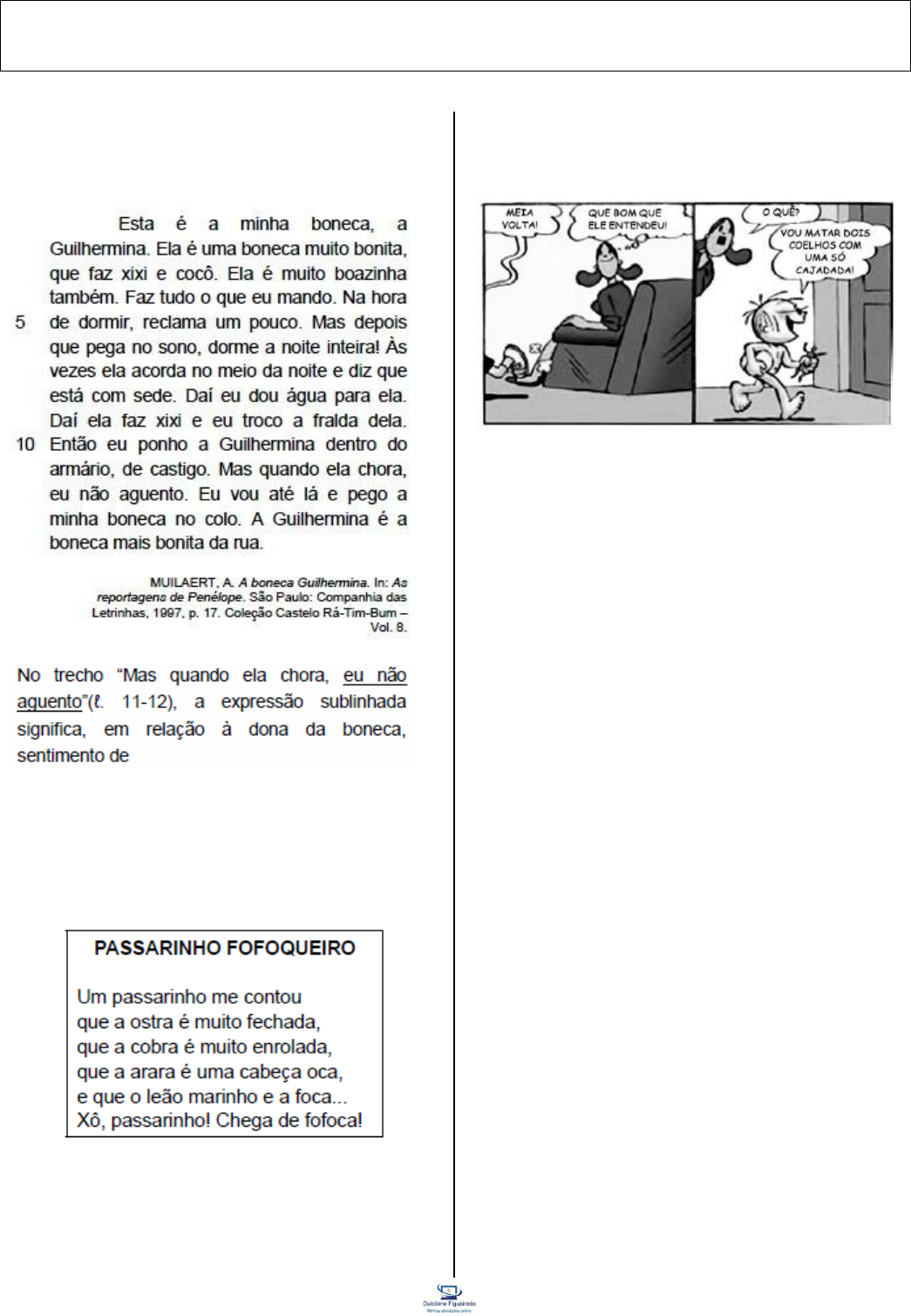 SIMULADO DE LP PROVA BRASIL – 5º ANO PROCEDIMENTOS DE LEITURA D3 – INFERIR O SENTIDO DE UM PALAVRA OU EXPRESSÃO 1 Aluno(a):________________________________ A BONECA GUILHERMINA (A) paciência. (B) pena. (C) raiva. (D) solidão. 2-Leia o texto abaixo responda: Disponível em: <http://www.revista.agulha.nom.br/jpaulo1.html>. Acesso em: 5 jun. 2010. Nesse texto, a expressão “cabeça oca” quer dizer A) complicada. B) fácil de influenciar. C) pensa pouco. D) teimosa. 3-Leia o texto abaixo. Disponível em: <http://www.meninomaluquinho.com.br.html> A expressão ― “vou matar dois coelhos com uma só cajadada!” indica que o menino conseguiu A) deixar a mãe tranquila. B) desobedecer às ordens da mãe. C) fugir do banho no chuveiro. D) tomar banho e brincar. 4-Leia o texto abaixo 33 DICAS DE COMO ENFRENTAR O AQUECIMENTO GLOBAL E OUTROS DESAFIOS DA ATUALIDADE”. [21] “Ao fazer compras, leve sua própria sacola, de preferência as de pano resistente”, aconselha o presidente do Instituto Ethos, Ricardo Young. Com esse gesto simples, você deixará de participar da farra das sacolinhas plásticas, que entopem cada vez mais os lixões das grandes cidades. O conselho dado por Ricardo Young pretende: A) Contribuir para a preservação das sacolas plásticas. B) Evitar desperdício das sacolas plásticas. C) Vender mais sacolas de pano. D) Evitar entupimento dos bueiros. 5-Leia o texto abaixo O TOCO DE LÁPIS Lá, num fundo de gaveta, dois lápis estavam juntos. 2 Um era novo, bonito, com ponta muito bem feita. Mas o outro – coitadinho! – era triste de se ver. Sua ponta era rombuda, dele só restava um toco, de tanto ser apontado. O grandão, novinho em folha, olhou para a triste figura do companheiro e chamou: – Ô, baixinho! Você, aí embaixo! Está me ouvindo? – Não precisa gritar – respondeu o toco de lápis. – Eu não sou surdo! – Não é surdo? Ah, ah, ah! Pensei que alguém já tivesse até cortado as suas orelhas, de tanto apontar sua cabeça! O toquinho de lápis suspirou: – É mesmo... Até já perdi a conta de quantas vezes eu tive de enfrentar o apontador... O lápis novo continuou com a gozação: – Como você está feio e acabado! Deve estar morrendo de inveja de ficar ao meu lado.- Veja como eu sou lindo, novinho em folha! – Estou vendo, estou vendo... Mas, me diga uma coisa: Você sabe o que é uma poesia? –Poesia? Que negócio é esse? –Sabe o que é uma carta de amor? – Amor? Carta? Você ficou louco, toquinho de lápis? –Fiquei tudo! Louco, alegre, triste, apaixonado! Velho e gasto também. Se assim fiquei, foi porque muito vivi. Fiquei tudo aquilo que aprendi de tanto escrever durante toda a vida. Romance, conto, poesia, narrativa, descrição, composição, teatro, crônica, aventura, tudo! Ah, valeu a pena ter vivido tanto, ter escrito tanta coisa, mesmo tendo de acabar assim, apenas um toco de lápis. E você, lápis novinho em folha: o que é que você aprendeu? O grandão, que era um lindo lápis preto, ficou vermelho de vergonha... Pedro Bandeira No trecho “Um era novo, bonito, com ponta muito bem-feita. Mas o outro – coitadinho! – era triste de se ver. (...)”, a palavra em destaque refere-se ao (A) apontador. (B) lápis grandão. (C) toquinho de lápis. (D) lápis vermelho. 6-Leia o texto abaixo. PULGAS As pulgas são insetos que, para se alimentar, sugam o sangue quente dos vertebrados. Sua picada provoca coceira. Há, muitas espécies de pulgas: “pulga do homem”, pulga do rato”, “pulga do cão” e “ bicho de pé”. Isso não quer dizer que a pulga de rato só ataque ratos, pois quaisquer das espécies infestam outros animais e também o homem. No trecho” ... pois quaisquer das espécies infestam outros animais e também o homem.”, a palavra grifada significa: (A) pulam (B) inflamam (C) atacam (D) assustam 7-Leia o texto abaixo. O MENOR JORNAL A jornalista Dolores Nunes é a responsável pelo menor jornal do mundo. No dia 23, o micro jornal Vossa Senhoria, da cidade de Divinópolis (MG), recebeu o certificado do livro dos recordes, atestando que o seu jornal, com apenas 3,5 centímetros de altura e 2,5 centímetros de largura, é o menor jornal do mundo. O jornal tem 16 páginas mensais, tiragem de 5 mil exemplares e aborda diversos assuntos da atualidade. O que significa atestando? A) Afirmando por escrito. B) Dando uma notícia. C) Fazendo um teste. D) Lendo com atenção. 8-Leia o texto abaixo. O MENINO DO PLANETA AZUL Menino que mora num planeta Azul feito a cauda de um cometa Quer se corresponder com alguém De outra galáxia Neste planeta onde o menino mora As coisas não vão tão bem assim: O azul está ficando desbotado E os homens brincam de guerra. É só apertar um botão Que o planeta Terra vai pelos ares... Então o menino procura com urgência 3 Alguém de outra galáxia Para trocarem selos, figurinhas E esperanças. O que o autor quis dizer com a frase: “E os homens brincam de guerra, é só apertar um botão que o planeta vai pelos ares”... (A) Os homens fabricam brinquedos de guerra. (B) O planeta gira pelo espaço e pode explodir a qualquer momento. (C) O menino não está preocupado com as guerras. (D) As armas fabricadas, irresponsavelmente, pelo homem são capazes de destruir o nosso planeta. 9-Leia o texto abaixo. OS POEMAS Os poemas são pássaros que chegam Não se sabe de onde e pousam No livro que lês Quando fechas o livro, eles alçam voo Como de um alçapão. Que palavra no 4º verso, substitui pássaros no poema de Quintana? A) Voo. B) Livro. C) Alçapão. D) Eles. 10-Leia a tirinha abaixo e responda. Ziraldo. Curta o Menino Maluquinho, São Paulo. Globo, v. 2, 2007. Na história em quadrinhos que você leu, a expressão “Irado!” aparece no título e no quinto quadrinho com o sentido de (A) sensacional. (B) revoltante. (C) medonho. (D) curioso. MARQUE O CARTÃO RESPOSTA