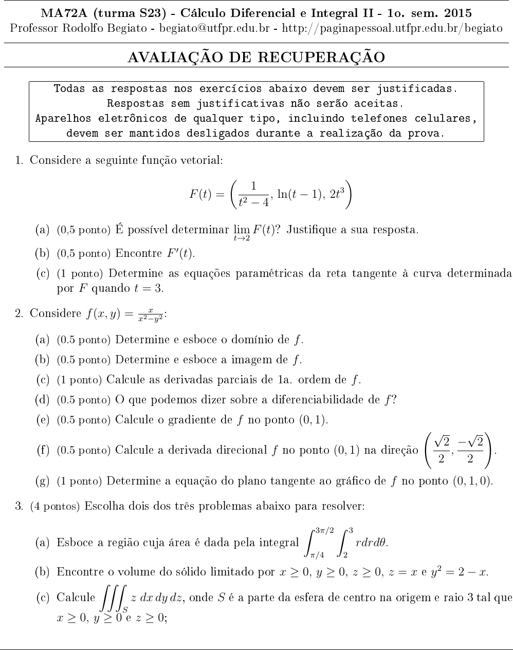 MA72A (turma S23) - Cálculo Diferencial e Integral II - 1o. sem. 2015 Professor Rodolfo Begiato - begiato@utfpr.edu.br - http://paginapessoal.utfpr.edu.br/begiato AVALIAÇÃO DE RECUPERAÇÃO Todas as respostas nos exercícios abaixo devem ser justificadas. Respostas sem justificativas não serão aceitas. Aparelhos eletrônicos de qualquer tipo, incluindo telefones celulares, devem ser mantidos desligados durante a realização da prova. 1. Considere a seguinte função vetorial: F (t) = ( 1 t2 − 4 , ln(t− 1), 2t3 ) (a) (0,5 ponto) É possível determinar lim t→2 F (t)? Justi�que a sua resposta. (b) (0,5 ponto) Encontre F ′(t). (c) (1 ponto) Determine as equações paramétricas da reta tangente à curva determinada por F quando t = 3. 2. Considere f(x, y) = x x2−y2 : (a) (0.5 ponto) Determine e esboce o domínio de f . (b) (0.5 ponto) Determine e esboce a imagem de f . (c) (1 ponto) Calcule as derivadas parciais de 1a. ordem de f . (d) (0.5 ponto) O que podemos dizer sobre a diferenciabilidade de f? (e) (0.5 ponto) Calcule o gradiente de f no ponto (0, 1). (f) (0.5 ponto) Calcule a derivada direcional f no ponto (0, 1) na direção (√ 2 2 , − √ 2 2 ) . (g) (1 ponto) Determine a equação do plano tangente ao grá�co de f no ponto (0, 1, 0). 3. (4 pontos) Escolha dois dos três problemas abaixo para resolver: (a) Esboce a região cuja área é dada pela integral ∫ 3π/2 π/4 ∫ 3 2 rdrdθ. (b) Encontre o volume do sólido limitado por x ≥ 0, y ≥ 0, z ≥ 0, z = x e y2 = 2− x. (c) Calcule ∫∫∫ S z dx dy dz, onde S é a parte da esfera de centro na origem e raio 3 tal que x ≥ 0, y ≥ 0 e z ≥ 0;