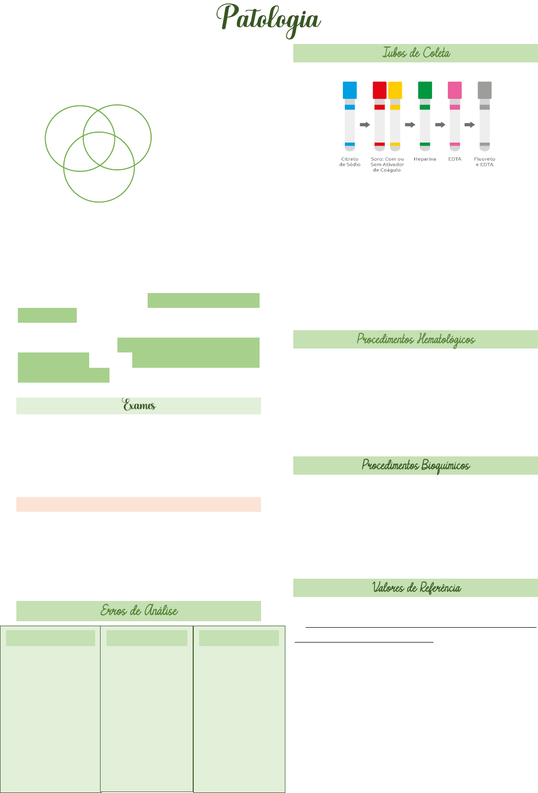 Patologia estuda a história do paciente, seu passado, presente e futuro. Além disso, estuda o uso das análises laboratoriais. Eles servem para auxiliar no: 1. Diagnóstico e casos clínicos; 2. Ajudam na evolução do quadro; 3. Auxiliam na resposta terapêutica; 4. Ajudam na validação de métodos de diagnóstico. Esse procedimento vai avaliar a presença, quantidade ou característica de uma substância de uma célula ou de um elemento dentro de um frasco. Existe dois tipos de exames laboratoriais, um vai estabelecendo a presença de um agente patogênico e o outro avalia a condição e resposta a uma alteração/doença. -Parasitológicos -Microbiológicos (presença de vírus, bact,...) -Imunológicos (exames sorológicos) -Toxicológicos Análises Clínicas: -Hemograma -Bioquímicos -Análises de fluídos -Citodiagnóstico -Histopatológicos Azul: é utilizado na análise de coagulação. Vermelho: possui ativador de coagulação, utilizado para testes bioquimicos. Amarelo: faz separação sem necessidade de centrifugação. Verde: usado para análise bioquimica de gasometria e outros exames. Roxo: contém aticoagulante, é utilizado em análise hematológica. Cinza: utilizado em análise de glicemia. A coleta de sangue deve estar dentro do tempo ideal, e ser armazenada em local frio. O esfregaço deve ser feito com sangue fresco, a quantidade de sangue deve ser ideal para cada tamanho de tubo, seguindo a recomendação do fabricante. -Tempo de permanência dos elementos figurados (células e glicose) -Refrigerado por 24 a 48h -Arquivo de congelados de (-70°C). -Tempo de armazenamento e a qualidade. O valor de referência vai seguir o intervalo do menor e o maior valor considerado “normal”, ou seja, o intervalo de referência. Cerca de 95% dos animais para se chegar no valor de referência são sadios, e é levado em consideração o sexo, idade, raça, ambiente, comportamento, estado de prenhes e gênero. Ex: Hematócrito de cão referência de 36 a 55% - Poodle com 42% pode estar anêmico. Fosfatase Alcalina está maior em animais jovens pela maior atividade óssea. CLINICA Coleta Manuseio Confiança Armazenamento Pré-analítica -Pedido ou interpretação errada da requisição médica; -Orientação inadequada ao paciente -Tempo de Jejum; -Coleta inadequada; -Estase venosa inadequada; -Proporção inadequada entre sangue e anticoagulante; -Volume insuficiente de amostra... Analítica -Falha no equipamento; -Perda de amostra; -Troca de amostra; -Contaminação entre amostras; Pós-analítica -Perda do resultado; -Interpretação equivicada do resultado e ação subsequente; -Erro na transcrição dos resultados; -Tempo de liberação dos resultados acima do especificado; -Valores de referência e limites de decisão inapropriados. Espécie Débito Urinário Cães e gatos 1 a 2 ml/kg/hora Bovinos e equinos 2 a 5 ml/kg/hora Existe substâncias que vão interferir na coleta, podendo ser: -Hemólise: falso aumento de enzimas mensuradas por espectrofotometria ou de substâncias presentes dentro de eritrócitos. Potássio em equinos e bovinos por exemplo. -Lipidemia: Aumento da turbidez da amostra. -Hiperbilirrubinemia: Coloração mais escura que o normal, excesso de bilirrubina no sangue (cor amarelada), comum em caso de icterícia. A bilirrubina está relacionada ao processo digestivo sendo eliminada em grande maioria nas fezes e urina. A urina é um líquido formado pelos rins, que tem como resultado a filtração do plasma. Nela vai haver eliminação de substâncias produzidas pelo catabolismo (etapa para obtenção de energia e diminuição da degradação de proteínas e carboidratos) e indesejáveis ao organismo, medicamentos e drogas ingeridas, etc.. Nos rins há milhares de néfrons, que são unidades morfofuncionais capazes de formar a urina. A Urinálise é um exame de urina, que constitui o método de avaliação fisíca, química e microbiológica da urina que serve para prognóstico ou diagnóstico de estados fisiológicos ou patológicos do paciente. A urina é composta por 95% de água, 2% ureia, e nos ultimos 3% restantes encontramos fosfato, sulfato, amônia, magnésio, cálcio, ácido úrico, creatina, sódio, potássio e outros elementos. O débito urinário (DU) é definido como, a quantidade de urina produzida pelos rins em um período pré-definido. Fase 1: Filtração O sangue vem do coração com a pressão muito alta, pela arteríola aferente fazendo com que a parte liquída do sangue, o plasma, se atravesse no lomérulo, sendo absorvido pela cápsula glomerular. Fase 2: Reabsorção Ela acontece no tubo contorcido proximal e na alça néfrica, fazendo uma reabsorção do sangue. Fase 3: Secreção Acontece no tubo contorcido distal e no ducto coletor, ocorrendo uma segunda reabsorção. Após isso, a urina vai passar para os rins, ureter, bexiga e uretra para ser eliminada. A urinálise é um componente essencial para avaliação do trato urinário, trazendo informações sobre a saúde do sistema urinário como um todo, além de fazer parte de check-up de todos. Alterações análisadas na composição da urina pode significar alguns problemas como, por exemplo: -Alteração na função renal; -Alteração na integridade de vias urinárias; -Falha de metabolismo de outros órgãos: fígado, adrenais e pâncreas. Micção espontânea (coleta natural). Cistocentese (pulsionar a bexiga através do abdômen para coletar diretamente da bexiga), porém só deve ser feita com auxilio de ultrassom. Cateterização (pode haver risco de cistite). O exame de urina deve ser realizado o mais rápido possível, coletando uma quantidade de 5 a 10 ml, Espécie N° de Néfrons Gatos 190.000/rim Cão 415.000/rim Suínos 1.250.000/rim Bovinos 4.000.00/rim desprezando os primeiros jatos. No frasco deve conter o nome do paciente. A refrigeração deve estar entre 0 a 4°C, manutenção por 24 horas no máximo e processar em temperatura ambiente. Esse exame vai verific
