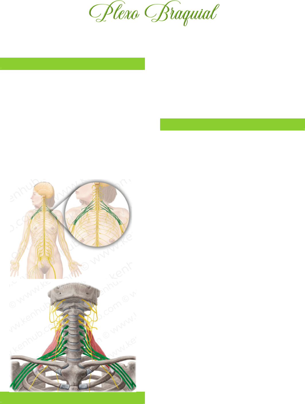 ANATOMIA Graziela Gonzaga Santana CONCEITO Plexo braquial (PB) é um conjunto de 5 raízes nervosas de C5 a T1 que formam uma rede de fusões e divisões para assim inervar todo o membro superior. O plexo braquial é formado pelas comunicações dos ramos anteriores dos últimos quatro nervos cervicais, ou seja, o quinto, sexto, sétimo e oitavo nervos cervicais e o primeiro nervo torácico. A união destas raízes origina troncos e fascículos nervosos que posteriormente darão origem aos principais nervos responsáveis pela motricidade e sensibilidade dos membros superiores. O membro superior é completamente inervado por ramos do plexo braquial. LOCALIZAÇÃO O plexo braquial tem localização lateral à coluna cervical e situa-se entre os músculos escalenos anterior e médio, posterior e lateralmente ao músculo esternocleidomastoideo. O plexo passa posteriormente à clavícula e acompanha a artéria axilar sob o músculo peitoral maior. Lateralmente a coluna vertebral cervical. Entre os mm. escalenos anterior e médio e lateralmente ao m. ECOM. Posterior à clavícula. Acompanha a a. axilar sob o m. peitoral menor. DIVISÃO Devido à complexidade desse plexo nervoso, ele foi dividido didaticamente em cinco seções anatômicas, que contém: cinco raízes, três troncos, seis divisões, três cordões e treze ramos, havendo ainda mais ou menos quatro outros ramos, quando os pequenos ramos que surgem diretamente das raízes são considerados. As raízes do plexo geralmente atravessam a abertura entre os músculos escalenos anterior e médio com a artéria subclávia. As fibras simpáticas conduzidas por cada raiz do plexo são recebidas dos ramos cinzentos dos gânglios cervicais médios e inferiores quando as raízes seguem entre os músculos escalenos. Hierarquia: raízes troncos divisões cordões ramos. Raízes: são a primeira seção do plexo, que emerge dos ramos ventrais dos quatro últimos nervos espinhais cervicais e do primeiro nervo espinhal torácico. Troncos: formam a segunda seção. O tronco superior é formado pelos ramos ventrais do quinto e sexto nervos espinhais cervicais. O tronco médio vem do sétimo nervo espinhal cervical, e o tronco inferior emerge dos ramos ventrais do oitavo nervo espinhal cervical e do primeiro nervo espinhal torácico. Na parte inferior do pescoço, as raízes do plexo braquial unem-se para formar três troncos: Um tronco superior, da união das raízes de C5 e C6. Um tronco médio, que é uma continuação da raiz de C7. Um tronco inferior, da união das raízes de C8 e T1. Cada tronco do plexo braquial ramifica-se em divisões anterior e posterior quando o plexo atravessa o canal cervicoaxilar posteriormente à clavícula. As divisões anteriores dos troncos suprem os compartimentos anteriores (flexores) do membro 2 superior, e as divisões posteriores dos troncos suprem os compartimentos posteriores (extensores). Cada um desses troncos é dividido em uma divisão posterior e uma divisão anterior. As três divisões posteriores dos troncos se unem e formam um tronco volumoso denominado fascículo posterior, que se divide, na fossa axilar, em dois ramos terminais: o nervo axilar e o nervo radial. TRONCO SUPERIOR Ramos do tronco superior: Nervo para o m. subclávio. Nervo supraescapular (inerva os mm. supraespinhal e infraespinhal). Ambos emergem do quinto e sexto nervos espinhais cervicais. O cordão lateral produz três nervos, todos emergindo do quinto ao sétimo nervos espinhais cervicais. TRONCO MÉDIO Continuação da raiz de C7. A divisão anterior do tronco superior se junta à divisão anterior do tronco médio; daí resulta o feixe lateral, de onde se origina o nervo musculocutâneo. O que resta do feixe lateral constitui a raiz lateral do nervo mediano. TRONCO INFERIOR União das raízes de C8 e T1. A divisão anterior do tronco inferior forma, por si, o trato medial, que, após originar os nervos cutâneos mediais do antebraço e ulnar, passa a ser a raiz medial do nervo mediano, que une o raiz lateral anterior à artéria axilar para formar o nervo mediano. FASCÍCULOS As divisões dos troncos formam três fascículos do plexo braquial. O nome dos fascículos posterior, lateral e medial refere-se à sua localização em relação à artéria axilar em todo ou parte de seu trajeto. O nome também indica os territórios de distribuição dos ramos de que se originam. O fascículo posterior inerva as regiões posteriores do membro superior, enquanto os fascículos lateral e medial distribuem a inervação das regiões anteriores. Os fascículos têm relação com a segunda parte da artéria axilar, que é indicada por seus nomes, por ex: o fascículo lateral está lateralmente à a. axilar, embora possa parecer que está superior a ela, já que é visto durante a abdução do membro. Os fascículos se dividem em seus ramos nervosos subsequentes, e continuam distal e inferiormente ao longo do membro superior. Esses fascículos terão várias ramificações que inervarão os membros superiores. A maior dessas ramificações é o nervo radial. FASCÍCULO LATERAL As divisões anteriores dos troncos superior e médio unem-se para formar o fascículo lateral. Do fascículo lateral originam o nervo musculocutâneo e sai um ramo que vai formar o nervo mediano. FASCÍCULO MEDIAL A divisão anterior do tronco inferior continua como o fascículo medial. Do fascículo medial originam o nervo ulnar e o outro ramo que vai formar o nervo mediano. 3 FASCÍCULO POSTERIOR As divisões posteriores dos três troncos unem-se para formar o fascículo posterior. Do fascículo posterior originam o nervo radial e axilar. Os três fascículos dão origem aos seus ramos terminais na fossa axilar ao nível da articulação do ombro, posteriormente ao músculo peitoral menor. Esses ramos apresentam relações diferentes com os vasos. COMUNICAÇÃO O plexo braquial se comunica com: Plexo cervical por meio de um ramo nervoso. Gânglio cervicotorácico do tr