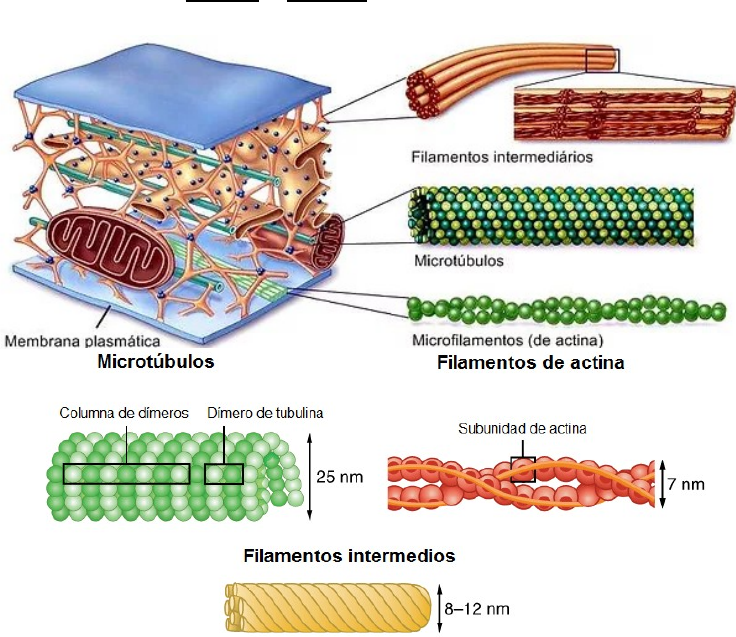 Citoesqueleto Descoberta: • Núcleo, organelas, vesículas de secreção e outros componentes celulares têm localização definida, quase sempre constante, conforme o tipo celular. • Esse fato levou os citologistas a admitirem a existência de um citoesqueleto que desempenharia apenas um papel mecânico, de suporte, mantendo a forma celular e a posição de seus componentes. • Além do papel mecânico, há um papel funcional, pois o citoesqueleto estabelece, modifica e mantém a forma das células. Funções: • Estabelece, modifica e mantém a forma das células. • Sustentação da célula. • É também responsável pelos movimentos celulares como contração, formação de pseudópodos e deslocamentos intracelulares de organelas, cromossomos, vesículas e grânulos diversos. Elementos: • Os principais elementos do citoesqueleto são: Microtúbulos..– Filamentos de actina..– Filamentos de miosina..– Filamentos intermediários (únicos estáveis, apenas papel de sustentação). – Macromoléculas proteicas diversas. – • Esses elementos estruturais constituem um conjunto dinâmico que assume aspectos diferentes, de acordo com o tipo celular e com as necessidades da célula. • De todos os componentes do citoesqueleto, apenas os filamentos intermediários são estáveis, exercendo somente funções de sustentação, sem participar dos movimentos celulares. • Os deslocamentos intracelulares de organelas e outras partículas se devem às proteínas motoras, que podem ser divididas em dois grandes grupos: as dineínas e cinesinas, que causam deslocamentos em associação com os microtúbulos e as miosinas, que podem formar filamentos e atuam em associação com os filamentos de actina. Microtúbulos: • Cilindros muito delgados e longos (24 nm de diâmetro). • Cada microtúbulo é formado pela associação de dímeros proteicos dispostos em hélice. • Os dímeros são constituídos por duas cadeias polipeptidicas de estruturas semelhantes, mas não iguais, chamadas tubulinas alfa e beta. • Tubulinas alfa e beta duas cadeias polipeptídicas dímeros microtúbulos. → → → • Os microtúbulos estão em constante reorganização, crescendo por uma de suas extremidades graças à polimerização local dos dímeros de tubulina, e diminuindo na outra extremidade, onde predomina a despolimerização. • Os processos de alongamento e encurtamento dos microtúbulos são devidos ao desequilíbrio entre Polimerização e despolimerização. • A formação de microtúbulos não depende da síntese proteica concomitante, já há dímeros de tubulina sintetizados no citosol. • A polimerização desses dímeros de tubulina para formar microtúbulos é regulada pela concentração de íons Ca2+ e pelas proteínas associadas aos microtúbulos (MAPS). • Nas células, a estabilidade dos microtúbulos é muito variável Ex: os dos cílios são muito estáveis e os do fuso não. • Existe na célula um intercâmbio constante entre os dímeros de tubulina livres no citoplasma e os dímeros polirnerizados encontrados nos microtúbulos. • Os microtúbulos participam de (funções): Movimentação de cílios e flagelos.– Transporte intracelular de partículas.– Deslocamento dos cromossomos na mitose.– Estabelecimento e manutenção da forma das células. – Fármacos que Interferem nos Microtúbulos: • A c olchicina se combina especificamente com os dímeros de tubulina e causa o desaparecimento dos microtúbulos menos estáveis, como os do fuso mitótico. • Os microtúbulos dos cílios e flagelos são resistentes à colchicina, talvez em razão das proteínas (MAPS) a eles associadas. • A colchicina se combina com os dímeros de tubulina, e, quando o complexo colchicina-tubulina é integrado no microtúbulo, impede a adição de novas moléculas de tubulina na extremidade mais (+) do microtúbulo. Como a despolimerização na extremidade menos (-) não cessa, o microtúbulo se desintegra. • Resumindo, a parte positiva (+) é onde cresce (polimerização) e a extremidade negativa (-) diminui (despolarização). • Outro alcaloide que interfere nos microtúbulos é o taxol, porém seu efeito molecular é contrário ao da colchicina. • O taxol acelera a formação de microtúbulos e os estabiliza, interrompendo a despolimerização. Toda a tubulina do citoplasma se polimeriza em microtúbulos muito estáveis. Desse modo, não há tubulina livre no citoplasma para formar os microtúbulos do fuso e a mitose não se processa. • Portanto, os efeitos da colchicina e do taxol sobre a mitose são semelhantes, embora um destrua e o outro estabilize microtúbulos, o que mostra a importância do sistema formado por tubulina livre e tubulina polimerizada. Microtúbulos dos Centríolos: • Cada célula contém um par de centríolos que se localiza no centrossomo (centro celular). • O centrossomo é constituído por um material amorfo de onde se originam microtúbulos. Por isso, o centrossomo é um MTOC (microtubule organizing center). • Ao microscópio óptico, o centrossomo aparece como um corpúsculo esférico, muito pequeno e demonstrável apenas por colorações especiais. • A posição dos centríolos de cada par é muito típica e constante, pois eles se dispõem sempre de modo que um centríolo forme um ângulo reto com o outro. • Cada centríolo é constituído por um material amorfo no qual estão colocados 27 microtúbulos Filamentos de Actina: • São formados por duas cadeias em espiral de monômeros globosos da proteína actina G, que se polimerizam lembrando dois colares de pérolas enrolados, formando uma estrutura quaternária fibrosa (actina F). • São finos (5 a 7 nm de diâmetro). Frequentemente se agregam para formar feixes mais grossos. • Muito abundante no músculo, a actina é encontrada também, embora em menor quantidade, no citoplasma de todas as células, onde constitui 5 a 30% das proteínas totais do citoplasma. • Os 