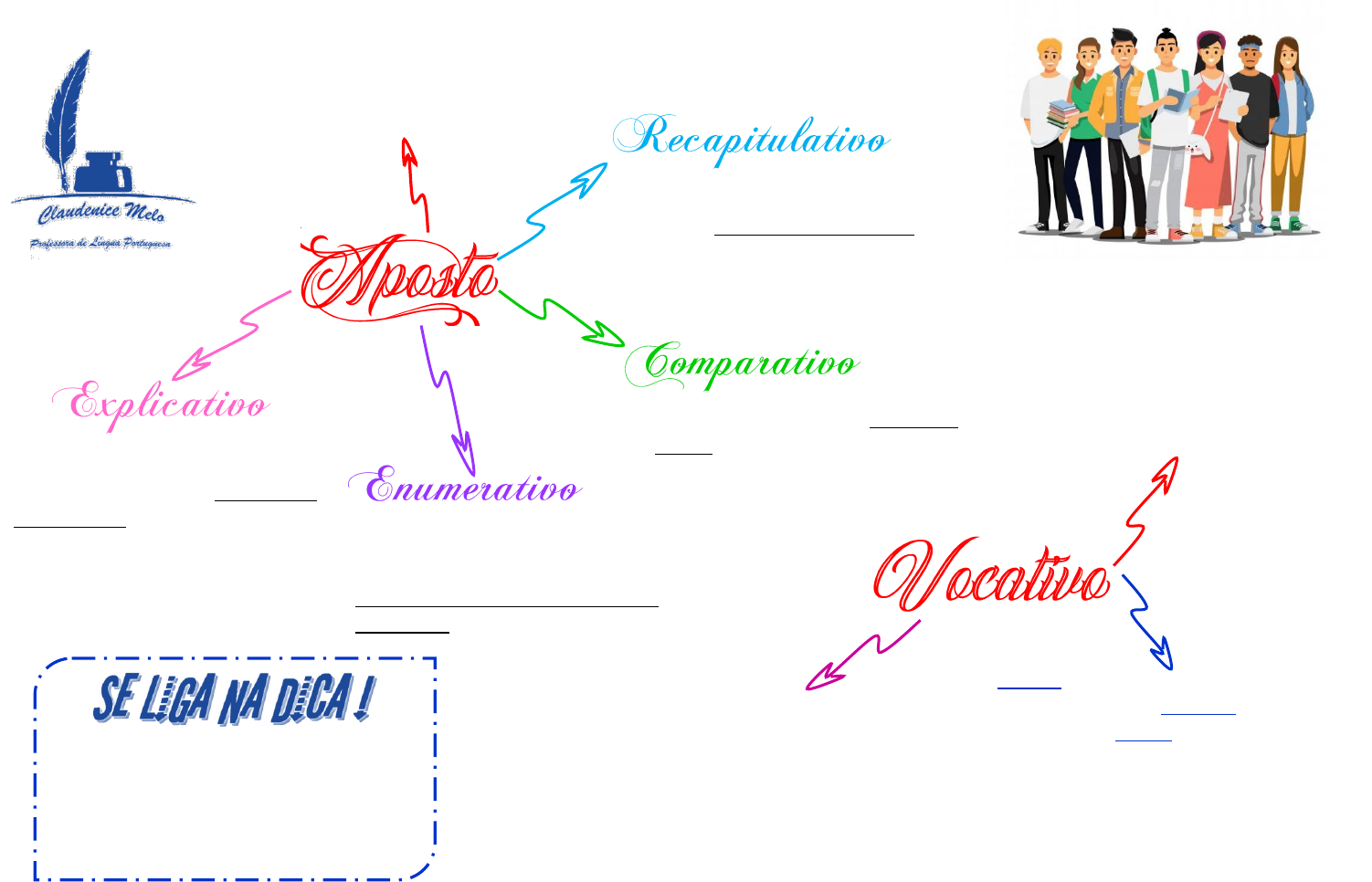 Termo que, acrescentado a outro termo da oração, tem a função de ampliar, resumir, explicar ou desenvolver mais o conteúdo do termo ao qual se refere. Assisti a um documentário sobre Chuck Jones, criador do Pernalonga, na TV a cabo. Para vencer na vida, são necessárias três qualidades: coragem, determinação e paciência. O rio caudaloso, serpente negra, traz o progresso para as populações ribeirinhas. Lápis, cadernos, borrachas, canetas, todos esses objetos, atraem a atenção das crianças nas papelarias (resumidor). Na escrita, o aposto é sempre antecedido por vírgula ou dois-pontos; O explicativo e comparativo são antecedidos e seguidos por vírgula. Termo que tem a função de interpelar diretamente (chamar) o interlocutor. Por estar isolado no enunciado, não exerce função de sujeito e nem de predicado, aparecendo geralmente separados do restante da oração por meio da vírgula. Amiga, você sabe que horas são? Venha ver isso, pessoal! Você sabe, Pedro, que eu te amo.