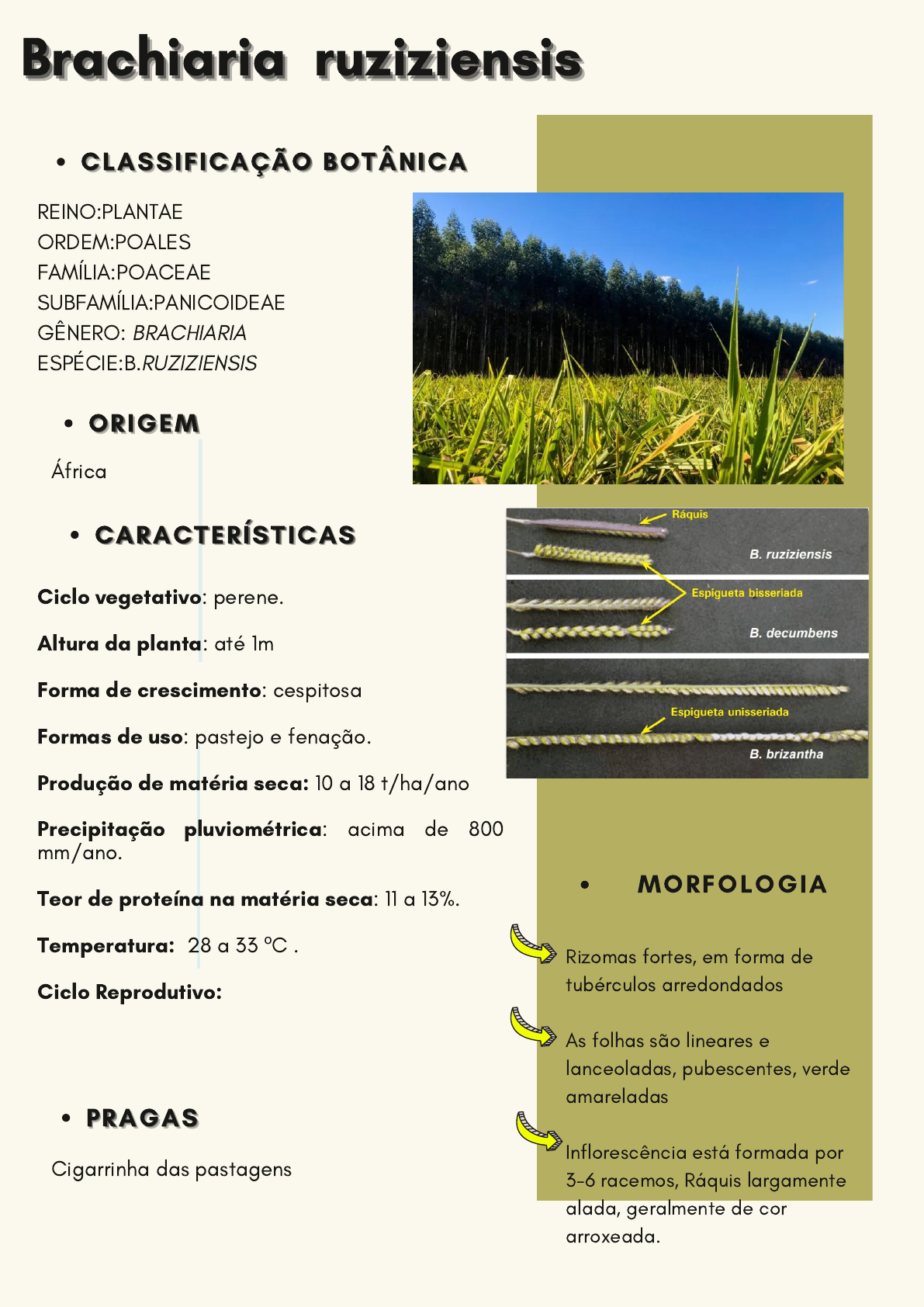 Ciclo vegetativo: perene. Altura da planta: até 1m Forma de crescimento: cespitosa Formas de uso: pastejo e fenação. Produção de matéria seca: 10 a 18 t/ha/ano Precipitação pluviométrica: acima de 800 mm/ano. Teor de proteína na matéria seca: 11 a 13%. Temperatura: 28 a 33 ºC . Ciclo Reprodutivo: BrachiariaBrachiariaBrachiaria ruziziensisruziziensisruziziensis REINO:PLANTAE ORDEM:POALES FAMÍLIA:POACEAE SUBFAMÍLIA:PANICOIDEAE GÊNERO: BRACHIARIA ESPÉCIE:B.RUZIZIENSIS Rizomas fortes, em forma de tubérculos arredondados As folhas são lineares e lanceoladas, pubescentes, verde amareladas Inflorescência está formada por 3-6 racemos, Ráquis largamente alada, geralmente de cor arroxeada. CLASSIFICAÇÃO BOTÂNICACLASSIFICAÇÃO BOTÂNICACLASSIFICAÇÃO BOTÂNICA ORIGEMORIGEMORIGEM África CARACTERÍSTICASCARACTERÍSTICASCARACTERÍSTICAS MORFOLOGIA PRAGASPRAGASPRAGAS Cigarrinha das pastagens