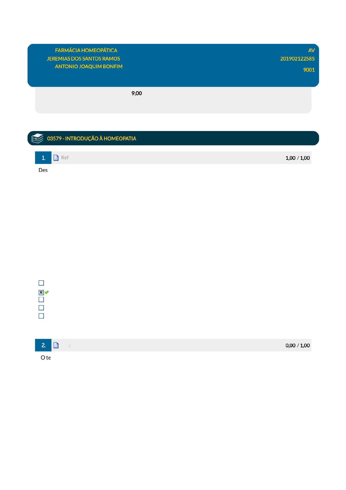 Impresso por Mere Jane Mere Jane, E-mail mere.jane.mjp@gmail.com para uso pessoal e privado. Este material pode ser protegido por direitos autorais e não pode ser reproduzido ou repassado para terceiros. 09/10/2023, 14:26:48 10/06/2023, 18:05 EPS https://simulado.estacio.br/alunos/ 1/4 Disciplina: Aluno: Professor: Turma: DGT1156_AV_201902122585 (AG) 22/05/2023 16:06:04 (F) Avaliação: Nota SIA: pts Estação de trabalho liberada pelo CPF 14669505793 com o token 713235 em 22/05/2023 16:05:07. Ref.: 7663385 Pontos: / Desde o estabelecimento da homeopatia por Hahnemann até os dias atuais, a complexidade das doenças e sintomas, bem como a experiência clínica dos homeopatas, levou à criação de diferentes escolas de pensamento homeopático. AnaliseI as seguintes armativas e marque a alternativa que traz, respectivamente, a que escola homeopática correspondem. I - Prescrição de dois ou mais medicamentos que cobrem a gama de sintomas do paciente, administrados em momentos diferentes para que ajam de forma sinérgica; II - Prescrição de dois ou mais medicamentos que devem ser administrados ao mesmo tempo; III - Prescrição de um único medicamento que cobre a totalidade dos sintomas do paciente; IV - Foco nos órgãos e sistemas e não no paciente como um todo, desconsiderando os sintomas mentais e emocionais. Marque a alternativa que relaciona corretamente as armativas com as 4 escolas da homeopatia nomeadas respectivamente abaixo. Organicismo, Complexismo, Unicismo e Pluralismo. Pluralismo, Complexismo, Unicismo e Organicismo. Complexismo, Pluralismo, Unicismo e Organicismo. Complexismo, Pluralismo, Organicismo e Unicismo. Pluralismo, Complexismo, Organicismo e Unicismo. Ref.: 7663435 Pontos: / ''O termo ''racionalidade médica''foi criado por Madel nos anos de 1991 e 1992 num estudo comparativo de quatro sistemas médicos: a medicina ocidental contemporânea ou biomedicina e as medicinas homeopática, tradicional chinesa e a ayurvédica.'' Sobre a racionalidade médica e medicina convencional, analise as armações abaixo no que tange suas diferenças. I - Enquanto a medicina convencional adota um modelo humanístico/biomédico e a racionalidade médica um modelo bio-psico-espiritual-social/holístico II - Em tema de saúde, a racionalidade médica possui uma visão centrada na busca pelo resultado da atividade externa como meio para restabelecer a harmonia das funções do corpo. III - Quanto a doença, a medicina convencional olha a quebra da máquina, desvio das normas biológicas e não acredita que há signicado intrínseco. IV - O foco do diagnóstico aplicado pela medicina foca no nível de grupo e a racionalidade médica o nível individual, nível de sistema. Impresso por Mere Jane Mere Jane, E-mail mere.jane.mjp@gmail.com para uso pessoal e privado. Este material pode ser protegido por direitos autorais e não pode ser reproduzido ou repassado para terceiros. 09/10/2023, 14:26:48 10/06/2023, 18:05 EPS https://simulado.estacio.br/alunos/ 2/4 V - Sobre o tratamento a medicina convencional apresenta diretrizes/protocolos orientados para o grupo, luta contra doenças, requer recursos externos, utiliza farmacoterapia com efeitos predominantemente especícos e alto uso de tecnologia. Por outro lado, a racionalidade médica age com Intervenções individualizadas complexas, promoção de saúde, demanda recursos internos. Corpo, mente, espírito estão inter-relacionados e todos devem ser considerados na cura, utilizam de farmacoterapia dos SMC e terapias não medicamentosas com efeitos de sistema. Marque a alternativa que apresenta as armativas corretas. I, II e IV II, III e V II, IV e V I, III, IV e V I, II, III e IV Ref.: 7664659 Pontos: / Hipócrates (sec. V a.C.) postulou: "a droga não faz a mesma coisa, neste instante e no instante seguinte, agindo de maneira contraria a ela mesma, no mesmo indivíduo, sendo essas ações opostas uma à outra.". Quando ele falou isso ele se referia ao efeito primário e ao efeito secundário das drogas em um sistema orgânico. Considerando que a ação primária é decorrência das inuências mútuas fármaco-receptor-células alvo e as alterações orgânicas seguintes, estes que podem ser agonistas (estimulante) ou antagonista (inibitório), ou seja o efeito das drogas no organismo é oriundo da dessensibilização dos receptores, que acarreta a tolerância do organismo ao seu uso. as drogas acionam ou alteram funções nos organismos vivos, porém essas substâncias não tem a capacidade de originá-las. usa-se substâncias para que elas gerem no organismo areações compensatórias de seus efeitos primários. as substâncias exógenas geram efeitos de hiperatividade ou supersensibilizações, após redução dos níveis sanguíneos pela metabolização ou excreção. as drogas acionam o efeito rebote ou contrário do organismo. Ref.: 7664665 Pontos: / Hahenamnn descreu três miasmas: psórica, sicótica e silíticos, após seus discípulos (Nebel e Vannier) descreveram um quarto, o tuberculinismo. Marque a alternativa correta sobre os miasmas. A sílis é o estágio mais avançado das diáteses crônicas, é quando o organismo começa a se destruir na intenção de se adaptar ao estresse constante. O quadro miasmático da Sílis se apresenta a partir de pequenas feridas nos órgãos sexuais, ânus, na boca, na língua, nas mamas e nos dedos das mãos e com ínguas, principalmente, nas virilhas. O quadro da Sicose apresenta: alergias e manifestações cutâneas, serosas e mucosas A psora compreende, segundo Hahnemann, 70 % de todas as doenças humanas, enquanto que a Sicose relaciona-se a 20 % e a Sílis a 10 %. O tuberculinismo é a expressão da soma de todos os outros 3 miasmas: psora, sicose e sílis. Impresso por Mere Jane Mere Jane, E-mail mere.jane.mjp@gmail.com para uso pessoal e privado. Este material pode ser protegido por direitos autorais e não pode ser reproduzido ou repassado para terceiros. 09/10/2023, 14:26:48 10/0