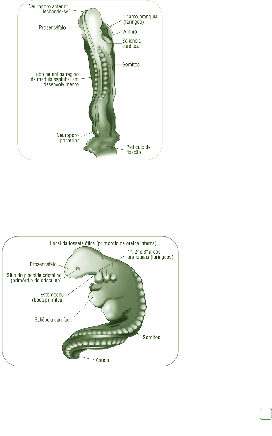 Aula 7 Reprodução Humana 161 Figura 5 – Embrião com cerca de 24 dias. Note que o neuroporo anterior está se fechando, mas o posterior está aberto Fonte: Moore e Persaud (2008). No 26º dia, o neuroporo rostral já está fechado e começam a surgir os brotos dos membros superiores. Os arcos faríngeos (responsáveis pela formação da maior parte da face e pescoço) e as fossetas óticas já são visíveis, como também os placoides cristalinos, indicando os futuros cristalinos dos olhos. Todas essas estruturas podem ser visualizadas na Figura 6. Figura 6 – Embrião com 26 dias. Observe a grande saliência cardíaca, a eminência caudal, o placoide cristalino, a fosseta óptica e os arcos faríngeos Fonte: Moore e Persaud (2008). Aula 7 Reprodução Humana162 Ao fi nal da 4ª semana, os brotos dos membros inferiores já são visíveis e, geralmente, o neuroporo caudal está fechado. Falhas no fechamento dos neuroporos causam distúrbios no Sistema Nervoso Central. Uma característica típica, encontrada próximo ao fi m da 4ª semana, é uma longa eminência caudal (Figuras 7 e 8). Figura 7 – Embrião de 28 dias. Os neuroporos rostral e caudal estão fechados. Note a presença do broto do membro superior Fonte: Moore e Persaud (2008). Figura 8 – Microscopia eletrônica de varredura de um embrião no fi nal da 4ª semana Fonte: Schoenwolf et al (2009). É importante ressaltar que rudimentos de muitos sistemas, especialmente o cardiovascular, já se estabeleceram nessa fase.