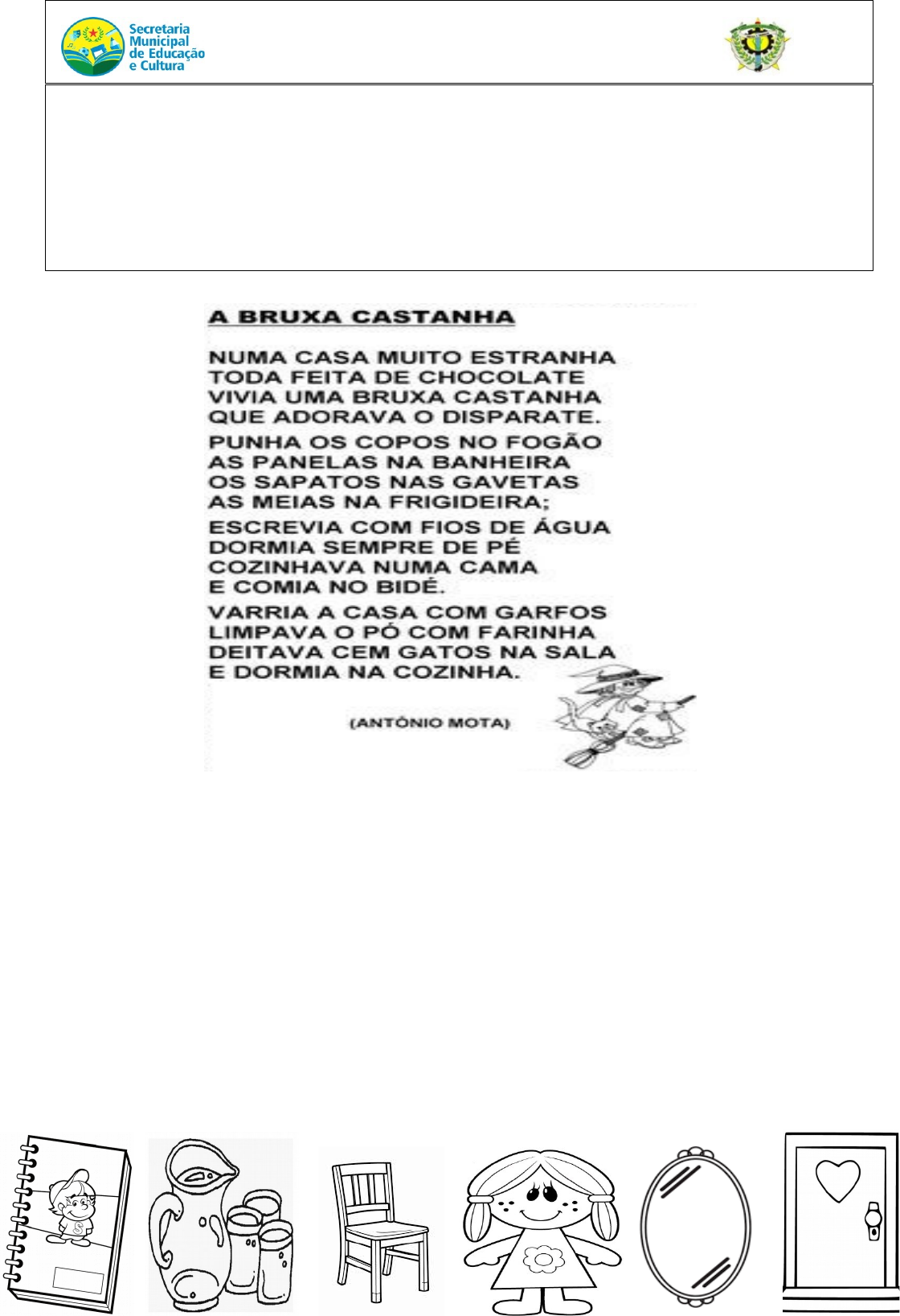 ESTADO DE GOIÁS PREFEITURA MUNICIPAL DE CIDADE OCIDENTAL SECRETARIA MUNICIPAL DE EDUCAÇÃO E CULTURA ESCOLA MUNICIPAL JACILENE APARECIDA DE SOUSA ALUNO(A):_______________________________________________________________________ PROFESSO(A:_____________________________________________________________________ SÉRIE/ANO: ______________DATA: _____/_____/ 2024 PROVA DE CIÊNCIAS 2º ANO 1º BIMESTRE 2 OI AMIGUINHOS, ACABAMOS DE LER A HISTÓRIA DA BRUXA CASTANHA E DEU PARA VER QUE ELA TEM MUITOS OBJETOS EM CASA. LEMBRA QUE NESSE BIMESTRE, ESTUDAMOS SOBRE OS OBJETOS E OS MATERIAIS QUE SÃO FEITOS? ENTÃO AGORA MOSTRE TUDO QUE VOCÊ APRENDEU, RESPONDENDO AS PERGUNTAS A SEGUIR: 1) CIRCULE OS OBJETOS FEITOS DE VIDRO E FAÇA UM X NOS OBJETOS FEITOS DE MADEIRA: 2) LEIA AS PALAVRAS DO QUADRO, DEPOIS ESCREVA CADA UMA NO LOCAL CORRETO. DE QUE MATERIAL É FEITO CADA OBJETO? 3) LIGUE O OBJETO AO NOME DO MATERIAL USADO PARA SUA FABRICAÇÃO: METAL PAPEL PLÁSTICO MADEIRA VIDRO 4) NA ESCOLA, USAMOS VÁRIOS OBJETOS DURANTE A AULA. ESCREVA O NOME DESSE OBJETOS COM BASTANTE ATENÇÃO!!! 5) MARQUE UM X NA RESPOSTA CORRETA: A) QUAL O MATERIAL É USADO PARA FABRICAR O CADERNO? ( ) VIDRO ( ) MADEIRA ( ) PAPEL ( ) METAL B) DE QUE MATERIAL É FEITO O ESPELHO? ( ) PLÁSTICO ( ) VIDRO ( ) BORRACHA ( ) MADEIRA C)DE ONDE É RETIRADO O LÁTEX QUE É USADO PARA A FABRICAÇÃO DA BORRACHA? ( ) DO MAR ( ) DA TERRA ( ) DA ÁRVORE CHAMADA SERINGUEIRA ( ) DA AREIA DURANTE AS NOSSAS AULAS , ESTUDAMOS BASTANTE SOBRE OS CUIDADOS QUE DEVEMOS TER PARA EVITAR OS ACIDENTES DOMÉSTICOS, NÃO É MESMO? MOSTRE O QUE VOCÊ APRENDEU !!! 6) PINTE SOMENTE OS OBJETOS QUE PODEM CAUSAR ACIDENTE! 7) PINTE DE VERDE OS QUADRADINHOS DAS ATIVIDADES QUE NÃO OFERECEM RISCO DE ACIDENTE PARA AS CRIANÇAS E DE VERMELHO AS ATIVIDADES PERIGOSAS! COZINHAR VARRER O CHÃO GUARDAR OS BRINQUEDOS PASSAR ROUPAS ARRUNAR A CAMA BRINCAR COM FOGO 8) MARQUE A RESPOSTA CORRETA: ( ) PODEMOS USAR O FOGÃO SEM A SUPERVISÃO DE UM ADULTO ( ) TENHO QUE GUARDAR TODOS OS BRINQUEDOS NO LUGAR CERTO ( ) POSSO BRINCAR NA PISCINA SEM UM SDULTO POR PERTO ( ) DEVO SEMPRE PEDIR AJUDA PARA MANUSEAR OBJETOS CORTANTES ( ) AS PANELAS DEVEM FICAR COM O CABO PAR FORA DO FOGÃO ( ) O CHÃO MOLHADO PODE PROVOCAR QUEDAS NOS ÚLTIMOS DIAS TEMOS OUVIDO FALAR EM MUITOS CASOS DE DENGUE NO NOSSO PAÍS, SABEMOS QUE A DENGUE É UMA DOENÇA MUITO PERIGOSA E PODE ATÉ MATAR!! MAS SEI QUE VOCÊ APRENDEU COMO SE PROTEGER DESSA DOENÇA NÃO É MESMO!!! AGORA. É COM VOCÊ, 9) CIRCULE O QUE DEVEMOS FAZER PARA COMBATER A DENGUE! 10) VAMOS AJUDAR A TURMINHA A CABAR COM O MOSQUITO, DEIXANDO ESSE DESENHO BEM COLORIDO!! BOA PROVA!! image3.jpeg image4.gif image5.jpeg image6.jpeg image7.jpeg image8.jpeg image9.png image10.jpeg image11.jpeg image12.png image13.png image14.jpeg image15.jpeg image16.png image17.jpeg image18.jpeg image19.png image20.png image21.jpeg image22.jpeg image23.png image24.jpeg image25.jpeg image1.png image2.png image10.png