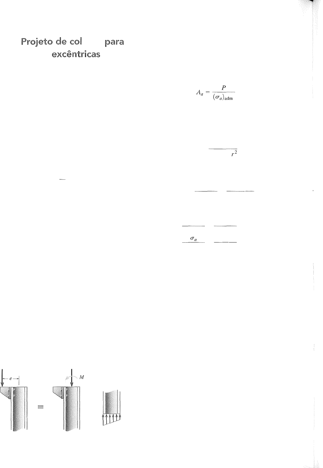 5 1 Q RESISTÊNCIA DOS MATERIAIS *1 3 . 7 cargas unas Às vezes, uma coluna terá de suportar uma carga que age em sua borda ou em uma cantoneira acoplada à sua lateral, como mostra a Figura 13 .31a. O momento fletor M = Pe causado pela carga excêntrica deve ser levado em conta no projeto da coluna. Há várias ma neiras aceitáveis de fazer isso na prática da engenha ria. Discutiremos dois dos métodos mais comuns. Util ização de fórmulas d isponíveis para colunas. A distribuição de tensão que age sobre a área da seção transversal da coluna mostrada na Fi gura 13.31a é determinada pela força axial P e pelo momento fletor M = Pe. Em particular, a tensão de compressão máxima é P Me O'máx = A + J (13.30) Um perfil de tensão comum é mostrado na Figura 13 .31b. Se formos conservadores e considerarmos que toda a seção transversal está sujeita à tensão unifor me O' , como determinada pela Equação 13 .30, então pode:�s comparar O'máx com O'adm' que é determinada pelas fórmulas dadas na Seção 13.6. No cálculo de O' ct normalmente é usado o maior índice de esbeltez par� � coluna, independentemente do eixo em torno do qual ela sofre flexão. Esse requisito é normalmente especi ficado em códigos e manuais de projeto e, na maioria das vezes, resultará em um projeto conservador. Se (J máx :::; (J adm a coluna pode suportar a carga especificada. Se essa desi gualdade não valer, então a área da coluna, A, deverá ser aumentada e novas O' máx e O'actm' calculadas. Esse método de projeto é bastante simples de aplicar e funciona bem para colunas curtas ou de comptimento intermediário. Fórmula da interação. Quando projetamos uma coluna submetida à carga excêntrica, é desejável verificar como as cargas de flexão e axiais interagem, p p = Pe fTmax (a) (b) Figma 13.31 de modo a conseguir equilíbrio entre esses dois efei tos. Para tal, consideraremos as contribuições isoladas dadas à área total da coluna pela força axial e pelo mo mento. Se a tensão admissível para a carga axial for (O' ) ct , então a área exigida para a coluna necessária pa;; ��portar a carga P é De maneira semelhante, se a tensão de flexão ad missível for (0'1)adm' visto que I = Ar2, a área exigida para a coluna necessária para suportar o momento ex cêntrico é determinada pela fórmula da flexão, isto é, Me Af = ----=(O'f)actm r2 A área total A para a coluna necessária para resis tir à carga axial e também ao momento exige que ou P Me A + Af = + < A a (O' a ) adm ( O'f) adm �"2 - P/A McjAr2 + :::; 1 (O' a) adm (O' f) adm __ 0'---"--a- + O'f :::; 1 (O' a)adm (O' f ) adm Nessas expressões (13.31) O' = tensão axial causada pela força P e deter a minada por O' = PI A, onde A é a área da a seção transversal da coluna O'f = tensão de flexão provocada por uma carga excêntrica ou por um momento aplicado M; 0'1 é determinada por O'f = Mel!, onde I é o momento de inércia da área da seção transversal calculado em torno do eixo de flexão ou do eixo neutro (O' ) ct = tensão axial admissível como definida por " a m fórmulas dadas na Seção 13.6 ou por outras especificações encontradas em códigos ou manuais de projeto. Para essa finalidade, use sempre o maior índice de esbeltez para a coluna, independentemente do eixo em torno do qual ela sofre flexão ( 0'1) ct = tensão de flexão admissível como definia m da por especificações encontradas em có digos ou manuais de projeto. Em particular, se a coluna for submetida somente a uma carga axial, a razão referente à tensão de flexão na Equação 13.31 será igual a zero, e o projeto será ba seado somente na tensão axial admissível. Da mesma forma, quando não há nenhuma carga axial presente, a razão referente à tensão axial equivale a zero e o requi sito de tensão se baseará na tensão de flexão admissível. Por consequência, cada razão de tensão indica a contri buição da carga axial ou do momento fletor. Conside rando-se que a Equação 13.31 mostra como essas cargas interagem, às vezes ela é denominada fórmula da in teração. Essa abordagem de projeto exige um procedi mento de tentativa e erro no qual o projetista escolhe uma coluna disponível e, a seguir, verifica se a desigual dade é satisfeita. Em caso negativo, ele escolhe uma se ção maior e repete o processo. Uma escolha económica seria aquela na qual o lado esquerdo está próximo de 1 , porém é menor que ele. O método da interação é frequentemente especi ficado em códigos e manuais de projeto de elementos estruturais feitos de aço, alumínio ou madeira. Em particular, o American Institute of Steel Construction especifica o uso dessa equação somente quando a ra zão à tensão axial for O' !(O' ) ct :::; 0,15. Para outros a a a m valores dessa razão usa-se uma forma modificada da Equação 13 .31 . Os exemplos dados a seguir ilustram os métodos citados para projeto e análise de colunas submetidas a cargas excêntricas. A coluna na Figura 13.32 é feita de liga de alumínio 2014- -T6 e é usada para suportar uma carga excêntrica P. Deter mine o valor de P que pode ser suportado, se a coluna estiver engastada na base e livre no topo. Use a Equação 13.30. Figura 13.32 FLAMBAGEM DE COLUNAS 5 1 1 Por inspeção, a Equação 13.26 deve ser usada. Assim, 378.125 MPa (KL/1/ 378.125 MPa = 4 92 MPa c2n.N ' A tensão de compressão máxima verdadeira na coluna é de terminada pela combinação de carga axial e de flexão. Temos P (Pe)c O'máx = - + -- A I _ __ P __ + _P_(,_2_0_mm----'-)-'--( 4_0_m_m�)� 40 mm(80 mm) (1/12)( 40 mm)(80 mm)3 = 0,00078125? Considerando que essa tensão é uniforme em toda a seção transversal, em vez de apenas no contorno externo, exige-se a adm = u máx; 4,92 = 0,00078125? P = 6.297,6 N = 6,30 kN Resposta A coluna W150 x 30 de aço A-36 na Figura 13.33 está acoplada por pinos nas extremidades e está sujeita à carga excêntrica P. Determine o valor máximo admiss