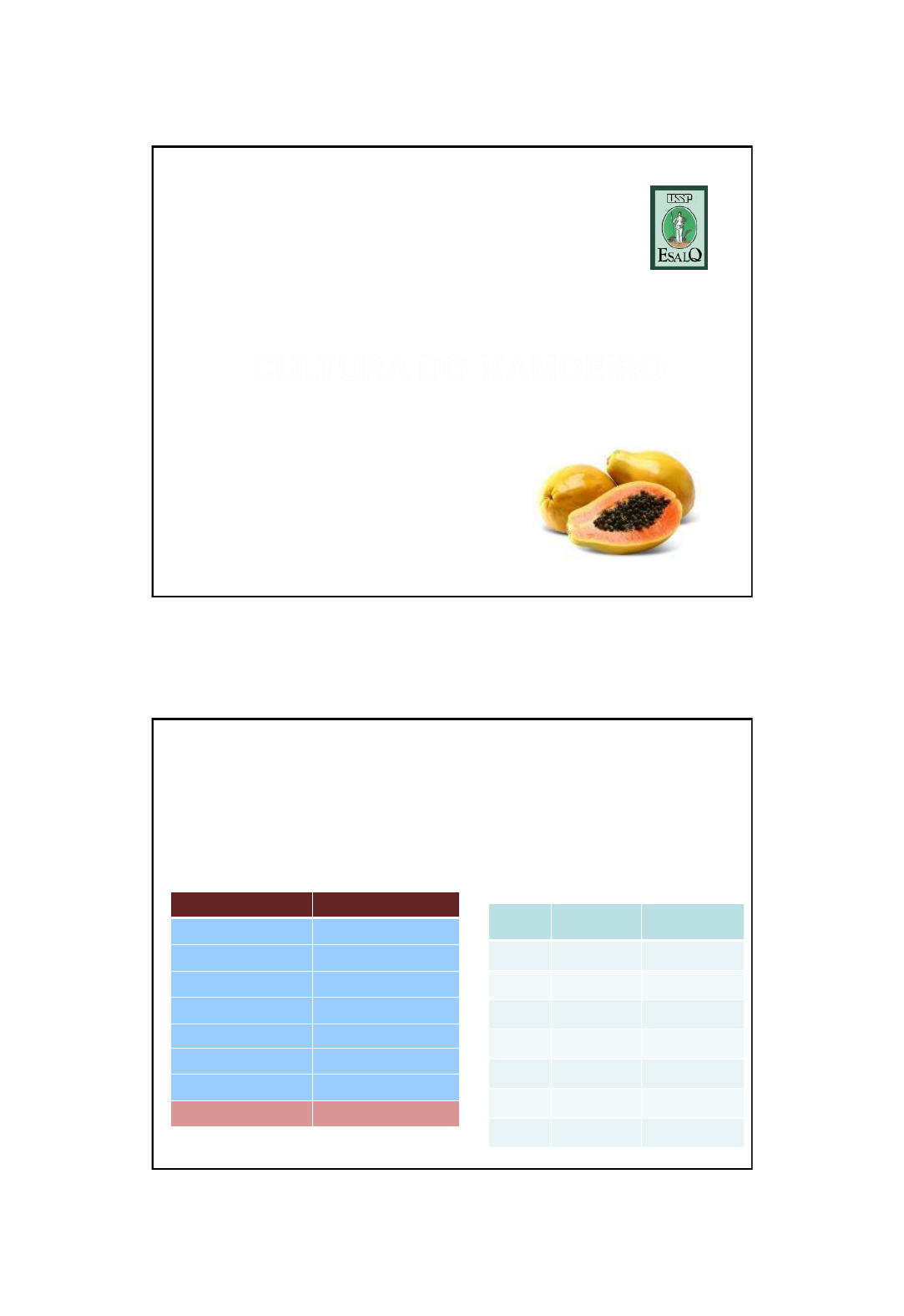 1 CULTURA DO MAMOEIRO Universidade de São Paulo Escola Superior de Agricultura “Luiz de Queiroz” Departamento de Produção Vegetal Prof. Angelo P. Jacomino Fruticultura Tropical e Subtropical Centro de origem: América Dispersão: países tropicais Brasil: 1967 = vírus do mosaico do mamoeiro ou da mancha anelar Usos: fruta, papaína (aplicação industrial: bebidas, alimentos, medicamentos) Estado Produção (t) Participação (%) ES 426.616 38 BA 316.163 28 CE 114.299 10 RN 85.523 7,7 MG 40.342 3,6 PB 26.429 2,4 Total 1.107.761 100 Principais estados brasileiros produtores (2022) País milhões toneladas Índia 5,540 Brasil 1,256 Indonésia 1,168 R. Dominicana 1,156 México 1,134 Nigéria 0,895 Outros (60 países) 2,940 Mundo 14,097 Produção mundial de mamão (2021) FAO http://www.fao.org/faostat/en/#data/QC/visualize (20/out/2023) IBGE https://sidra.ibge.gov.br/ (20/out/2023) 2 PRINCIPAIS DESTINOS DAS EXPORTAÇÕES: México: ~ 100% EUA Guatemala: 70% EUA Malásia: ~ 100% Cingapura Brasil: 70% Europa 5% Am. Latina 5% EUA País mil toneladas México 183 Brasil 50 Guatemala 47 Malásia 19 Principais Países Exportadores (2021) Fonte: FAO, 2023 https://www.papayabrasil.com.br/palestras/Bruno_BRAPEX.pdf Bruno Rosa Pessoti, Papaya Brasil, 2022 https://www.papayabrasil.com.br/palestras/Bruno_BRAPEX.pdf 3 CLASSIFICAÇÃO BOTÂNICA Família Caricaeae Gêneros: Carica (23 espécies) Jaracatia (6 espécies) Jarilla (1 espécie) Cylicomorpha (2 espécies) Espécie: Carica papaya Jaracatia spinosa DESCRIÇÃO DA PLANTA Planta: haste única, até 8 m altura folhas no topo Caule: até 30 cm diâmetro, ereto cicatrizes foliares herbáceo/semi-lenhoso látex suculento Sistema Radicular: raiz pivotante superficial frágil Folhas: 4 DESCRIÇÃO DA PLANTA Caule e Folhas DESCRIÇÃO DA PLANTA Caule e Folhas Folhas: grandes palmatilobadas pecíolo longo 5 DESCRIÇÃO DA PLANTA Caule, Folhas e Flores Mamão grupo Solo DESCRIÇÃO DA PLANTA Fruto e Semente Mamão grupo Formosa Sementes frescas Sementes secas Fruto do tipo Baga unilocular sarcotesta gelatinosa 6 a b c d A B C D A – geralmente uma por folha B- botão fusiforme da flor feminina C- flor aberta D- corte longitudinal de uma flor: a) cálice; b) ovário; c) estilo; d) estigma BIOLOGIA FLORAL DO MAMOEIRO Classificação em até 15 tipos (3 tipos básicos) Flor Feminina Ovário grande 5 estigmas Pedúnculo curto Pétalas livres até a base Flor pentâmera: 5 pétalas 5 sépalas 5 carpelos A- pequenos rácimos axilares. B- flor fechada. C- for aberta. D- corte longitudinal de uma flor: a) estigma; b) antera; c) ovário; d) cálice. BIOLOGIA FLORAL DO MAMOEIRO A B C D a b c d Flor Hermafrodita (perfeita ou elongata) Ovário alongado (flor elongata) 5 estigmas 2 séries de 5 estames 5 carpelos Pétalas parcialmente presas 7 A- em forma de rácimos axilares de longos pedúnculos B- flor fechada. C-flor aberta, gamopétala. D- corte longitudinal de uma flor: a) cálice; b) pistilo rudimentar; c) anteras. BIOLOGIA FLORAL DO MAMOEIRO a b c A B C D Flor Masculina ou Estaminada Não possui ovário Não possui estigma Tubo da corola estreito e longo Pétalas presas 2 séries de 5 estames BIOLOGIA FLORAL DO MAMOEIRO Flor Masculina ou Estaminada 8 Semelhante à flor feminina (externamente) Possui 5 estames presos na parede do ovário Origina frutos com “sulcos” – Fruto Pentândrico BIOLOGIA FLORAL DO MAMOEIRO Flor Hermafrodita Pentândrica carpeloidia ovocarpismo Flores anormais (diversos tipos) 2 a 10 estames 5 a 10 carpelos Fusão de estames com pétalas e/ou ovário (carpeloidia) Frutos deformados BIOLOGIA FLORAL DO MAMOEIRO Flor Hermafrodita “intermediária” 9 BIOLOGIA FLORAL DO MAMOEIRO Flor Hermafrodita “intermediária” Flor Feminina Flor Hermafrodita (perfeita ou elongata) Flor Hermafrodita Pentândrica Flor Masculina ou Estaminada Mamão “redondo” Mamão com “sulcos” Mamão “carpeloide” Mamão “alongado” Não produz frutos PLANTA FLOR GENÓTIPO Ginóicas (feminina) ........... Só feminina ................................ mm Andróicas (masculinas) .... Variável para “hermafrodita” .... M1m Hermafrodita ....................... Variável para “feminina” ..........M2m BIOLOGIA FLORAL DO MAMOEIRO M2 m M2 M2M2 M2m m M2m mm Progênie: 1/3 = feminina 2/3 = hermafrodita 10 GRUPO SOLO Mamão papaya ou Havaí Frutos 0,3 a 0,4 kg, 50 t/ha Precoce (8-9 meses) Boa coloração e sabor Mercado interno e externo • Sunrise solo 72-12 • Baixinho de Santa Amália • Grampola • Golden • Gran-golden • Golden THB • Aliança Rb 0014 GRUPO FORMOSA Híbridos de Sunrise com outras variedades Sementes de alto custo Boa coloração e sabor Frutos com 0,9 a 2kg, mais de 100 t/ha Mercado interno (e externo) •Tainung •Calimosa •Rubi Variedades cultivadas no Brasil CLIMA E SOLO Não tolera geada e ventos fortes Temperatura: 22-33ºC Precipitação: 2.000 mm/ano Altitude (cultivado em regiões a menos de 800 m) Solo areno-argiloso, poroso e profundo, matéria orgânica 11 Colheita dos frutos (hermafroditas) 30 a 40 dias Muda pronta (15 a 20 cm) Transplante Germinação e emergência 10 a 20 dias PRODUÇÃO DE MUDAS Lavar, secar e tratar as sementes com fungicidas 2 a 3 dias Semeadura PRODUÇÃO DE MUDAS 12 SEMEADURA 13 CICLO DE PRODUÇÃO Semeadura Plantio no campo 3 a 4 meses Início Florescimento 2 meses Início Colheita 5 a 6 meses Plantio em linha e em sulco 14 Plantio em covas Irrigação Selecionar uma planta hermafrodita por cova, eliminando as demais com um corte rente ao chão SEXAGEM 15 Grupo Solo 2000 pls/ha 1500 pls/ha ESPAÇAMENTO Grupo Formosa Linhas Simples: 3 x 3 m (1111 pl/ha) Linhas Duplas: 4 x 2,5 x 2,5 m (1250 pl/ha) Exigente em água (crescimento e produção) Consumo de água: até 35 litros / planta / dia (em produção) Sensível ao encharcamento IRRIGAÇÃO 16 NUTRIÇÃO Recomendação de adubação, com base a análise química do solo, do plantio aos 120 dias pós-plantio. Recomendação de a