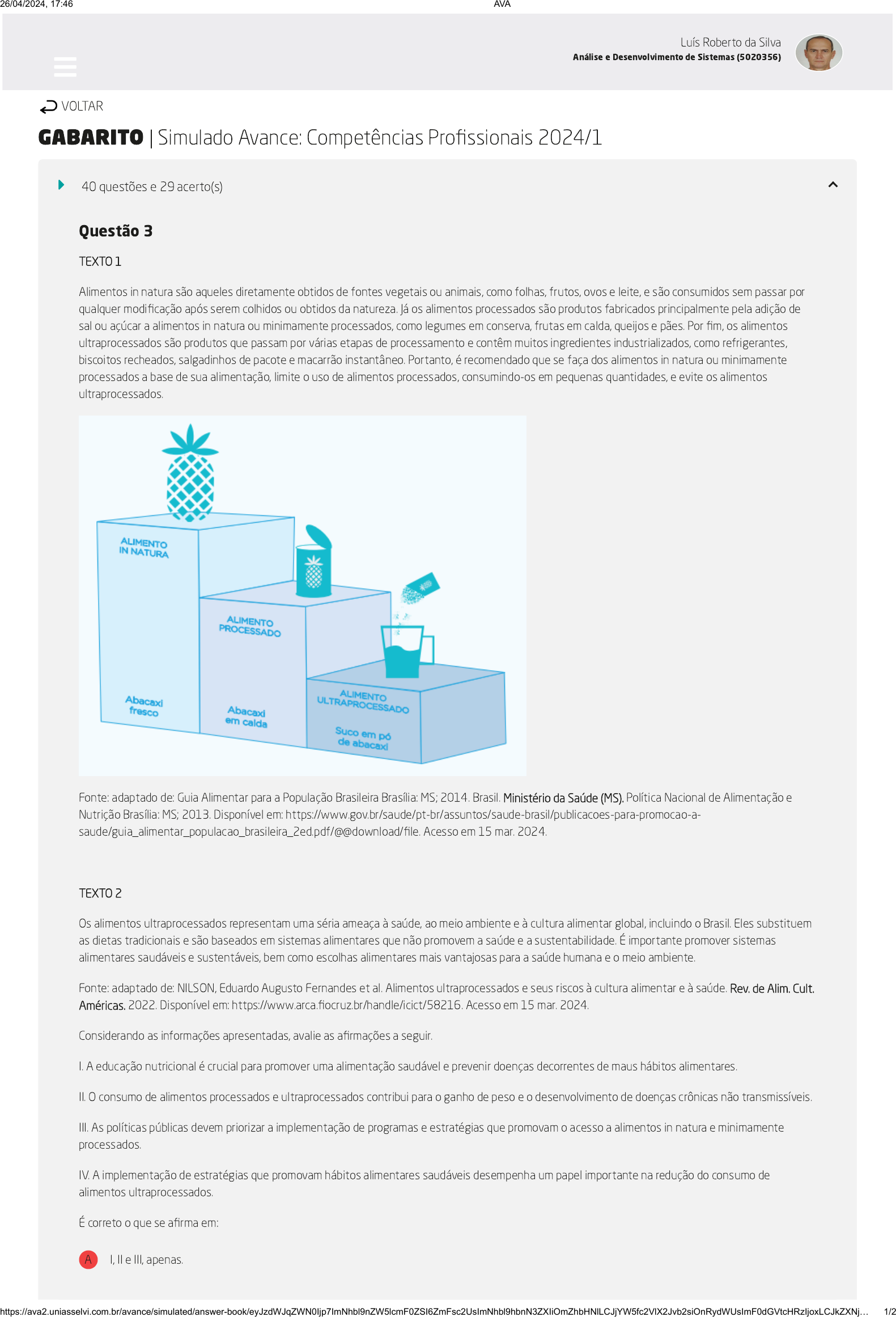 GABARITO | Simulado Avance: Competências Profissionais 2024/1 VOLTAR Questão 3 TEXTO 1 Alimentos in natura são aqueles diretamente obtidos de fontes vegetais ou animais, como folhas, frutos, ovos e leite, e são consumidos sem passar por qualquer modificação após serem colhidos ou obtidos da natureza. Já os alimentos processados são produtos fabricados principalmente pela adição de sal ou açúcar a alimentos in natura ou minimamente processados, como legumes em conserva, frutas em calda, queijos e pães. Por fim, os alimentos ultraprocessados são produtos que passam por várias etapas de processamento e contêm muitos ingredientes industrializados, como refrigerantes, biscoitos recheados, salgadinhos de pacote e macarrão instantâneo. Portanto, é recomendado que se faça dos alimentos in natura ou minimamente processados a base de sua alimentação, limite o uso de alimentos processados, consumindo-os em pequenas quantidades, e evite os alimentos ultraprocessados. Fonte: adaptado de: Guia Alimentar para a População Brasileira Brasília: MS; 2014. Brasil. Ministério da Saúde (MS). Política Nacional de Alimentação e Nutrição Brasília: MS; 2013. Disponível em: https://www.gov.br/saude/pt-br/assuntos/saude-brasil/publicacoes-para-promocao-a- saude/guia_alimentar_populacao_brasileira_2ed.pdf/@@download/file. Acesso em 15 mar. 2024. TEXTO 2 Os alimentos ultraprocessados representam uma séria ameaça à saúde, ao meio ambiente e à cultura alimentar global, incluindo o Brasil. Eles substituem as dietas tradicionais e são baseados em sistemas alimentares que não promovem a saúde e a sustentabilidade. É importante promover sistemas alimentares saudáveis e sustentáveis, bem como escolhas alimentares mais vantajosas para a saúde humana e o meio ambiente. Fonte: adaptado de: NILSON, Eduardo Augusto Fernandes et al. Alimentos ultraprocessados e seus riscos à cultura alimentar e à saúde. Rev. de Alim. Cult. Américas. 2022. Disponível em: https://www.arca.fiocruz.br/handle/icict/58216. Acesso em 15 mar. 2024. Considerando as informações apresentadas, avalie as afirmações a seguir. I. A educação nutricional é crucial para promover uma alimentação saudável e prevenir doenças decorrentes de maus hábitos alimentares. II. O consumo de alimentos processados e ultraprocessados contribui para o ganho de peso e o desenvolvimento de doenças crônicas não transmissíveis. III. As políticas públicas devem priorizar a implementação de programas e estratégias que promovam o acesso a alimentos in natura e minimamente processados. IV. A implementação de estratégias que promovam hábitos alimentares saudáveis desempenha um papel importante na redução do consumo de alimentos ultraprocessados. É correto o que se afirma em: A I, II e III, apenas. 40 questões e 29 acerto(s) Luís Roberto da Silva Análise e Desenvolvimento de Sistemas (5020356) 26/04/2024, 17:46 AVA https://ava2.uniasselvi.com.br/avance/simulated/answer-book/eyJzdWJqZWN0Ijp7ImNhbl9nZW5lcmF0ZSI6ZmFsc2UsImNhbl9hbnN3ZXIiOmZhbHNlLCJjYW5fc2VlX2Jvb2siOnRydWUsImF0dGVtcHRzIjoxLCJkZXNj… 1/2 B II e IV, apenas. C III e IV, apenas. D I, II, III e IV. E I, apenas. Anterior Próxima Luís Roberto da Silva Análise e Desenvolvimento de Sistemas (5020356) 26/04/2024, 17:46 AVA https://ava2.uniasselvi.com.br/avance/simulated/answer-book/eyJzdWJqZWN0Ijp7ImNhbl9nZW5lcmF0ZSI6ZmFsc2UsImNhbl9hbnN3ZXIiOmZhbHNlLCJjYW5fc2VlX2Jvb2siOnRydWUsImF0dGVtcHRzIjoxLCJkZXNj… 2/2