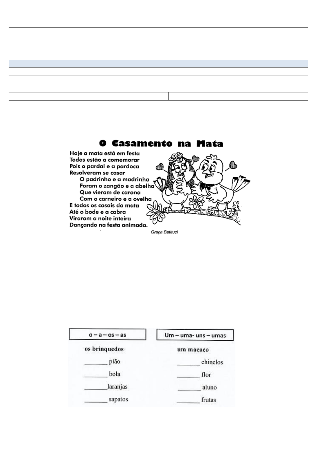 Atividade de Lingua Portuguesa Diretora: Ir. Patrícia Silva. Professor (a): Aluno (a): Série/Turma: Data: / / 2024. 1) Identifique os substantivos no texto e pinte de AZUL os substantivos femininos e de VERMELHO os substantivos masculinos. 2) Observe as frases a seguir e CIRCULE os substantivos: a) Hoje a mata está em festa. b) A régua mede 30 cm. c) Joana ganhou um notebook. d) Fernanda comeu frango assado no almoço. 3) Veja os exemplos e complete: image1.png image2.jpeg