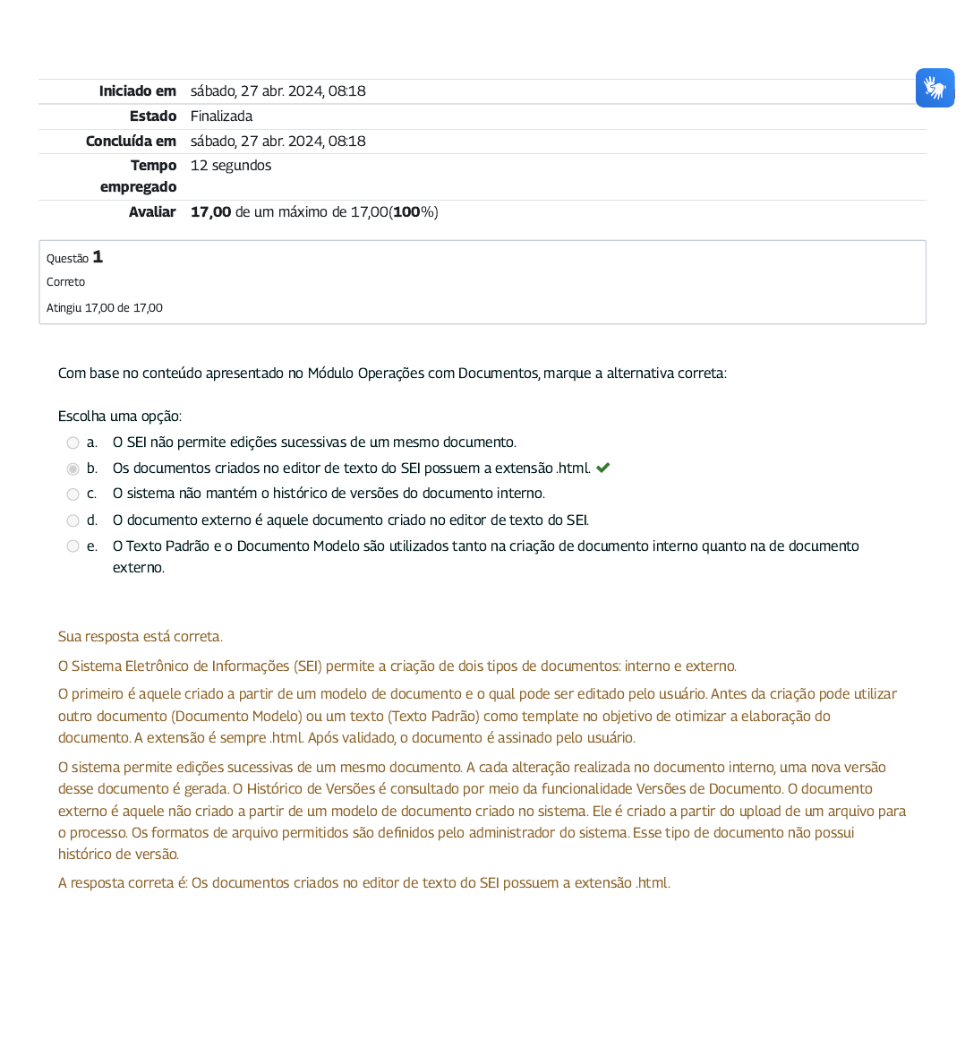 Iniciado em sábado, 27 abr. 2024, 08:18 Estado Finalizada Concluída em sábado, 27 abr. 2024, 08:18 Tempo empregado 12 segundos Avaliar 17,00 de um máximo de 17,00(100%) Questão 1 Correto Atingiu 17,00 de 17,00 Com base no conteúdo apresentado no Módulo Operações com Documentos, marque a alternativa correta: Escolha uma opção: a. O SEI não permite edições sucessivas de um mesmo documento. b. Os documentos criados no editor de texto do SEI possuem a extensão .html. c. O sistema não mantém o histórico de versões do documento interno. d. O documento externo é aquele documento criado no editor de texto do SEI. e. O Texto Padrão e o Documento Modelo são utilizados tanto na criação de documento interno quanto na de documento externo. Sua resposta está correta. O Sistema Eletrônico de Informações (SEI) permite a criação de dois tipos de documentos: interno e externo. O primeiro é aquele criado a partir de um modelo de documento e o qual pode ser editado pelo usuário. Antes da criação pode utilizar outro documento (Documento Modelo) ou um texto (Texto Padrão) como template no objetivo de otimizar a elaboração do documento. A extensão é sempre .html. Após validado, o documento é assinado pelo usuário. O sistema permite edições sucessivas de um mesmo documento. A cada alteração realizada no documento interno, uma nova versão desse documento é gerada. O Histórico de Versões é consultado por meio da funcionalidade Versões de Documento. O documento externo é aquele não criado a partir de um modelo de documento criado no sistema. Ele é criado a partir do upload de um arquivo para o processo. Os formatos de arquivo permitidos são de�nidos pelo administrador do sistema. Esse tipo de documento não possui histórico de versão. A resposta correta é: Os documentos criados no editor de texto do SEI possuem a extensão .html.