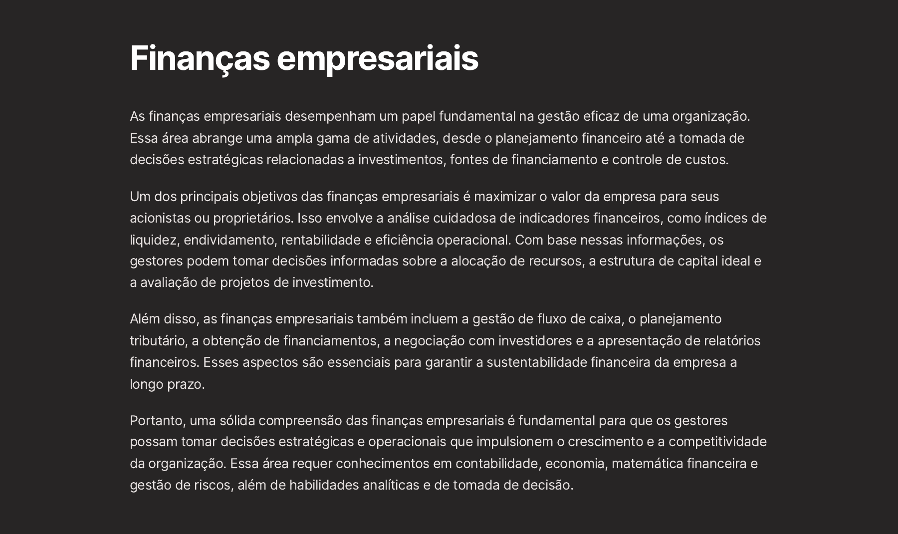 Finanças empresariais As finanças empresariais desempenham um papel fundamental na gestão eficaz de uma organização. Essa área abrange uma ampla gama de atividades, desde o planejamento financeiro até a tomada de decisões estratégicas relacionadas a investimentos, fontes de financiamento e controle de custos. Um dos principais objetivos das finanças empresariais é maximizar o valor da empresa para seus acionistas ou proprietários. Isso envolve a análise cuidadosa de indicadores financeiros, como índices de liquidez, endividamento, rentabilidade e eficiência operacional. Com base nessas informações, os gestores podem tomar decisões informadas sobre a alocação de recursos, a estrutura de capital ideal e a avaliação de projetos de investimento. Além disso, as finanças empresariais também incluem a gestão de fluxo de caixa, o planejamento tributário, a obtenção de financiamentos, a negociação com investidores e a apresentação de relatórios financeiros. Esses aspectos são essenciais para garantir a sustentabilidade financeira da empresa a longo prazo. Portanto, uma sólida compreensão das finanças empresariais é fundamental para que os gestores possam tomar decisões estratégicas e operacionais que impulsionem o crescimento e a competitividade da organização. Essa área requer conhecimentos em contabilidade, economia, matemática financeira e gestão de riscos, além de habilidades analíticas e de tomada de decisão. Marketing e Vendas O marketing e as vendas são áreas fundamentais para o sucesso de qualquer empresa. O marketing é responsável por entender as necessidades e desejos dos clientes, desenvolver estratégias de comunicação e promoção, e criar uma imagem positiva da marca. Já as vendas têm o papel crucial de converter oportunidades em negócios efetivos, por meio de um atendimento personalizado e da construção de relacionamentos duradouros com os clientes. Uma sólida estratégia de marketing começa com a pesquisa de mercado, análise da concorrência e segmentação do público-alvo. Com base nisso, é possível definir os melhores canais de comunicação, desenvolver campanhas persuasivas e atrativas, e posicionar a marca de forma única no mercado. Isso envolve desde a criação de uma identidade visual atraente até a presença ativa em mídias sociais e eventos. Já a área de vendas requer habilidades interpessoais, capacidade de negociação e conhecimento profundo dos produtos e serviços oferecidos. Os vendedores precisam entender as necessidades dos clientes, apresentar soluções personalizadas, lidar com objeções e fechrar negócios de maneira ética e transparente. Ferramentas como CRM (Gestão de Relacionamento com o Cliente) e técnicas de prospecção têm se tornado cada vez mais importantes nesse contexto. Definir uma estratégia de marketing abrangente, considerando os 4 Ps (Produto, Preço, Promoção e Praça) 1. Criar uma identidade de marca forte e memorável, que transmita os valores e diferenciais da empresa 2. Investir em canais de venda eficientes, como e-commerce, representantes comerciais e parcerias estratégicas 3. Capacitar a equipe de vendas, proporcionando treinamento contínuo em técnicas de negociação e atendimento ao cliente 4. Utilizar métricas e indicadores para monitorar o desempenho das ações de marketing e vendas5. Manter-se atualizado sobre as tendências do mercado e as necessidades em constante evolução dos clientes 6.