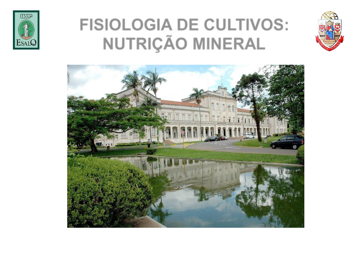FISIOLOGIA DE CULTIVOS: NUTRIÇÃO MINERAL Paulo Roberto de Camargo e Castro Professor Titular - ESALQ/USP CICLO DO NITROGÊNIO CICLO DO FÓSFORO CICLO DO POTÁSSIO CICLO DO ENXOFRE NÍVEIS DE NUTRIENTES NO TECIDO FUNÇÃO BIOQUÍMICA DOS NUTRIENTES SISTEMAS HIDROPÔNICOS RELAÇÃO ENTRE PRODUTIVIDADE E DISPONIBILIDADE DE NUTRIENTES Pouco Móveis MOBILIDADE E TENDÊNCIA DE TRANSLOCAÇÃO DE NUTRIENTES pH DO SOLO E DISPONIBILIDADE DE NUTRIENTES NUTRIÇÃO MINERAL TROCA CATIÔNICA NUMA PARTÍCULA DE SOLO SISTEMA RADICULAR DE TRIGO EM SOLO SECO E IRRIGADO SEÇÃO LONGITUDINAL DO ÁPICE DA RAIZ TEORES DE NUTRIENTES E DESENVOLVIMENTO RADICULAR RAÍZ INFECTADA COM FUNGOS MICORRÍZICOS ECTOTRÓFICOS ABSORÇÃO DIFERENCIADA ASSOCIAÇÃO ENTRE FUNGOS MICORRÍZICOS VESÍCULO-ARBUSCULARES EM RAÍZ DIFUSÃO PROCESSOS DE TRANSPORTE E CONCENTRAÇÃO IÔNICA NO CITOSOL E VACÚOLO TRANSPORTE PASSIVO E ATIVO NA MEMBRANA MODELO PARA TRANSPORTE ATIVO SECUNDÁRIO PROCESSOS DE TRANSPORTE NA MEMBRANA PLASMÁTICA E NO TONOPLASTO POTENCIAIS ELETROQUÍMICOS TRANSPIRAÇÃO HIDATÓDIO Absorção e Perda de Água pelas Plantas Transporte Intercelular (Aquaporinas) Absorção Passiva Absorção Osmótica (∆ψ) Água disponível no solo Xilema Transpiração – vapor (estômatos) Gutação – líquida (hidatódios) (Herbáceas e arbustivas) DIA NOITE OBRIGADO prcastro@usp.br