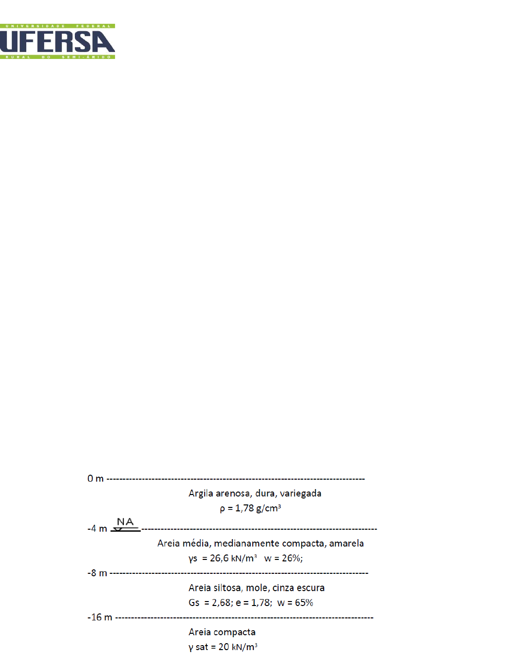 Lista de exercícios 1 - Unidade III Conteúdo: Tensões geostáticas Universidade Federal Rural do Semi-Árido Departamento de Engenharia – Campus Angicos Curso: Interdisciplinar em Ciência e Tecnologia Disciplina: AEN2283 – Mecânica dos Solos I | Sem.: 2023.1 Docente: Thâmara Dayane Batista Alves Nome:_________________________________________________Matrícula:___________ Lista de exercícios 1 – Unidade III Conteúdo: Tensões geostáticas 1) O que são: tensão total, tensão neutra e tensão? 2) Analise a expressão σ’ = σ – u. 3) Como se calcula a tensão neutra (a) no caso hidrostático; (b) no caso dinâmico (adensamento); e (c) no caso de fluxo permanente (redes de fluxo)? 4) A variação do nível d’água de um lago (desde que ele não seque) tem influência sobre a tensão efetiva no solo do fundo do lago? Explique. 5) Calcular as tensões totais, efetivas e neutras devido a peso próprio que atuam nas várias camadas do perfil abaixo. Fazer os diagramas dessas tensões com a profundidade. a) Considere o efeito da capilaridade. b) Desconsidere a capilaridade. c) Compare e discuta os resultados. d) Desconsiderar a capilaridade nos cálculos de tensões está a favor ou contra a segurança? Explique. Lista de exercícios 1 - Unidade III Conteúdo: Tensões geostáticas Universidade Federal Rural do Semi-Árido Departamento de Engenharia – Campus Angicos Curso: Interdisciplinar em Ciência e Tecnologia Disciplina: AEN2283 – Mecânica dos Solos I | Sem.: 2023.1 Docente: Thâmara Dayane Batista Alves 6) Traçar os diagramas de σ, σ’ e u para o perfil seguinte: 7) Após rebaixar o N. A. para a cota – 5 m e remoção da argila orgânica, foi lançado sobre o solo do exercício anterior um aterro de extensão infinita até a cota + 4 m. Calcular Para o aterro, γ = 18 kN/m³. Calcular as tensões totais, efetivas e neutras devido a peso próprio que atuam nas várias camadas do perfil. Fazer os diagramas dessas tensões com a profundidade. 8) Calcular as tensões totais, efetivas e neutras devido a peso próprio que atuam nas várias camadas do perfil abaixo e fazer os diagramas dessas tensões com a profundidade, após a realização de um rebaixamento do NA para a cota – 3 m, concomitantemente com o lançamento de um aterro (γ = 16 kN/m³ e w = 18,2%) até a cota + 5 m. Bom desempenho!