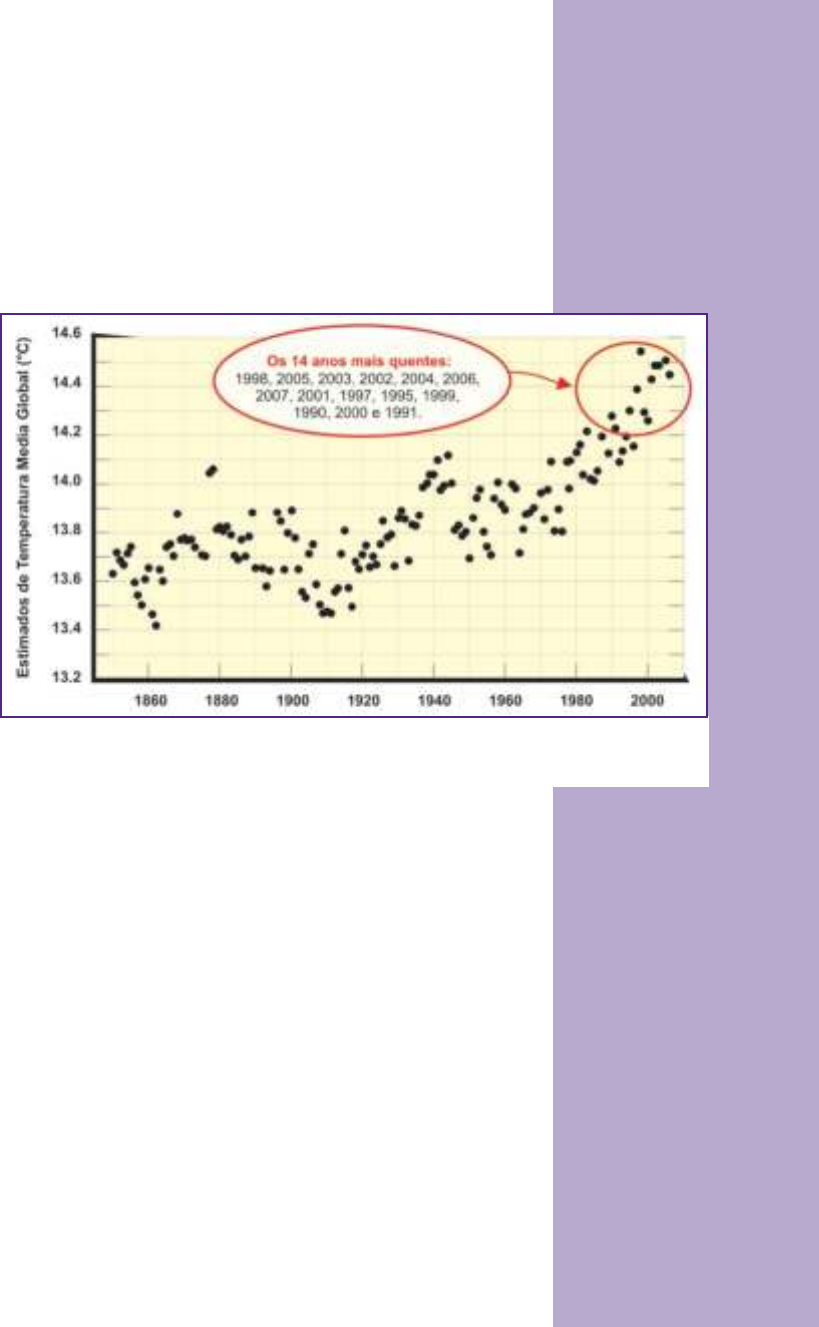 199 a ocorrência dos anos mais quentes se deu após esse pe- ríodo. O aquecimento médio da temperatura do planeta é inequívoco, como evidenciam as observações dos aumen- tos das temperaturas médias globais do ar e do oceano, do derretimento generalizado da neve e do gelo, bem como da elevação do nível médio do mar. Constatações do século 20 O aquecimento da superfície ocorrido no século 20 foi de 0,6°C, com desvio para mais ou para menos de 0,2°C. Esse foi o maior nível de aquecimento registrado, em relação à média, nos últimos mil anos. Em todo o mundo diversas constatações indicam que o cli- ma está mudando. Dentre elas destacam-se: Temperatura Entre 1906 e 2005, o aumento da temperatura média global foi de 0,74°C. Figura 5.3. A temperatura na Terra variou, em média, 0,4°C, desde 1990. Também se constatou que a temperatura vem aumentando desde o período industrial, conforme se vê na representação acima. Nota-se que os 14 anos mais quentes foram registrados a partir de 1990. F o u rt h a ss es sm en t R ep o rt ( a R 4 ), d o G ru p o d e T ra b al h o I – T h e P h ys ic a l S ci en ce B a si s. ( fi g u ra S M 3 , p p . 1 7 ).