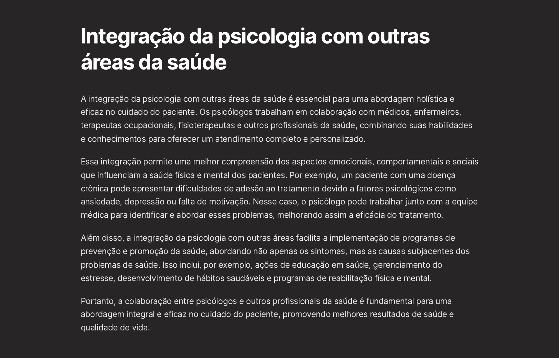 Integração da psicologia com outras áreas da saúde A integração da psicologia com outras áreas da saúde é essencial para uma abordagem holística e eficaz no cuidado do paciente. Os psicólogos trabalham em colaboração com médicos, enfermeiros, terapeutas ocupacionais, fisioterapeutas e outros profissionais da saúde, combinando suas habilidades e conhecimentos para oferecer um atendimento completo e personalizado. Essa integração permite uma melhor compreensão dos aspectos emocionais, comportamentais e sociais que influenciam a saúde física e mental dos pacientes. Por exemplo, um paciente com uma doença crônica pode apresentar dificuldades de adesão ao tratamento devido a fatores psicológicos como ansiedade, depressão ou falta de motivação. Nesse caso, o psicólogo pode trabalhar junto com a equipe médica para identificar e abordar esses problemas, melhorando assim a eficácia do tratamento. Além disso, a integração da psicologia com outras áreas facilita a implementação de programas de prevenção e promoção da saúde, abordando não apenas os sintomas, mas as causas subjacentes dos problemas de saúde. Isso inclui, por exemplo, ações de educação em saúde, gerenciamento do estresse, desenvolvimento de hábitos saudáveis e programas de reabilitação física e mental. Portanto, a colaboração entre psicólogos e outros profissionais da saúde é fundamental para uma abordagem integral e eficaz no cuidado do paciente, promovendo melhores resultados de saúde e qualidade de vida. Educação permanente e capacitação de profissionais A educação permanente e a capacitação de profissionais são fundamentais para o desenvolvimento contínuo da psicologia no Sistema Único de Saúde (SUS). Essa formação continuada visa aprimorar as habilidades e conhecimentos dos psicólogos, permitindo que eles estejam sempre atualizados e preparados para lidar com os desafios em constante evolução do sistema de saúde público. Através de programas de educação permanente, os psicólogos do SUS têm a oportunidade de participar de treinamentos, workshops, cursos de especialização e congressos, ampliando suas competências técnicas e aprimorando suas abordagens terapêuticas. Essa formação continuada também favorece a troca de experiências entre profissionais de diferentes regiões e níveis de atenção, fortalecendo a integração da psicologia com outras áreas da saúde. Além disso, a capacitação de profissionais é essencial para garantir que a psicologia esteja alinhada com as diretrizes e políticas do SUS, tais como a Política Nacional de Saúde Mental e a Política Nacional de Humanização. Essa qualificação contínua permite que os psicólogos compreendam melhor o funcionamento do sistema de saúde, aprimorem suas práticas de acordo com os princípios da universalidade, integralidade e equidade, e contribuam de maneira mais efetiva para a promoção da saúde e o cuidado integral dos usuários. Investir na educação permanente e na capacitação dos profissionais de psicologia no SUS é, portanto, uma estratégia fundamental para fortalecer essa importante área da saúde pública, garantindo que os serviços prestados sejam de alta qualidade e estejam alinhados com as necessidades da população.