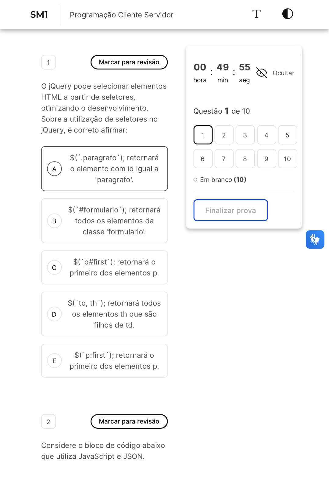 A B C D E 1 Marcar para revisão O jQuery pode selecionar elementos HTML a partir de seletores, otimizando o desenvolvimento. Sobre a utilização de seletores no jQuery, é correto afirmar: $�´.paragrafo´); retornará o elemento com id igual a 'paragrafo'. $�´#formulario´); retornará todos os elementos da classe 'formulario'. $�´p#first´); retornará o primeiro dos elementos p. $�´td, th´); retornará todos os elementos th que são filhos de td. $�´p:first´); retornará o primeiro dos elementos p. 2 Marcar para revisão Considere o bloco de código abaixo que utiliza JavaScript e JSON. 00 hora : 49 min : 55 seg Ocultar Questão 1 de 10 Em branco �10� Finalizar prova 1 2 3 4 5 6 7 8 9 10 SM1 Programação Cliente Servidor A B C D E Para que o bloco de código exiba 0146 vermelha, a lacuna I deve ser corretamente preenchida por: x.trens[2].trem + " " + x.trens[2].linha text.trens[trem] + " " + text.trens[linha] text.trens[1].trem + " " + text.trens[1].linha x.trens[1].trem + " " + x.trens[1].linha x.trens[trem] + " " + x.trens[linha] 3 Marcar para revisão �Quadrix/2022 � Adaptada) Trata-se de uma metalinguagem extensível e independente de plataforma que surgiu para facilitar a troca de informação na Web. Tornou-se um padrão muito difundido e utilizado nas mais diversas áreas, suportado por uma quantidade variada de A B C D E A B aplicações, ferramentas, parsers, browsers, SGBD, entre outros. Assinale a alternativa que apresenta o padrão descrito acima. XSLT UDDI XML WSDL Python 4 Marcar para revisão �FGV/2022� O JavaScript Object Notation �JSON� é um formato de intercâmbio de dados baseado em texto. De acordo com a gramática JSON, especificada na RFC 8259, é correto afirmar que: um número é representado na base 16 usando símbolos alfanuméricos. uma string começa e termina com crases. C D E um objeto é representado como um par de parênteses em torno de zero ou mais pares nome/valor. nomes literais devem ser utilizados em caixa alta. um array é representado como colchetes em torno de zero ou mais elementos. 5 Marcar para revisão O padrão Front Controller é muito utilizado no ambiente Java Web, definindo a centralização das chamadas HTTP e o direcionamento do fluxo de execução do sistema para a visualização correta. Qual das opções descreve corretamente os passos para implementar o processamento das requisições de acordo com o padrão descrito? A B C A requisição é recebida na página JSP, onde são feitas as chamadas necessárias para os métodos de negócio, e no final temos um comando sendRedirect para efetuar o redirecionamento para o Servlet. A requisição é recebida no Servlet, onde são feitas conversões e chamadas para métodos de negócio, e no final um RequestDispatcher redireciona o fluxo para a página JSP. A requisição é recebida no Servlet e redirecionada para a página JSP correta, com o uso de um RequestDispatcher, sendo feitas as conversões e chamadas para métodos de negócio ao nível da página JSP. D E A requisição é recebida na página JSP, seguida de um redirecionamento para o Servlet através de um comando sendRedirect, onde é construída a resposta, e todas as chamadas a métodos de negócios ocorrem no navegador do usuário. A requisição é recebida no Servlet e redirecionada para a página JSP correta, com o uso de sendRedirect, sendo feitas as conversões e chamadas para métodos de negócio ao nível da página JSP. 6 Marcar para revisão Uma página JSP permite gerar conteúdo dinâmico através de um conjunto específico de artefatos, os quais são reconhecidos pelo contêiner Web para geração do Servlet equivalente. Entre os artefatos, um deles permite a identificação do tipo de conteúdo, importação de bibliotecas e definir a página de erro entre outras configurações possíveis. Qual dos artefatos está sendo descrito acima? A B C D E A B Scriptlet Diretiva Etiqueta XML Etiqueta de Substituição Etiqueta HTML 7 Marcar para revisão Ao trabalhar com um aplicativo corporativo, segundo a arquitetura MVC, as camadas Model e Controller são definidas ao nível do projeto interno com o terminador "ejb", e o NetBeans oferece ferramentas de automatização para a geração dos componentes necessários, com utilização de duas tecnologias específicas. Quais são as tecnologias utilizadas para as duas camadas citadas, respectivamente? JSP e Servlet Servlet e JPA C D E JPA e JSP EJB e Servlet JPA e EJB 8 Marcar para revisão Ao contrário da palavra- chave "var", a palavra- chave "let", tem como função restringir o acesso a variáveis dentro de um bloco. Neste sentido, o que acontece quando executamos o código abaixo em um navegador com suporte a ECMAScript versão ES6 ou superior? A B C D E A declaração da variável teste utilizando let funcionaria da mesma forma se utilizássemos var. A instrução let introduz um escopo de bloco a variável teste. Será exibido dentro da janela navegador o valor 1. Será exibido no console do navegador o valor 1. O valor da variável teste será sempre 200. 9 Marcar para revisão Numa discussão entre os programadores sobre os conceitos de AJAX (Asynchronous Javascript and XML�, as seguintes afirmações foram feitas: ( ) permite atualizar dinamicamente o conteúdo, ou partes, de uma página web. ( ) embora usado no nome, a utilização da linguagem XML não é obrigatória. ( ) a XMLHttpRequest(XHR) é utilizada para enviar requisições pelo script para o lado client. A B C D E Dê valores Verdadeiro �V� ou Falso �F� em cada afirmação e identifique a alternativa que apresenta a sequência correta (de cima para baixo): V � V � F V � V � V F � F � V F � F � F V � F � V 10 Marcar para revisão Quando lidamos com SQL, temos comandos denominados DML, ou linguagem de manipulação de dados, como INSERT, UPDATE e DELETE, voltados para a manutenção dos dados presentes na tabela, e efetuamos consultas at