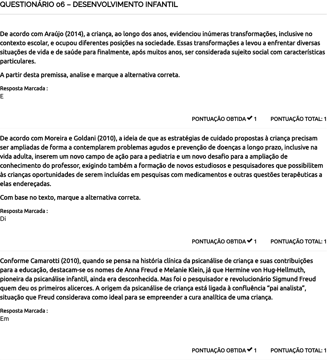 QUESTIONÁRIO 06 – DESENVOLVIMENTO INFANTIL PONTUAÇÃO TOTAL: 1PONTUAÇÃO OBTIDA 1 De acordo com Araújo (2014), a criança, ao longo dos anos, evidenciou inúmeras transformações, inclusive no contexto escolar, e ocupou diferentes posições na sociedade. Essas transformações a levou a enfrentar diversas situações de vida e de saúde para �nalmente, após muitos anos, ser considerada sujeito social com características particulares. A partir desta premissa, analise e marque a alternativa correta. Resposta Marcada : Entre 1930 e 1940, iniciaram-se os programas de proteção à maternidade, à infância e à adolescência, todos submetidos às propostas do Departamento Nacional da Criança (DNCr). PONTUAÇÃO TOTAL: 1PONTUAÇÃO OBTIDA 1 De acordo com Moreira e Goldani (2010), a ideia de que as estratégias de cuidado propostas à criança precisam ser ampliadas de forma a contemplarem problemas agudos e prevenção de doenças a longo prazo, inclusive na vida adulta, inserem um novo campo de ação para a pediatria e um novo desa�o para a ampliação de conhecimento do professor, exigindo também a formação de novos estudiosos e pesquisadores que possibilitem às crianças oportunidades de serem incluídas em pesquisas com medicamentos e outras questões terapêuticas a elas endereçadas. Com base no texto, marque a alternativa correta. Resposta Marcada : Diversas e diferentes medicações utilizadas na prática clínica pediátrica não possuem evidências su�cientes sobre dosagens, segurança e e�cácia para cada período do desenvolvimento. PONTUAÇÃO TOTAL: 1PONTUAÇÃO OBTIDA 1 Conforme Camarotti (2010), quando se pensa na história clínica da psicanálise de criança e suas contribuições para a educação, destacam-se os nomes de Anna Freud e Melanie Klein, já que Hermine von Hug-Hellmuth, pioneira da psicanálise infantil, ainda era desconhecida. Mas foi o pesquisador e revolucionário Sigmund Freud quem deu os primeiros alicerces. A origem da psicanálise de criança está ligada à con�uência “pai analista”, situação que Freud considerava como ideal para se empreender a cura analítica de uma criança. Resposta Marcada : Em 1909, com a “Análise de uma fobia em um menino de cinco anos”, Freud lançou o primeiro modelo de análise infantil e provocou agitação e indignação na época, sendo a psicanálise acusada de roubar a inocência dessa criança. 5 / 5 PONTUAÇÃO TOTAL: 1PONTUAÇÃO OBTIDA 1 O atendimento clínico infantil está em uma crescente desde o seu surgimento e deve ocorrer em um espaço de acolhimento e escuta acerca das demandas emocionais apresentadas por uma criança. É um grande desa�o, pois através de materiais lúdicos como brinquedos, livros e jogos é que vai surgindo a oportunidade de acessar o mundo da criança e sua singularidade, podendo assim auxiliá-la de forma gradativa e cuidadosa em seu processo terapêutico e de desenvolvimento. O papel dos pais é de extrema importância para a evolução adequada do processo, exigindo-se deles postura ativa e comunicativa. O texto se refere a qual atendimento clínico? Marque a alternativa correta. Resposta Marcada : Atendimento clínico de Psicoterapia Infantil. PONTUAÇÃO TOTAL: 1PONTUAÇÃO OBTIDA 1 A evolução histórica da participação da criança na sociedade, bem como do atendimento clínico infantil e os cuidados à saúde voltados a esta população, apresentou avanços, tendo como re�exo a redução da mortalidade infantil e implantação de diversas políticas públicas de saúde. Entretanto, como este fato é recente historicamente, muitas ações ainda precisam ser pontuadas, discutidas em profundidade, reorganizadas e pactuadas para que estes avanços possam realmente re�etir as reais necessidades da população infantil. Com base no texto, analise e marque a alternativa correta. Resposta Marcada : A assistência à saúde da criança e o atendimento clínico infantil ainda se encontram em processo de construção, assim como a assistência à saúde em geral. Total de Pontos