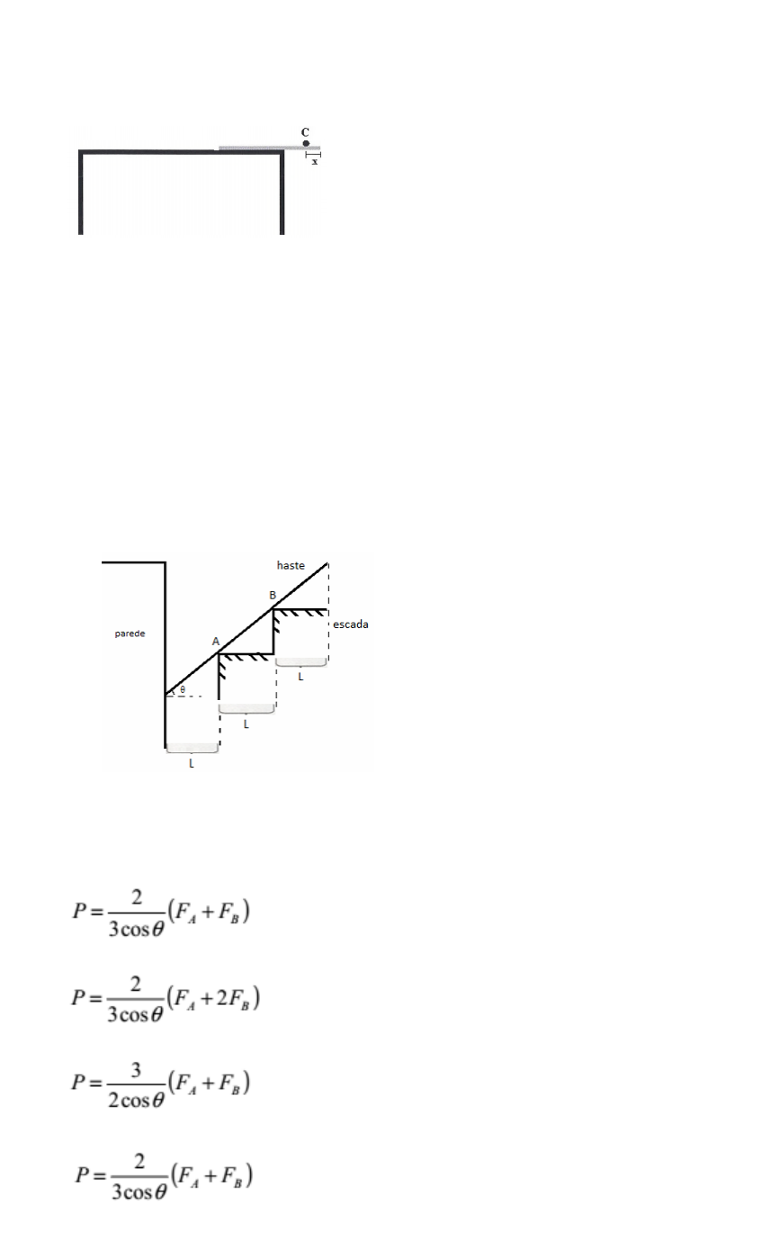 01)(EFOMM) Uma régua escolar de massa M uniformemente distribuída com o comprimento de 30 cm está apoiada na borda de uma mesa, com 2/3 da régua sobre a mesa. Um aluno decide colocar um corpo C de massa 2M sobre a régua, em um ponto da régua que está suspenso (conforme a figura). Qual é a distância mínima x, em cm, da borda livre da régua a que deve ser colocado o corpo, para que o sistema permaneça em equilíbrio? a) 1,25 b) 2,50 c) 5,00 d) 7,50 e) 10,0 02) (EFOMM) Uma haste homogênea de peso P repousa em equilíbrio, apoiada em uma parede e nos degraus de uma escada, conforme ilustra a figura abaixo. A haste forma um ângulo θ com a reta perpendicular à parede. A distância entre a escada e a parede é L. A haste toca a escada nos pontos A e B da figura. Utilizando as informações contidas na figura acima, determine o peso P da haste, admitindo que FA é a força que a escada faz na haste no ponto A e FB é a força que a escada faz na haste no ponto B. a) b) c) d) e) 03) Considere o sistema em equilíbrio da figura dada: Os fios são ideais e o peso do bloco P é de 50 N. Sabendo-se que a constante da mola K vale 5,0 x 103 N/m, determina-se que a mola está alongada de: a) 0,05 cm. b) 0,10 cm. c) 0,50 cm. d) 0,87 cm. e) 1,00 cm. 04) (EFOMM) Na figura dada, inicialmente uma pessoa equilibra um bloco de 80 kg em uma tábua de 4 m apoiada no meio. Tanto a pessoa quanto o bloco estão localizados nas extremidades da tábua. Assinale a alternativa que indica de modo correto, respectivamente, o peso da pessoa e a distância a que a pessoa deve ficar do centro para manter o equilíbrio, caso o bloco seja trocado por outro de 36 kg. Considere g = 10 m/s2. a) 800 N, 90 cm. b) 400 N, 90 cm. c) 800 N, 50 cm. d) 800 N, 100 cm. e) 360 N, 90 cm. 05) (EFOMM) Uma viga metálica uniforme de massa 50 Kg e 8,0 m de comprimento repousa sobre dois apoios nos pontos B e C. Duas forças verticais estão aplicadas nas extremidades A e D da viga: a força de módulo 20 N para baixo e a força de módulo 30N, para cima, de acordo com a figura. Se a viga se encontra em equilíbrio estável, o módulo, em newtons, da reação no apoio B vale Dado: g = 10 m/s2 . a) 795 b) 685 c) 295 d) 275 e) 195 RESOLUÇÕES: 01)ALTERNATIVA D Fazer o equilíbrio dos momentos na borda da mesa. Momento da mesa = Momento do corpo c 5Mg = 2 Mg(10-x) x = 7,50 cm. 02) ALTERNATIVA B FAl + FB2l = P/2.3l.cosƟ P = 2 (FA + 2FB)/3.cosƟ. 03) ALTERNATIVA C Fel/sen150° = P/sen90° -> Fel/0,5 = 50/1 -> Fel = 25 N Fel = k.x -> 25 = 5.103.x -> x = 5.10-3 m x100 = 5.10-1 cm -> x = 0,50 cm. 04) ALTERNATIVA A P = m.g -> P = 80.10 -> P = 800 N Equilíbrio de rotação em relação ao apoio: MP = MB -> PP.2 = 800.2 -> PP = 800 N Segunda situação: P = m.g -> P = 36.10 -> P = 360 N MP = MB -> 800.d = 360.2 -> d = 0,9 m x100 -> d = 90 cm. 05) ALTERNATIVA D Equilíbrio de rotação em relação ao ponto C. 30.2 + 20.6 – 4.NB + 500.2 = 0 -> NB = 295 N.