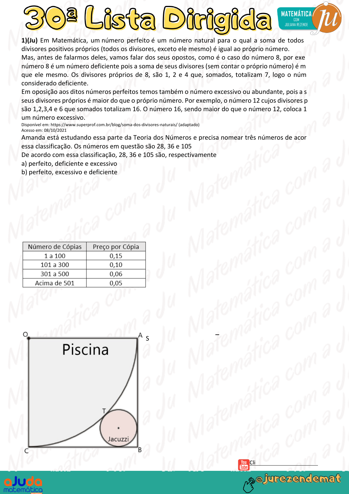 1)(Ju) Em Matemática, um número perfeito é um número natural para o qual a soma de todos os seus divisores positivos próprios (todos os divisores, exceto ele mesmo) é igual ao próprio número. Mas, antes de falarmos deles, vamos falar dos seus opostos, como é o caso do número 8, por exemplo. O número 8 é um número deficiente pois a soma de seus divisores (sem contar o próprio número) é menor do que ele mesmo. Os divisores próprios de 8, são 1, 2 e 4 que, somados, totalizam 7, logo o número 8 é considerado deficiente. Em oposição aos ditos números perfeitos temos também o número excessivo ou abundante, pois a soma de seus divisores próprios é maior do que o próprio número. Por exemplo, o número 12 cujos divisores próprios são 1,2,3,4 e 6 que somados totalizam 16. O número 16, sendo maior do que o número 12, coloca 12 como um número excessivo. Disponível em: https://www.superprof.com.br/blog/soma-dos-divisores-naturais/ (adaptado) Acesso em: 08/10/2021 Amanda está estudando essa parte da Teoria dos Números e precisa nomear três números de acordo com essa classificação. Os números em questão são 28, 36 e 105 De acordo com essa classificação, 28, 36 e 105 são, respectivamente a) perfeito, deficiente e excessivo b) perfeito, excessivo e deficiente c) deficiente, perfeito e excessivo d) deficiente, excessivo e perfeito e) excessivo, perfeito e deficiente 2)(Ju) Andréa precisa tirar cópias de uma apostila integralmente que será usada em uma das matérias na qual a jovem está matriculada. A copiadora que fica perto da faculdade cobra preços diferenciados dependendo do número de cópias que serão feitas. Se para numerar todas as páginas da apostila que Andréa precisa tirar cópia foram usados 1 209 dígitos, o valor gasto pela jovem para copiar integralmente a apostila, em real, foi 3)(Ju) Uma das piscinas de um clube tem o formato de um setor circular de 90 graus e raio igual a 16 metros, inscrito no quadrado ABCD. A pedido dos sócios, será construída uma jacuzzi tangente ao setor circular no ponto T e aos lados AB e BC Se considerarmos que √2 = 1,4, o raio da jacuzzi, em meto, é a) 2,9 b) 3,0 c) 3,2 d) 3,4 e) 3,5 Clique aqui para se inscrever a) 26,34 c) 26,76 e) 28,08 b) 26,40 d) 27,18 http://youtube.com/matematicacomaju http://youtube.com/matematicacomaju http://instagram.com/jurezendemat