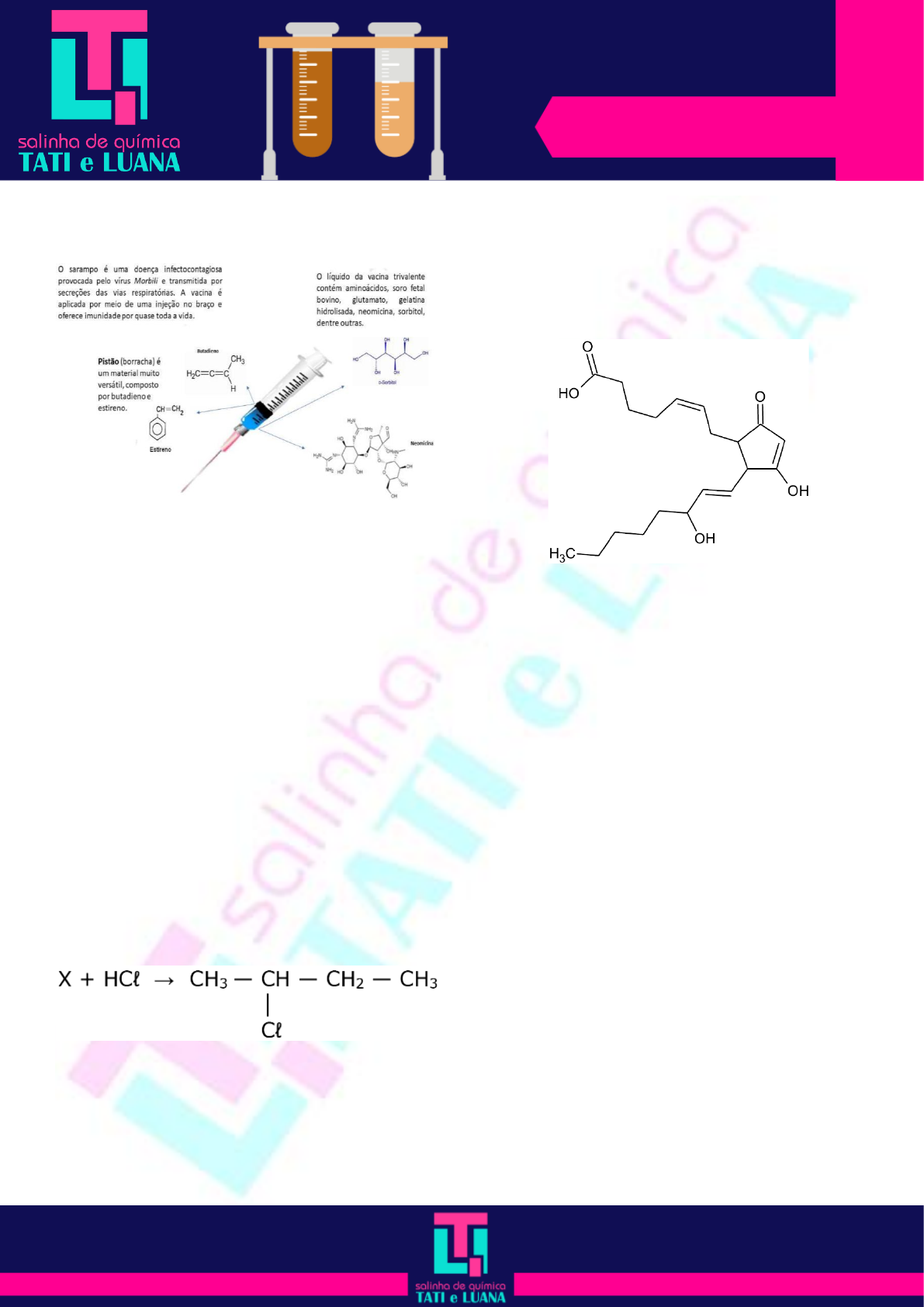 REAÇÕES DE ADIÇÃO L ista 4 7 QUESTÃO 1 (UFU MG) O sarampo é transmitido quando um indivíduo não imunizado entra em contato com secreções respiratórias de pessoas que possuem o vírus – seja pela ingestão seja pela inalação. O melhor modo de proteger as pessoas é pela vacinação que, por sua vez, mobiliza a indústria química para a produção dos materiais necessários à imunização, conforme indicado na figura acima. Sobre os materiais químicos presentes no processo de imunização das pessoas para prevenção do sarampo, faça o que se pede. a) Equacione a reação de hidrogenação catalítica total do butadieno (C4H6), que ocorre semelhantemente à do alceno, indicando o nome químico (segundo IUPAC) do produto formado. b) Explique como ocorre a interação entre o poliálcool sorbitol (C6H14O6) com moléculas de água. QUESTÃO 2 (UECE) Na reação representada por , X pode ser substituído por a) but-2-ino. b) ciclobutano. c) but-1-eno. d) butano. QUESTÃO 3 (UniRV GO) As prostaglandinas são sinalizadores celulares que estimulam as reações inflamatórias nos tecidos que as produziram assim como nos tecidos adjacentes. Na estrutura a seguir, é exemplificada a prostaglandina E2. Baseando-se na prostaglandina E2, assinale V (verdadeiro) ou F (falso) para as alternativas. a) A prostaglandina E2 pode sofrer uma reação de esterificação intracadeia. b) Na presença de I2 em meio de CCl4, a prostaglandina E2 sofre reações de adição eletrofílica. c) Ocorrem os isômeros de tautomeria na cadeia aberta da prostaglandina E2. d) A fórmula molecular da prostaglandina E2 é C20H30O5. QUESTÃO 4 (PUC Camp SP) A margarina é produzida a partir de óleo vegetal, por meio da hidrogenação. Esse processo é uma reação de I na qual uma cadeia carbônica II se transforma em outra III saturada. As lacunas I, II e III são correta e respectivamente substituídas por a) adição − insaturada − menos b) adição − saturada − mais c) adição − insaturada − mais d) substituição − insaturada − menos e) substituição − saturada − mais REAÇÕES DE ADIÇÃO L ista 4 7 QUESTÃO 5 (Faculdade Santo Agostinho BA) Algumas reações químicas são regiosseletistas, isto é, uma das direções da reação na formação do produto ocorre, preferencialmente, em relação à outra direção. Isso ocorre na adição do ácido clorídrico ao propeno resultando como produto o a) 1-cloropropano. b) 1-cloropropeno. c) 2-cloropropano. d) 2-cloropropeno. QUESTÃO 6 (UEPG PR) Com relação aos compostos abaixo, assinale o que for correto. 01. A estrutura do composto III é mais tensionada que a do composto I. 02. O composto IV não reage com H2. 04. O composto IV é mais estável que o composto II. 08. Os ângulos entre as ligações para os compostos I e II apresentam os mesmos valores. 16. Em uma reação com H2, o composto I é mais reativo que o composto III. QUESTÃO 7 (UCS RS) Um estudante de Química da 3a série do Ensino Médio foi incumbido por seu professor de descartar corretamente duas substâncias químicas, líquidas e incolores (uma de cicloexeno e, outra, de benzeno) que se encontravam em dois frascos. A separação de substâncias químicas em um laboratório é extremamente importante do ponto de vista da sustentabilidade e da gestão ambiental, uma vez que cada uma delas deve ser acondicionada em um contêiner específico para receber o tratamento adequado. Aqui, nessa situação em particular, o cicloexeno deve ser separado do benzeno, pois este último é um hidrocarboneto aromático. O problema é que os rótulos dos dois frascos, que continham as substâncias, estavam completamente danificados, tornando impossível a respectiva identificação por simples leitura. Ao relembrar de suas aulas sobre reações orgânicas, o estudante resolveu realizar um experimento bastante simples, sob a supervisão do professor, para descobrir em que frasco estava cada uma dessas substâncias. O experimento consistiu em adicionar à temperatura ambiente cerca de 1,0 mL de uma solução de coloração laranja de Br2 em 4CC a um mesmo volume de líquido de cada uma das substâncias identificadas pelos acrônimos (A) e (B) e, na sequência, em agitar os tubos de ensaios por alguns segundos. No tubo de ensaio (A), a solução de Br2 descoloriu quase que instantaneamente, enquanto que, no tubo de ensaio (B), o sistema ficou com a coloração laranja. O esquema da figura abaixo ilustra, de forma simplificada, o experimento realizado pelo estudante. Em relação ao experimento realizado, assinale a alternativa correta. a) A substância química no tubo de ensaio (A) é o benzeno. b) A substância química no tubo de ensaio (B) é o cicloexeno. c) A reação que ocorre no tubo de ensaio (A) dá origem ao 1,2-dibromocicloexano. d) A reação que ocorre no tubo (B) dá origem ao 1,2- dibromobenzeno. e) As fórmulas mínimas do cicloexeno e do benzeno são, respectivamente, C6H8 e C6H6. QUESTÃO 8 (UEM PR) Assinale o que for correto sobre a reatividade do but-1-eno, do but-1,3-dieno e do benzeno. 01. O but-1-eno sofre adição na presença de HBr, formando o 2-bromobutano. 02. O 1-bromo-but-2-eno é um dos produtos obtidos pela reação de um mol de but-1,3-dieno com um mol de HBr. 04. O benzeno sofre adição na presença de Br2, formando o 1,2-dibromobenzeno. 08. O benzeno não reage com HBr, mas reage com HF, que é um ácido mais forte. REAÇÕES DE ADIÇÃO L ista 4 7 16. O but-1-eno reage com Br2 na ausência de um catalisador. QUESTÃO 9 (Fac. Israelita de C. da Saúde Albert Einstein SP) Os cicloalcanos reagem com bromo líquido (Br2) em reações de substituição ou de adição. Anéis cíclicos com grande tensão angular entre os átomos de carbono tendem a sofrer reação de adição, com abertura de anel. Já compostos cíclicos com maior estabilidade, devido à baixa tensão nos ângulos, tendem a sofrer reações de substituição. Considere as substâncias 