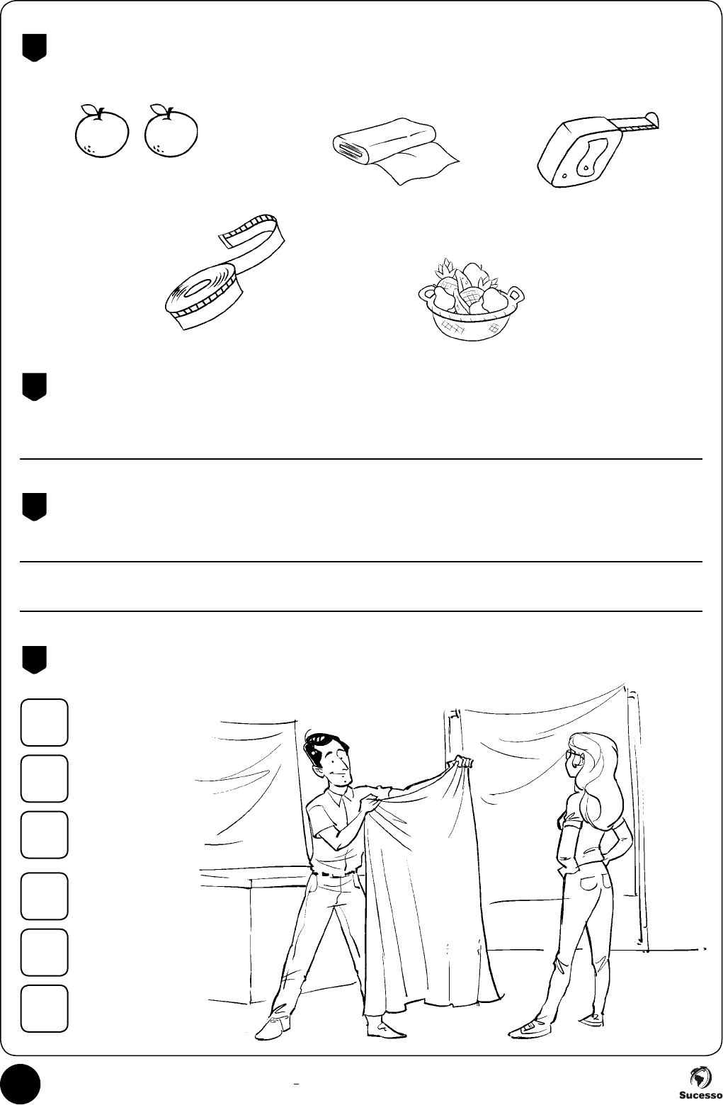 48 Banco de Questões – Matemática – 2o ano | Ensino Fundamental 3. Circule os objetos que compramos por metro. 4. Quais instrumentos podemos usar para medir? 5. Escreva quatro objetos que compramos por metro. 6. Marque um X nos objetos que compramos por metro. refrigerante açúcar tecido corda feijão elástico