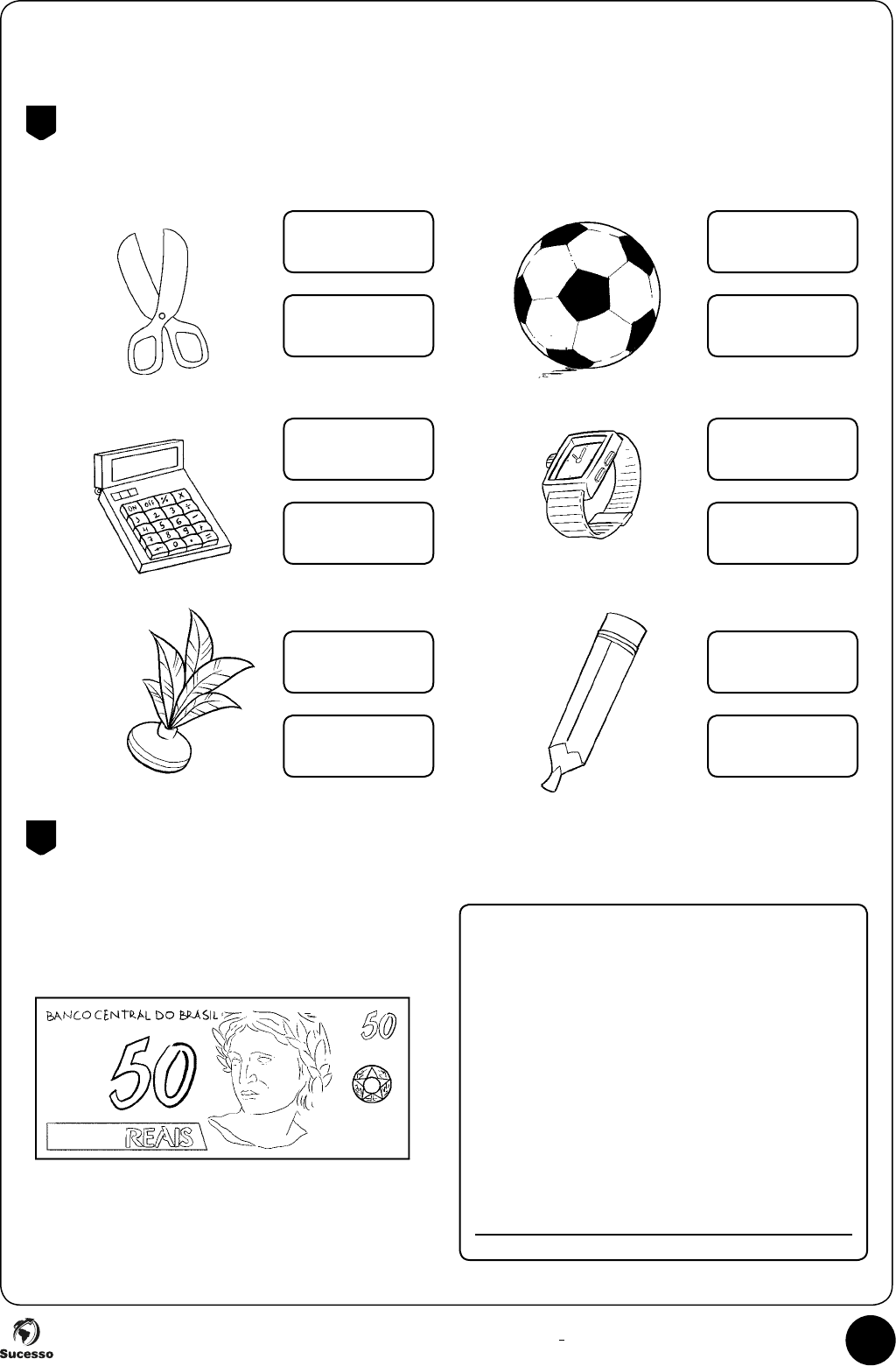 Banco de Questões – Matemática – 2o ano | Ensino Fundamental 89 1. Hoje, na loja, estava tudo em liquidação! Tudo pela metade do preço! Faça o cálculo mentalmente e coloque o valor dos produtos. 2. Papai tem uma nota de R$ 50,00 reais e quer trocar por notas de R$ 10,00 reais. Quantas notas papai vai receber? SISTEMA MONETÁRIO R$ 20,00 R$ 18,00 R$ 8,00 R$ 30,00 R$ 240,00 R$ 2,00