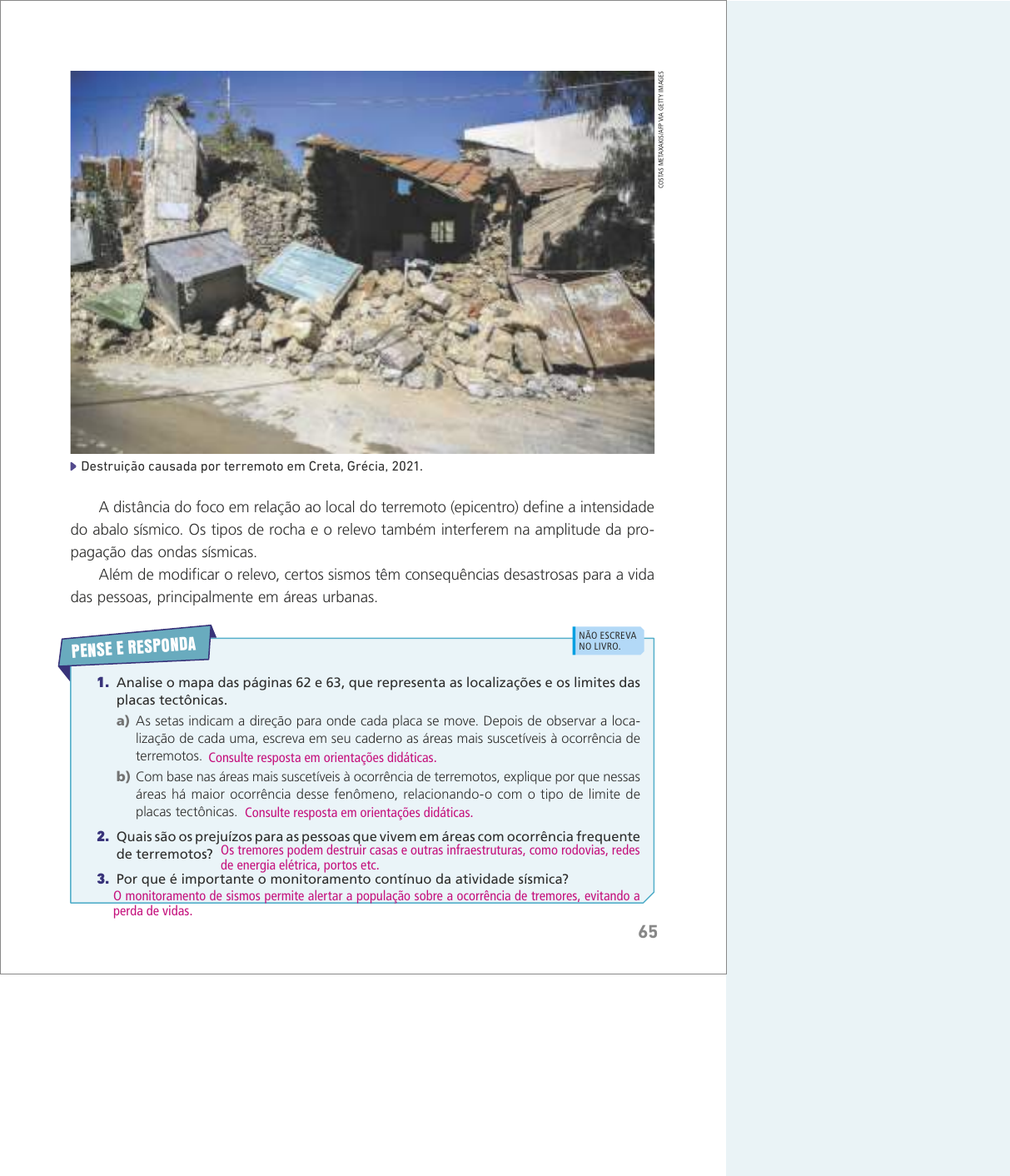 ENCAMINHAMENTO Temos uma fotografia que representa o estrago causado por um terremoto ocorrido na ilha de Creta, Grécia, em 2021. Retome o mapa das páginas 62 e 63. Com base na localização da Grécia, identifique quais são os tipos de limites de placas que ocorrem naquela região. A região do Mediterrâneo é atravessada pela zona de contato entre as placas Euro-Asiática e Africana, em um tipo de limite convergente (encontro de placas). Pergunte aos estudantes: que tipo de fenômenos são provocados em áreas de limites convergentes de placas? Outra possibilidade é investigar, com base no mapa virtual interativo do site Latest Earthquakes (disponível em: https://earthquake.usgs.gov/ earthquakes/map/, acesso em: 13 jun. 2022), como é a dinâmica tectônica na região. Acessando o link, ao clicar em settings, apa- recerá uma lista com opções de recorte temporal. Escolha a opção 30 dias, todas as mag- nitudes. Aparecerão os abalos sísmicos que ocorreram no último mês no mundo todo. Ao clicar sobre um dos círculos, são mos- tradas, no canto inferior esquerdo da tela, informações sobre a magnitude, a profundidade e a localização do abalo sísmico. Com base no mapa, é possí- vel trabalhar com os princípios geográficos de localização, dis- tribuição e analogia, além do conceito espacial de magnitude, avaliando o padrão espacial na região de Creta, sul da Grécia e leste do mar Mediterrâneo. Com a retomada de diferentes formas de representação, é possível contem- plar amplamente as Competências Gerais 4 e 5, as Competências Específicas de Ciências Humanas 5 e 7 e as Competências Específicas de Geografia 4 e 5. PENSE E RESPONDA 1. a) Espera-se que os estudantes mencio- nem as áreas de convergência de placas tectônicas, localizadas principalmente nas placas do Pacífico, Euro-Asiática, das Filipinas, Australiana e Indiana. 1. b) As áreas onde há maior ocorrência de terremotos justificam-se pelo limite de placas tectônicas convergentes, favo- recendo o encontro e o choque entre placas, aumentando os eventos sísmicos. A distância do foco em relação ao local do terremoto (epicentro) define a intensidade do abalo sísmico. Os tipos de rocha e o relevo também interferem na amplitude da pro- pagação das ondas sísmicas. Além de modificar o relevo, certos sismos têm consequências desastrosas para a vida das pessoas, principalmente em áreas urbanas. Destruição causada por terremoto em Creta, Grécia, 2021. 1. Analise o mapa das páginas 62 e 63, que representa as localizações e os limites das placas tectônicas. a) As setas indicam a direção para onde cada placa se move. Depois de observar a loca- lização de cada uma, escreva em seu caderno as áreas mais suscetíveis à ocorrência de terremotos. b) Com base nas áreas mais suscetíveis à ocorrência de terremotos, explique por que nessas áreas há maior ocorrência desse fenômeno, relacionando-o com o tipo de limite de placas tectônicas. 2. Quais são os prejuízos para as pessoas que vivem em áreas com ocorrência frequente de terremotos? 3. Por que é importante o monitoramento contínuo da atividade sísmica? Consulte resposta em orientações didáticas. Consulte resposta em orientações didáticas. Os tremores podem destruir casas e outras infraestruturas, como rodovias, redes de energia elétrica, portos etc. O monitoramento de sismos permite alertar a população sobre a ocorrência de tremores, evitando a perda de vidas. PENSE E RESPON DA NÃO ESCREVA NO LIVRO. CO ST A S M ET A XA KI S/ A FP V IA G ET TY IM A G ES 65 65 https://earthquake.usgs.gov/earthquakes/map/?extent=22.63429,-127.22168&extent=51.37178,-62.79785 https://earthquake.usgs.gov/earthquakes/map/?extent=22.63429,-127.22168&extent=51.37178,-62.79785