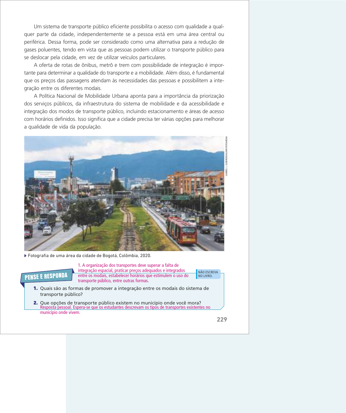1. Quais são as formas de promover a integração entre os modais do sistema de transporte público? 2. Que opções de transporte público existem no município onde você mora? 1. A organização dos transportes deve superar a falta de integração espacial, praticar preços adequados e integrados entre os modais, estabelecer horários que estimulem o uso do transporte público, entre outras formas. Resposta pessoal. Espera-se que os estudantes descrevam os tipos de transportes existentes no município onde vivem. PENSE E RESPON DA NÃO ESCREVA NO LIVRO. Um sistema de transporte público eficiente possibilita o acesso com qualidade a qual- quer parte da cidade, independentemente se a pessoa está em uma área central ou periférica. Dessa forma, pode ser considerado como uma alternativa para a redução de gases poluentes, tendo em vista que as pessoas podem utilizar o transporte público para se deslocar pela cidade, em vez de utilizar veículos particulares. A oferta de rotas de ônibus, metrô e trem com possibilidade de integração é impor- tante para determinar a qualidade do transporte e a mobilidade. Além disso, é fundamental que os preços das passagens atendam às necessidades das pessoas e possibilitem a inte- gração entre os diferentes modais. A Política Nacional de Mobilidade Urbana aponta para a importância da priorização dos serviços públicos, da infraestrutura do sistema de mobilidade e da acessibilidade e integração dos modos de transporte público, incluindo estacionamento e áreas de acesso com horários definidos. Isso significa que a cidade precisa ter várias opções para melhorar a qualidade de vida da população. G A BR IE L L. G U ER RE RO /A LA M Y/ FO TO A RE N A Fotografia de uma área da cidade de Bogotá, Colômbia, 2020. 229 ENCAMINHAMENTO Ao continuar com o tema sobre mobilidade urbana, des- tacamos o uso do transporte coletivo como alternativa para o trânsito nas cidades. A fotografia da paisagem urbana de Bogotá, na Colômbia, possibilita a refle- xão sobre os tipos de transporte coletivo, tais como ônibus e trens. Pergunte aos estudantes os tipos de transporte coletivo que eles conhecem, para que todos demonstrem reconhecer a diferença entre transportes individuais (carros, motos, bici- cletas etc.) e transportes coletivos (metrôs, VLTs, BRTs, trens, ônibus etc.). Enfatize a questão da inte- gração entre os modais, pois, geralmente, para que uma cidade possa ser sustentável em termos de mobilidade, os sis- temas de transporte precisam estar integrados. Por se tratar de um tema muito importante para garantir uma cidade sustentável, propo- nha uma atividade extra que possa colocar a mobilidade como problema na cidade onde vocês moram (TCT Cidadania e civismo – educação para o trânsito). Sugerimos iniciar pela rotina dos estudantes e de seus responsáveis, por meio da per- gunta-problema: quais são as condições de transporte que vocês enfrentam para chegar à escola e ao trabalho no municí- pio? Para realizar o trabalho, peça aos estudantes que separem os seguintes materiais: imagem de satélite ou mapa com a locali- zação da casa, da escola e do posto de trabalho no município, zona ou distrito; bloco de notas; calculadora, lápis e borracha. Oriente-os a se organizar em grupos para elaborar uma ficha de questionário/entrevista, que será a base para mapear o trajeto percorrido por eles e seus respon- sáveis. Algumas sugestões de perguntas são: quanto tempo leva, em média, para chegarmos ao trabalho e à escola? De que endereço saímos? Para qual endereço vamos? Por quais lugares passamos até chegar a nosso destino? Quais e quantos tipos de transporte utilizamos? Quanto gastamos (em R$), em média, para chegar ao trabalho e à escola? Enfrentamos congestionamento durante nosso trajeto? Depois de recolher as informações e fazer o mapa das rotas, discuta com os estudantes as facilidades e as dificuldades enfrentadas por eles. Pode ser que, em alguns casos, os estudantes morem próximo ao colégio. No entanto, por se tratar de uma atividade em grupo, eles devem se envolver e se mobilizar para resolver esses problemas, exercendo a empatia, tomando o problema do outro como o seu e desenvolvendo a consciência social e a tomada de decisão responsável. 229