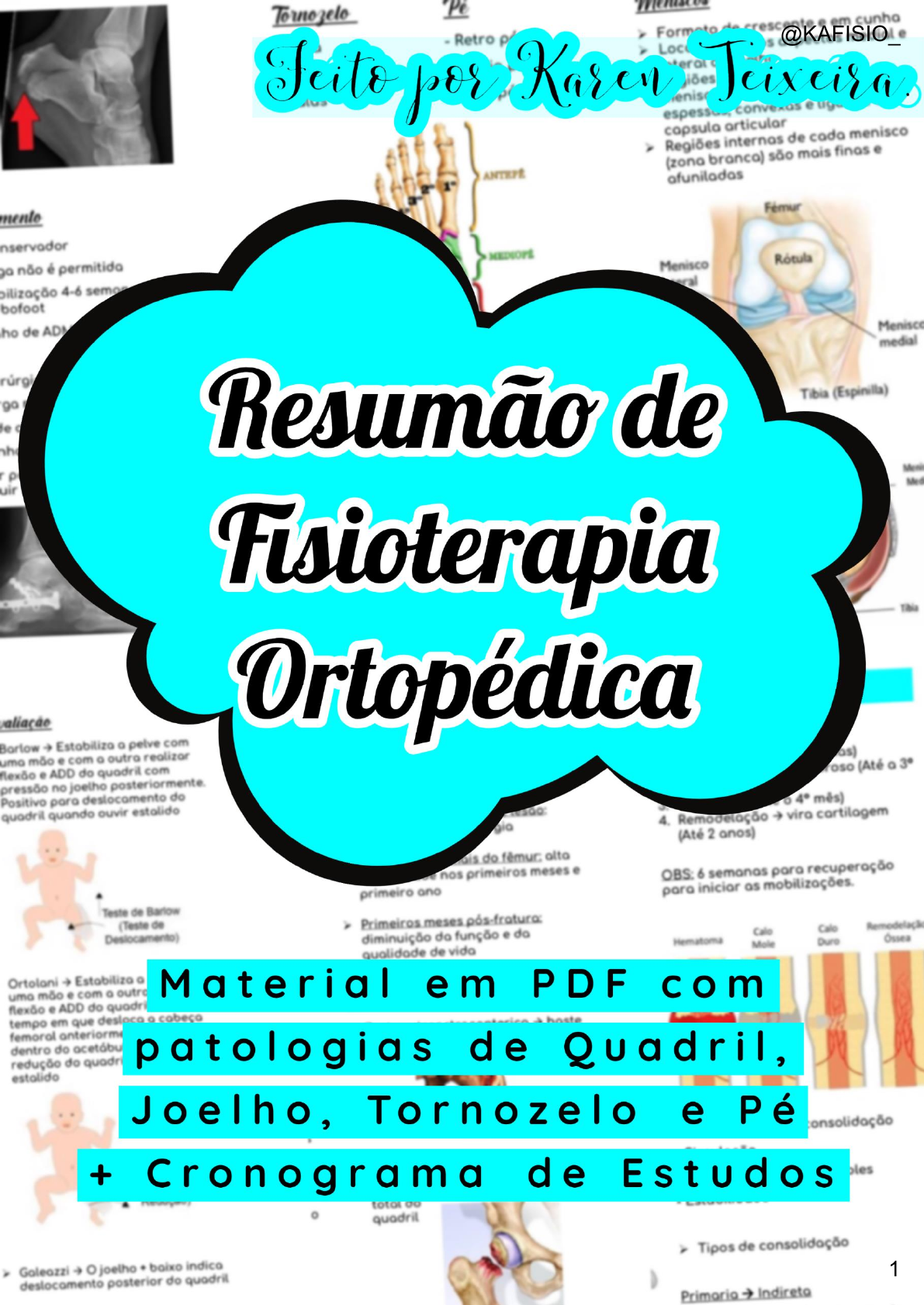 1 @KAFISIO_ , ! Meu nome é Karen, sou estudante de fisioterapia do 6° período e a pessoa por trás do Instagram @KAFISIO_ Fiz esse material com muito carinho e dedicação para facilitar seu entendimento em fisioterapia ortopédica, e espero te ajudar na preparação para o que você necessitar na vida acadêmica, pode ser uma boa nota na prova, preparação para residências, concursos e para revisar quando for necessário. A seguir você vai encontrar o sumario com todos os tópicos abordados no material, depois estará disponível um cronograma de estudos para você controlar melhor seu desempenho. Nenhuma parte desta publicação poderá ser reproduzida por qualquer meio ou forma sem a prévia autorização da autora. A violação dos direitos autorais é um crime estabelecido na Lei Federal n° 9.610 de 1998 e punido pelo artigo 184 do Código Penal. 2 @KAFISIO_ Terminologia Quadril Joelho Pé e Tornozelo Principais definições Tipos de Fratura Consolidação Estabilização Tratamento Anatomia e músculos do quadril Osteoporose Osteoartrite de Quadril Fratura Proximais de Fêmur Fratura de Púbis Tendinopatia Glútea Impacto Femoroacetabular Síndrome do Estalido de Quadril Necrose Asséptica ou Avascular da Cabeça do Fêmur Pulbalgia Síndrome do Piriforme Displasia do Desenvolvimento do Quadril Legg Calvé Perthes Epifisiólise Sinovite Inespecífica 3 @KAFISIO_ Anatomia e Músculos do joelho Osteoartrite de Joelho Fratura patelar Fratura do planalto tibial Tendinopatias Síndrome da dor Patelofemoral Instabilidade Patelofemoral Hoffite e Plica Sinovial Lesão nos Isquiotibiais Síndrome da Pata de Ganço Cisto de Baker Lesões Ligamentares Lesões de Meniscos Osgood Schlatter Sinding Larsen Johansson Anatomia do Pé e Tornozelo Biomecânica Avaliação clínica Entorses de Tornozelo Fraturas de Tornozelo Fratura de Calcâneo Fratura do 5° Metatarso Tendinopatias Ruptura do Tendão do Calcâneo Doença de Sever Síndrome do túnel do tarso Fascite Plantar Neuroma de Morton 4 @KAFISIO_ : Principais definições Data: Data: Data: Tipos de fraturas Data: Data: Data: Consolidação Data: Data: Data: Estabilização Data: Data: Data: Tratamento Data: Data: Data: 5 @KAFISIO_ : Anatomia e músculos Data: Data: Data: Osteoporose Data: Data: Data: Osteoartrite Data: Data: Data: Fratura proximais de fêmur Data: Data: Data: Fratura de púbis Data: Data: Data: Tendinopatia glútea Data: Data: Data: Impacto femoroacetabular Data: Data: Data: Síndrome do estalido de quadril Data: Data: Data: 6 @KAFISIO_ Necrose asséptica da cabeça do fêmur Data: Data: Data: Pulbalgia Data: Data: Data: Síndrome do Piriforme Data: Data: Data: Displasia do desenvolvimento do quadril Data: Data: Data: Legg Calvé Perthes Data: Data: Data: Epifisiólise Data: Data: Data: Sinovite inespecífica Data: Data: Data: 7 @KAFISIO_ : Anatomia e músculos Data: Data: Data: Osteoartrite Data: Data: Data: Fratura patelar Data: Data: Data: Fratura de planalo tibial Data: Data: Data: Tendinopatia Data: Data: Data: Síndrome da dor patelofemoral Data: Data: Data: Instabilidade patelofemoral Data: Data: Data: Hoffite e Plica Sinovial Data: Data: Data: Lesão dos isquiotibiais Data: Data: Data: 8 @KAFISIO_ Síndrome da pata de ganço Data: Data: Data: Cisto de baker Data: Data: Data: Lesões ligamentares Data: Data: Data: Lesões de meniscos Data: Data: Data: Osgood schlatter Data: Data: Data: Sinding larsen johansson Data: Data: Data: 9 @KAFISIO_ : Anatomia e músculos Data: Data: Data: Biomecânica Data: Data: Data: Avaliação clínica Data: Data: Data: Entorse de tornozelo Data: Data: Data: Fratura de tornozelo Data: Data: Data: Fratura do calcâneo Data: Data: Data: Fratura do 5° metatarso Data: Data: Data: Tendinopatia Data: Data: Data: 10 @KAFISIO_ Ruptura do tendão do calcâneo Data: Data: Data: Doença de Sever Data: Data: Data: Síndrome do túnel do tarso Data: Data: Data: Fascite plantar Data: Data: Data: Neuroma de morton Data: Data: Data: 11 @KAFISIO_ Osteossíntese Processo que ocorre quando é colocado placas e pinos que unem os ossos após a fratura Fixador interno Placas e pinos no interior da medula óssea. Fixador externo Placas e pinos fixados em fragmentos proximais ou distais. Osteotomia Corte do osso. EX: joanete Artrite ou artrose Desgaste ósseo Artroscopia Artroscopio inserido dentro da articulação Artroplastia Substituição da articulação 12 @KAFISIO_ Artrodese Junção de 2 ossos Tenotomia Corte do tendão e religa em outro local para manter o mínimo de movimento Tenorrafia Sutura dos tendões. Cirurgia para refazer o ligamento das extremidades do tendão rompido. EX: Tendão do calcâneo Tendinopatia Doença do tendão Tendinite Inflamação do tendão (degeneração) Bursite Inflamação da Bursa Fascite Inflamação da fáscia Luxação Osso se afasta da articulação Subluxação Osso se afasta da articulaçao e retorna 13 @KAFISIO_ Quebra Ruptura Solução de continuidade Perda da capacidade de transmitir forças/carga/trabalho Fases 1. Inflamação aguda (1-7 dias) 2. Calo mole tecido fibroso (Até a 3° semana) 3. Calo ósseo (Até o 4° mês) 4. Remodelação vira cartilagem (Até 2 anos) Condições para consolidação - Circulação - Integridade de partes moles - Estabilidade Tipos de consolidação Primaria Indireta Mais comum de cicatrização das fraturas Encontrada na natureza Formação de calo ósseo Não exige redução anatômica e estabilização da fratura OBS: 6 semanas para recuperação e iniciar as mobilizações. 14 @KAFISIO_ Secundaria Direta Cicatrização sem formação de calo ósseo Contato ou lacunar Produz diretamente células ósseas Exige redução anatômica, estabilização e compressão no sitio da fratura Depende de cada tipo de fratura Imobilização Formação de calo Evitar fulcro Carga conforme tolerância a dor Redução Para promover estabilidade Síntese para manter alinhamento e redução Depende de cada tipo de fratura Preservação de 