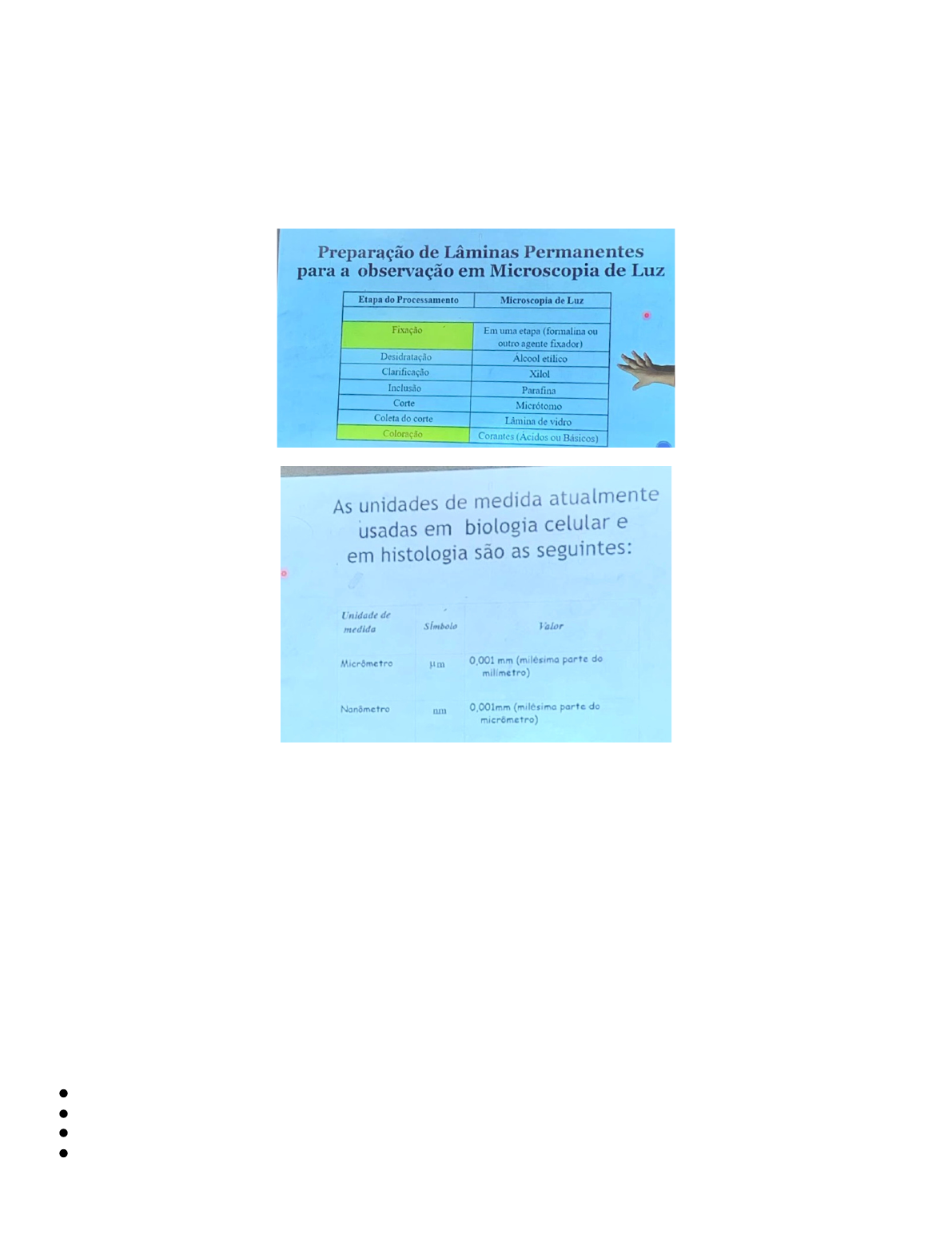 irsoi Como as células podem ser estudadas Preparados Temporários (Estudos de Células Vivas): Corantes supravitais. Preparados Permanentes (Células Mortas): Fixação e coloração. Técnicas de coleta Esfregaço: Células livres presentes nos fluidos corpóreos (sangue, linfa, sêmem, líquor, hemolinfa); Espalhamento: Consiste em promover uma raspagem das camadas superficiais das mucosas Ex.: mucosas vaginais ou bucais; Montagem total (à fresco ou não): Ex.: Órgão inteiro de insetos, folha de uma planta; Corte histológico: cortes extremamente finos (micrômetros) COLORAÇÃO Corantes ácidos têm maior afinidade por moléculas básicas presentes em algumo proteínas acidófilas. As células e as estruturas dos tecidos são transparentes e Incolores com indice de refração muito próximo, o que dificulta a sua observação. Recorre-se à utilização de corantes histológicos para evidenciar estas estruturas. Corantes básicos têm maior afinidade por moléculas ácidas como o DNA e o RNA que são estruturas basofilas. Reações de acidofilia e basofilia -Afinidade por corantes ácidos (proteinas básicas citoplasmáticas) - ACIDÓFILAS -Afinidade por corantes básicos (DNA, RNA, glicoproteinas ácidas, Pectatos e polissacarideos ácidos) - BASÓFILAS "A coloração acentua a absorção de luz pelo material" •Corantes - moléculas orgânicas que apresentam em sua estrutura duplas ou triplas ligações, as quais interagem com a luz dotando os corpos de capacidades absortivas: Grupo Cromofórico. "Diferentes componentes celulares podem ser seletivamente corados" Métodos de fixação FÍSICOS:Calor - Fixação de bactérias leveduras QUÍMICOS-Substâncias quimicas que preservam a estrutura e composição química dos tecidos. Processamento de material biológico para microscopia óptica FIXAÇÃO DE TECIDOS Preservação das estruturas o mais semelhante à sua situação in vivo Fatores que afetam a fixação DESIDRATAÇÃO DIAFANIZAÇÃO Álcoois (metanol, etanol) Fixadores com mercúrio (Zenker) Fixadores com ácido pícrico (Bouin) Glutaraldeído Formaldeído Tetróxido de ósmio Consistência "endurecer os tecidos e as células" Impedir a autolise Impedir a atividade e a proliferação de bactérias Resistência às etapas seguintes da técnica citológica Aumentar a afinidade das estruturas celulares pelos corantes citológicos ph; Osmolaridade; Velocidade de penetração dos fixadores (2-3 mm espessura); Volume de fixador; Concentração do fixador; Temperatura; Consiste na remoção da água livre do tecido fixado, por ação do álcool. A maior parte dos meios de inclusão são insolúveis em água, o que obriga a proceder a uma desidratação das amostras a incluir. Série de álcoois de concentração crescente: 70°, 95° e 100° Passagem dos fragmentos de tecido fixados e desidratados por uma substância diafanizadora miscível com a substância de inclusão. Ex: Xilol, Toluol, Benzol INCLUSÃO O tecido é colocado em suportes metálicos cheios de parafina líquida, que depois de solidificar permite cortar o tecido em secções finas. os tecidos tém de ser alinhados e orientados de acordo com as suas características e objetivos do trabalho. IMPREGNAÇÃO Infiltração do tecido por uma substância impregnante (parafina líquida). Este procedimento é feito na estufa. CORTE POLIMERIZAÇÃO A parafina solidifica à temperatura ambiente mas a polimerização é feita normalmente no frio. APÓS O CORTE Tipos de microscopia Microscopia Óptica A peça fica com aspecto mais claro e translúcida Corte transversal Corte longitudinal Corte obliquo Os blocos incluídos são cortados em micrótomos A espessura do corte deve estar compreendida entre 3 a 10 um Colocam-se as secções a flutuar em banho-maria Colocam-se os cortes numa lâmina Estufa Microscopia Eletrônica Amplia um objeto a ser estudado. Funciona com um conjunto de lentes que atuam nessa ampliação. Pode usar iluminação natural ou artificial. Possui um sistema mecânico que suporta e permite controlar o sistema óptico que atua na ampliação das imagens. Oculares: Ampliam a imagem fornecida pelo sistema de objetivas. Braço: Suporta a platina e ao revólver. Canhão (Tubo): Serve de suporto ao sistema ocular. Objetivas: Ampliam a imagem do objeto que está sendo observado Revólver: serve de suporte às objetivas e permite a mudança delas. Platina:Serve de suporte para a colocação do material que vai ser observado. Observe que a mesma apresenta uma abertura central para a passagem da luz. Fonte de Luz: Pode ser natural quando se usa um espelho refletor ou artificial. Condensador: Distribui a luz que atravessa o diafragma. Diafragma: regula a intensidade de luz captada da fonte luminosa. Observe que o mesmo apresenta um pino que ao ser manipulado abre ou fecha o mecanismo central. Base ou pé: Suporte de todos os elementos do microscópio. Parafusos Macrométrico e Micrométrico: Permitem movimentos de maior ou menor amplitude, afastando ou aproximando a preparação estudada. CUIDADOS COM O MICROSCÓPIO Eucariotas Procariotas Transportá-lo com ambas as mãos, apoiando a base numa delas e segurando o braço com a outra. Ao colocá-lo sobre a mesa, mantê-lo a alguma distância do bordo. Evitar molhá-lo ao usar preparações temporárias. As lentes São peças muito caras. Para as limpar, deve usar a flanela que normalmente acompanha o aparelho. Após a utilização, encaixar a objetiva de menor ampliação alinhada com a ocular. 1. Possuem carioteca. 2. Podem ser animais ou vegetais. 3. Podem ser uni ou pluricelulares. 4. Ricos em organelas. 1. NÃO Possuem carioteca. 2. Todos são UNICELULARES. 3. NÃO possuem organelas. 4. EX. BACTÉRIAS.