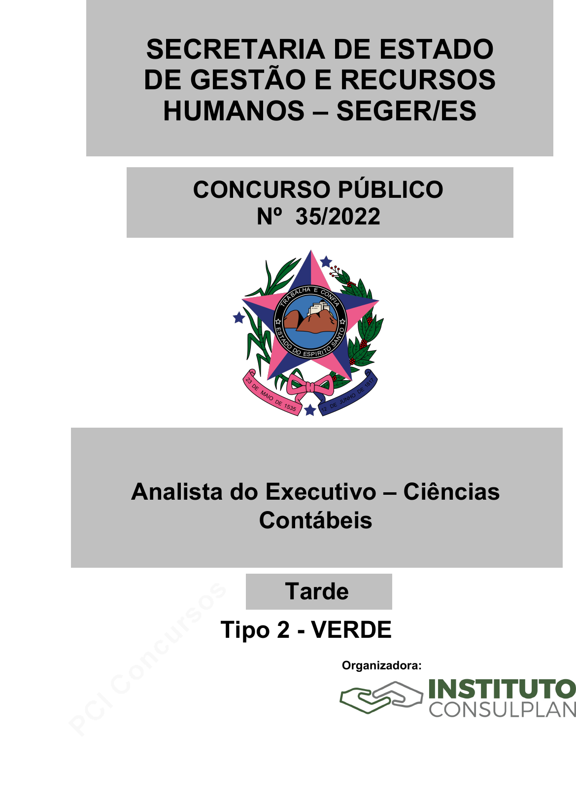 pcimarkpci MjgwNDowZDQxOmU2ZTU6NzIwMDowMTJlOmY5Njg6ZjdkNzo2YjM1:VHVlLCAzMCBBcHIgMjAyNCAwNzo0NTo0NyAtMDMwMA== www.pciconcursos.com.br Analista do Executivo – Ciências Contábeis Organizadora: Tipo 2 - VERDE Tarde CONCURSO PÚBLICO Nº 35/2022 SECRETARIA DE ESTADO DE GESTÃO E RECURSOS HUMANOS – SEGER/ES pcimarkpci MjgwNDowZDQxOmU2ZTU6NzIwMDowMTJlOmY5Njg6ZjdkNzo2YjM1:VHVlLCAzMCBBcHIgMjAyNCAwNzo0NTo0NyAtMDMwMA== www.pciconcursos.com.br 2 CARGO: ANALISTA DO EXECUTIVO – CIÊNCIAS CONTÁBEIS – TIPO 2 – VERDE CONCURSO PÚBLICO – SECRETARIA DE ESTADO DE GESTÃO E RECURSOS HUMANOS – SEGER/ES ꯀ CARGO: ANALISTA DO EXECUTIVO – CIÊNCIAS CONTÁBEIS CONHECIMENTOS GERAIS LÍNGUA PORTUGUESA Leia o texto a seguir para responder às questões de 01 a 08. Por que você não deve acalmar seu filho com o celular? Quando uma criança está inquieta ou fazendo muita bagunça, colocá-la na frente de um celular com joguinhos ou vídeos pode parecer a solução ideal. Mas, se usada constan- temente, essa técnica pode ter seus reveses. Pesquisadores analisaram o uso de dispositivos digitais como ferramentas para acalmar crianças com idade entre 3 e 5 anos. O estudo envolveu 422 pais e 422 crianças. Ele foi realizado entre agosto de 2018 e janeiro de 2020, antes da pandemia de Covid-19. Os cientistas descobriram que o aumento do uso de aparelhos eletrônicos como método para acalmar crianças estava ligado a uma maior reatividade emocional ao longo dos meses. As crianças do estudo mudavam de humor rapidamente e ficaram mais impulsivas – relação particularmente forte em meninos e em crianças que já tinham sinais de hiperatividade, impulsividade e temperamento forte, o que os torna mais pro- pensos a reagir intensamente a sentimentos como raiva, frus- tração e tristeza. “Usar dispositivos móveis para acalmar uma criança pequena pode parecer uma ferramenta inofensiva e tempo- rária para reduzir o estresse em casa, mas pode haver con- sequências a longo prazo se for uma estratégia regular”, afir- ma Jenny Radesky, principal autora do estudo e mãe de dois filhos. “Esses dispositivos podem comprometer as oportuni- dades de desenvolvimento de métodos independentes e alternativos de autorregulação – particularmente durante os seis primeiros anos de vida”. Crianças nessa faixa etária costumam apresentar compor- tamentos difíceis com maior frequência. Acessos de raiva, ata- ques de birra ou emoções muito intensas podem ser facilmente controlados com um tablet ou um smartphone. A solução fun- ciona, mas o alívio de curto prazo pode comprometer o de- senvolvimento emocional da criança. O estudo chama a atenção para o uso exagerado e constante desse método simples. Se aplicado com modera- ção, pode ser útil – mas não deve ser a principal forma de lidar com situações difíceis. Para não desamparar pais que abusavam desse método, os pesquisadores também apresentaram algumas outras opções para acalmar as crianças. Fornecer experiências sensoriais ou estimular exercí- cios, por exemplo, pode ajudar. Isso pode incluir balançar, abraçar, pular em um trampolim, ouvir música ou olhar para figuras de um livro. Ao tentar nomear o que seu filho está sentindo, os pais ajudam a conectar a linguagem aos estados emocionais; além de mostrar à criança que ela é compreendida pelos adultos. Os pesquisadores também promovem alternativas para os comportamentos particularmente negativos de quando estão chateadas. Ao tentar comunicar suas emoções, as crianças podem recorrer a impulsos violentos ou exagerados. Os pais podem ensiná-las comportamentos substitutos mais seguros – como descontar a raiva em um travesseiro ao invés de um colega, ou comunicar-se claramente quando gostaria de atenção ao invés de abrir um berreiro. “Todas essas soluções ajudam as crianças a se entende- rem melhor e a se sentirem mais competentes para adminis- trar seus sentimentos”, afirma Radesky. “O cuidador também precisa tentar manter a calma e não reagir exageradamente às emoções da criança. Esses cuidados ajudam a desenvolver ha- bilidades de regulação emocional que duram a vida toda.” “Por outro lado, usar um dispositivo móvel não ensina uma habilidade – apenas distrai a criança de como ela está se sentindo. Crianças que não desenvolvem essas habilida- des na primeira infância são mais propensas a ter dificulda- des quando estressadas na escola ou com colegas à medida que envelhecem.” (CAPARROZ, Leo. Por que você não deve acalmar seu filho com o celular? Revista Superinteressante, 2022. Disponível em: https://super. abril.com.br/ciencia/por-que-voce-nao-deve-acalmar-seu-filho-com-o- celular-segundo-este-estudo/ Acesso em: 22/12/22. Adaptado.) Questão 01 Na passagem “Usar dispositivos móveis para acalmar uma cri- ança pequena pode parecer uma ferramenta inofensiva e temporária para reduzir o estresse em casa, mas pode haver consequências a longo prazo se for uma estratégia regular, [...]” (5º§), se o verbo “haver” fosse substituído pelo verbo “existir”, a reescrita adequada da locução verbal destacada seria A) pode existir. B) poder existir. C) podem existir. D) pode existirem. E) podem existirem. Questão 02 A principal informação do texto se encontra em qual passagem a seguir? A) “Os pesquisadores também promovem alternativas para os comportamentos particularmente negativos de quando estão chateadas.” (11º§) B) “Os cientistas descobriram que o aumento do uso de aparelhos eletrônicos como método para acalmar crianças estava ligado a uma maior reatividade emocional ao longo dos meses.” (3º§) C) “Fornecer experiências sensoriais ou estimular exercícios, por exemplo, pode ajudar. Isso pode incluir balançar, abraçar, pular em um trampolim, ouvir música ou olhar para figuras de um livro.” (9º§) D) “O estudo chama a atenção para o uso exagerado e cons- tante desse método simples. Se a