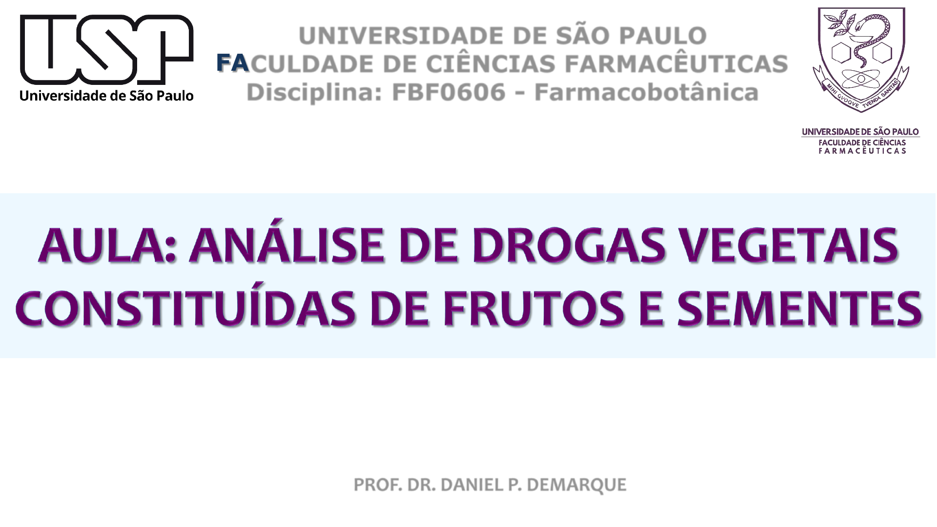 PROF. DR. DANIEL P. DEMARQUE UNIVERSIDADE DE SÃO PAULO FACULDADE DE CIÊNCIAS FARMACÊUTICAS Disciplina: FBF0606 - Farmacobotânica Aula: Análise de drogas vegetais: Frutos e sementes | Disciplina de Farmacobotânica FBF – FCF – USP | Prof. Dr. Daniel P. Demarque 1. Introdução 2 Receptáculo floral Pedúnculo Sépalas Filete Antera Pétalas Ovário Estilete Estigma Carpelo Estames Corola Cálice P e ri an to Conectivo Gineceu FONTE: Oliveira et al. (2009). Fundamentos de Farmacobotânica. 3ª Ed. Editora Atheneu Aula: Análise de drogas vegetais: Frutos e sementes | Disciplina de Farmacobotânica FBF – FCF – USP | Prof. Dr. Daniel P. Demarque 3 • O que é um fruto? - Ovário fecundado e desenvolvido acompanhando ou não de outras partes florais - Sementes (partenocárpicos→ não possuem sementes) - Angiospermas 1. Introdução Fruto ou fruta? Legumes que são raízes: mandioca, cenoura; folhas: couve, alface; frutos: abobrinha, tomate, pimentão. Legume é um nome específico de fruto! Aula: Análise de drogas vegetais: Frutos e sementes | Disciplina de Farmacobotânica FBF – FCF – USP | Prof. Dr. Daniel P. Demarque 4 PERICARPO • Epicarpo – derivado da epiderme externa do carpelo • Mesocarpo – derivado da parede do carpelo – mesofilo da folhar carpelar • Endocarpo – derivado da epiderme interna do carpelo 1. Introdução Endocarpo Mesocarpo Epicarpo Aula: Análise de drogas vegetais: Frutos e sementes | Disciplina de Farmacobotânica FBF – FCF – USP | Prof. Dr. Daniel P. Demarque 5 Número de ovários 2.1. Simples – derivado de um único ovário Pode ser um ovário unicarpelar ou policarpelar, porém fundidos entre si 2.2. Agregado – derivado de vários ovários livres entre si Dialicarpelares ou apocárpicos 2.3. Infrutescência – derivado de inflorescência 2. Classificação dos frutos Classificação de frutos - Número de ovários (simples, agregado/múltiplos, infrutescência) - Natureza do pericarpo maduro: carnoso, seco - Deiscência (se abrem) ou indeiscência (não se abrem) da Graça Amaral, Francisco Antônio da Silva Filho. Sistemática vegetal II - Florianópolis : Biologia/EaD/UFSC, 2010. Aula: Análise de drogas vegetais: Frutos e sementes | Disciplina de Farmacobotânica FBF – FCF – USP | Prof. Dr. Daniel P. Demarque 6 Número de ovários 2.1. Simples – derivado de um único ovário 2.2. Agregado – derivado de vários ovários livres entre si (dialicarpelares ou apocárpicos) 2.3. Infrutescência – derivado de inflorescência 2. Classificação dos frutos Rubus sp. (framboesa) Pseudofruto: outras partes florais participam de sua composição Aula: Análise de drogas vegetais: Frutos e sementes | Disciplina de Farmacobotânica FBF – FCF – USP | Prof. Dr. Daniel P. Demarque 7 2. Classificação dos frutos Frutos Carnosos Deiscentes Indeiscentes Baga Drupa Pomo Secos Deiscentes Indeiscentes Drupa – mesocarpo carnoso ou fibroso e endocarpo pétreo lignificado→ caroço (Exs: pêssego, AMEIXA, amêndoa, manga, azeitona, coco) Baga – pericarpo carnoso, suculento rico em parênquima aquífero. (Exs: uva, pimentão, banana, amora, ROMÃ). Hisperídio → citrus (fruto com o epicarpo grosso e com óleo, mesocarpo esbranquiçado, endocarpo possui as bexigas de suco, gomos). Citrus aurantium L. (laranja amarga - ansiolítico e sedativo leve. ) Pepônio→ o endocarpo é pouco consistente no fruto maduro (Ex: abóbora, mamão, melão) “endocarpo ~ gel” Aula: Análise de drogas vegetais: Frutos e sementes | Disciplina de Farmacobotânica FBF – FCF – USP | Prof. Dr. Daniel P. Demarque 8 2. Classificação dos frutos Frutos Carnosos Deiscentes Indeiscentes Baga Drupa Pomo Secos Deiscentes Indeiscentes AMEIXA, fruto A droga vegetal consiste de frutos secos de Prunus domestica L., contendo, no mínimo, 0,70% de ácido clorogênico (C16H18O9, 354,31), calculado em relação ao material dessecado. Descrição macroscópica Fruto do tipo drupa, oblongo a elipsóide, com 3 a 4 cm de comprimento, de coloração pardoarroxeada, muito enrugado pelo dessecamento. A casca ou exocarpo é brilhante e irregularmente rugosa, podendo apresentar porções lisas, e a polpa ou mesocarpo é adocicada e mole. Aula: Análise de drogas vegetais: Frutos e sementes | Disciplina de Farmacobotânica FBF – FCF – USP | Prof. Dr. Daniel P. Demarque 9 2. Classificação dos frutos Frutos Carnosos Deiscentes Indeiscentes Baga Drupa Pomo Secos Deiscentes Indeiscentes Formulário Fitoterápico 1ª ed. TINTURA DE Momordica charantia L., frutos INDICAÇÕES Escabicida e pediculicida ADVERTÊNCIAS Não usar por via oral, pois pode causar coma hipoglicêmico, distúrbios hepáticos, cefaleias e convulsões em crianças https://www.todafruta.com.br/melao-de-sao-caetano/ Aula: Análise de drogas vegetais: Frutos e sementes | Disciplina de Farmacobotânica FBF – FCF – USP | Prof. Dr. Daniel P. Demarque 10 2. Classificação dos frutos Frutos Secos Deiscentes Unicarpelar Folículo Legume Policarpelar Cápsula Poricida Pixidiária Loculicida Septicida Septifraga Siliqua Indeiscentes Carnosos Deiscentes Indeiscentes Aula: Análise de drogas vegetais: Frutos e sementes | Disciplina de Farmacobotânica FBF – FCF – USP | Prof. Dr. Daniel P. Demarque 11 2. Classificação dos frutos Frutos Secos Deiscentes Unicarpelar Folículo Legume Policarpelar Cápsula Poricida Pixidiária Loculicida Septicida Septifraga Siliqua Indeiscentes Carnosos Deiscentes Indeiscentes Baga Drupa Pomo O fruto é múltiplo, composto de sete ou oito folículos, algumas vezes até 11, dispostos horizontalmente em forma de estrela, ao redor de um eixo central denominado columela. Os folículos têm de 1 a 2 cm de comprimento, coloração castanho-acinzentada e são desigualmente desenvolvidos, lenhosos, careniformes, achatados lateralmente, terminando em ápice obtuso e curvo. A face externa, lateral e inferior de cada folículo é espessa e rugosa e o bordo superior, chamado de 