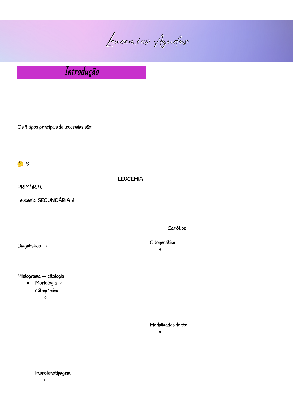 Sandy Vanessa Med 08 - UFPE-CAA Introdução Tumor com origem na medula provocando acúmulo de células brancas. São tumores extremamente agressivos e possuem letalidade elevada. ● Se é aguda ou crônica depende do local de parada da diferenciação→ origem do clone hematopoético Os 4 tipos principais de leucemias são: ● Leucemia mielóide aguda→ + comum em adulto ● Leucemia mielóide crônica ● Leucemia linfocítica aguda→ comum em crianças ● Leucemia linfocítica crônica 🤔 Se a leucemia aguda ocorrer em pacientes sem nenhuma doença hematológica e sem uso prévio de quimioterápicos leucemogênicos é classificada como uma LEUCEMIA PRIMÁRIA. Leucemia SECUNDÁRIA é vista em pacientes com doenças hematológicas pré-leucêmicas, como as síndromes mielodisplásicas, síndromes mieloproliferativas, ou uso prévio de certos quimioterápicos. → Prognóstico reservado → clone neoplásico tende a ser mais resistente ao tratamento. Diagnóstico → aspiração de medula → sempre crista ilíaca posterior! ● Esterno é muito fino! Mielograma→ citologia ● Morfologia→ operador dependente ● Citoquímica ○ Mieloperoxidase (MOP) → enzima encontrada em grânulos de células granulocíticas e monocíticas ○ Sudan Black B (SBB)→ cora os fosfolipídeos de monócitos e granulócitos ○ Esterase → ñ específica → enzima presente em monócitos e precursores ○ Ácido Periódico de Schiff (PAS) → presente em LLA de células B ○ Fosfatase ácida→ LLA de células T ● Imunofenotipagem ○ Padrão-ouro ○ Bastos da LMA maiores e geralmente com grânulos no citoplasma ○ Bastonetes de Auer → patognomônicos de LMA→M1, M2, M3 e M4 ○ MPO + SBB + PAS + fosfatase áciida ○ 15-20% de imprecisão ○ Pesquisa de marcadores de membrana e citoplasma através de anticorpos específicos ligados a substâncias fluorescentes ○ A atividade fluorescente detectada através da citometria de fluxo indica ○ Marcadores ■ CD34→ marcador de célula tronco ■ Tdt citoplasmático → marcador de linfoblasro ■ Linhagem mieloide → CD13, CD14, CD33 ■ Linhagem linfóide T → CD2, CD3, CD4, CD7, CD8, CD10 ■ Linhagem linfóide B→CD10, CD19, CD20, CD22 ● Cariótipo Citogenética ● Um dos principais marcadores prognósticos ● Escolha da terapia pós-remissão ● Cariótipo→CTG convencional ● Biologia Molecular (RT-PCR) ● FISH (FLuorescence in Situ Hibridization) → mais sensível e específica ○ Uma sonda fluorescente complementar de DNA que se combina com a sequência do DNA que contém alteração procurada Modalidades de tto ● Tto mais especializado ● Radioterapia→ pouco papel na leucemia ● Quimioterapia→ agem nas fases do ciclo celular ● Terapias-alvo → ATRA, imatinibe (9-22), rituximabe (CD20), brentuximab (CD30) ● Transplante de células tronco hematopoiéticas → TCTH/TMO 1 Sandy Vanessa Med 08 - UFPE-CAA ○ Autólogo → de mim p/ mim → pcte em remissão, faço uma quimio forte e depois repovôo a sua medula ○ Alogênico → de outra pessoa da mesma espécie p/ vc → quero que linfócitos T da medula que eu recebo destrua o resto de clone que sobrou de leucemia, e não só o repovoamento da medula. ■ Objetivo→ curar! ■ ELiminar o clone com QT/RxT ■ Enxerto-versus-neoplasia → célula T x neoplasia ■ Tempo de pega → SP x medula → tempo de pega SP demora mais ■ Elevada morbimortalidade → infecções, GVHD ○ Singênico ○ TOdos têm o objetivo de reestabelecer a hematopoiese normal ● CAR-T cells Fisiopatologia 3 etapas ● Proliferação → pancitopenia, febre e dor óssea → aumento do risco de infecção!! ● Leucemização→ leucocitose, leucostase ● Infiltração → hepatoesplenomegalia, pele, gengiva, SNC, órbita, linfonodo, testículo Ocorre acúmulo de mutações genéticas (deleção, translocação, ganho cromossomial) na medula óssea → expressão de proto-oncogenes → a célula progenitora se torna incapaz de prosseguir na sua diferenciação e as células começam a se proliferar descontroladamente. ● Leucemia aguda→ acúmulo de células jovens (blastos). ● Leucemia crônica→ acúmulo de células maduras. Epidemiologia ● Caos novos ○ Mas 5920/ano ○ Fem→ 48990/ano ● LMA→ mais comum em adultos ● 1% de todos os canceres ● LLA→ cancer mais com fs infância Leucemias Agudas Blastos incapazes de se diferenciar em células maduras → Mutação com bloqueio precoce na maturação → estímulo à proliferação→ blastos em excesso. ● Impedimento do crescimento e proliferação das células normais→ supressão da hematopoiese normal! ○ ↓ hemácias, ↓plaquetas, ↓ leucócitos maduros → pancitopenia → MARCO CLÍNICO DA DOENÇA! ● Proliferação de blastos pode resultar em febre → liberação de fatores pirogênicos. ● Os blastos anormais secretam fatores inibitórios e indutores de fibrose → disfunção medular mais grave do que o esperado somente pela ocupação do espaço. ● Há um momento em que a medula fica muito cheia e acaba liberando os blastos para o sangue. → Leucemização. ○ Leucocitose por blastos → ñ amadurecem → ñ exercem função na corrente sanguínea → podem infiltrar órgãos, como linfonodos, baço, fígado, gengiva, órbita, SNC, meninges, testículos, pele, etc ■ Fisiologicamente não há blastos na corrente sanguínea!! ■ Paciente vai à óbito pela infiltração tecidual maciça (falência) e/ou pancitopenia grave ● Devido ao grande número de blastos no sangue, ele pode começar a ficar mais espesso → leucostase (cefaleia, dispneia...) ● Os leucócitos podem infiltrar tecidos, como o fígado, pele, SNC, gengiva, órbita ocular, linfonodos, testículo. Resumo da clínica: ● Febre, pancitopenia, leucemização, leucostase e infiltração de tecidos. ● Paciente pode apresentar infecções de repetição. O diagnóstico é feito quando tem ≥ 20% de blastos na medula 