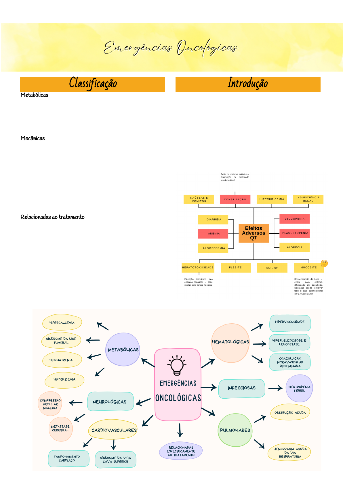 Sandy Vanessa Med 08 - UFPE-CAA Classificação Metabólicas ● Hipercalcemia ● Hiponatremia por SIADH ● Síndrome de lise tumoral Mecânicas ● Tamponamento pericárdico ● Derrame pleural ● Síndrome da veia cava superior ● Hipertensão intracraniana induzida por neoplasia ● Síndrome de compressão medular ● Síndrome de hiperviscosidade ● Obstrução intestinal Relacionadas ao tratamento ● Mucosite ● Neutropenia febril ● Trombocitopenia ● Efeitos tóxicos diretos de quimioterápicos em órgãos e sistemas Introdução Representam um amplo espectro de doenças que podem se apresentar no departamento de emergência (DE) como a manifestação inicial de uma neoplasia maligna previamente não diagnosticada, a progressão de uma doença já conhecida ou o efeito colateral do tratamento oncológico. A condição clínica do paciente previamente à admissão, o prognóstico oncológico e a expectativa de vida devem ser levantados, e o planejamento terapêutico e os objetivos do cuidado devem ser discutidos durante a avaliação inicial. 1 Sandy Vanessa Med 08 - UFPE-CAA Neutropenia Febril Urgência oncológica do tipo hematológica, a qual é associada a quimioterapia citotóxica e, por isso, todos os pacientes submetidos à quimioterapia têm risco de desenvolvê-la. ● Mielodepressão → deixa o paciente mais suscetível a infecções, especialmente por patógenos oportunistas, oriundos da pele, da cavidade oral e do trato gastrointestinal. ● Elevada morbimortalidade ● Contagem absoluta de neutrófilos menor que 500 células/µL ou com expectativa de decréscimo abaixo de 500 células/µL nas próximas 48 horas. ○ Pessoa infectada ou sem sinais de infecção! ● Pacientes com câncer que recebem terapia antineoplásica citotóxica suficiente para afetar adversamente a mielopoiese e a integridade do desenvolvimento da mucosa gastrointestinal correm risco de infecção invasiva devido à colonização de bactérias e/ou fungos que se translocam através das superfícies da mucosa intestinal. 💣 Maneiras em que a quimioterapia citotóxica deprime a imunidade e predispõe à infecção: ● Neutropenia compromete sensivelmente a resposta imune inata → prejudica a fagocitose e a produção de mediadores inflamatórios. ● Lesão à barreira mucosa gastrointestinal → provoca dano a células epiteliais que alteram a produção de peptídeos antimicrobianos reguladores da flora local, compromete o tecido linfóide associado a mucosa (placas de Peyer, células dendríticas, linfócitos), alteram a composição da flora e comprometem a integridade da barreira mucosa por apoptose. ● Quebra da barreira cutânea secundária à frequente necessidade de cateteres de longa permanência. 🚨 O tipo de tumor também afeta a incidência da neutropenia!! → Enquanto a febre pode ocorrer em 10 a 50% dos pacientes com tumores sólidos, em neoplasias hematológicas acomete mais de 80%. 🦠 O uso de antimicrobianos profiláticos ou terapêuticos pode facilitar o supercrescimento bacteriano devido à pressão seletiva. Além da neutropenia, outros fatores desempenham um papel importante no aumento do risco de infecção em pacientes neutropênicos com febre: ● Quimioterapia ● Dispositivos intravenosos ou implantados ● Hipogamaglobulinemia (leucemia linfocítica crônica, mieloma múltiplo, esplenectomia) ● Defeitos da imunidade celular (leucemia linfoblástica aguda, linfoma não Hodgkin, doença de Hodgkin, tratamento com fludarabina e alentuzumabe ● Terapia com glicocorticóides ● Destruição da integridade das estruturas anatômicas normais. Febre + neutropenia ● 👄 Temperatura ORAL → ≥ 38,3ºC (pico isolado) OU ≥ 38ºC sustentada por + de 1h. ○ Retal não pode e axilar pouco fidedigna, mas aí como no Br não usa muito oral, considera a diferença entre as duas e usa temperatura axilar > 37,8ºC (isolado) ● Neutrófilos < 500/mm³ OU neutrófilos < 1000/mm³ reduzindo para 500 nas próximas 48h. ● 🕳 A neutropenia PROFUNDA é definida por leucócitos ≤ 100/mm³, confirmada por contagem manual. Neutropenia funcional → defeitos QUALITATIVOS nos neutrófilos, como o prejuízo à fagocitose ou ao combate a microrganismos, sem alteração na sua contagem absoluta. ☠ Complicações podem ocorrer em 25 a 30% dos casos e a mortalidade do paciente é de 11%. 🤔 MESMO NA AUSÊNCIA DE FEBRE, ALGUNS PACIENTES NEUTROPÊNICOS DEVEM SER ABORDADOS COMO SE TIVESSEM NEUTROPENIA FEBRIL, desde que existam indícios clínicos de infecção. ● Ex: pacientes idosos que além de QT também recebem corticoterapia no tratamento de neoplasias hematológicas. Este grupo pode não desenvolver febre na vigência de infecção!!! ● Outros sinais de deterioração clínica (ex.: dispneia, hipotermia, hipotensão arterial etc.) podem sinalizar a existência de um processo infeccioso, demandando o pronto início de antibioticoterapia empírica. Possíveis causas não infecciosas de febre em neutropenia febril ● Tromboflebite. ● Medicamentos. ● Febre tumoral. ● Reação transfusional 2 Sandy Vanessa Med 08 - UFPE-CAA ● Mucosite sem infecção ● Doença enxerto versus hospedeiro. ● Reabsorção de grandes hematomas. Etiologia 85 a 90% das infecções documentadas são BACTERIANAS, das quais 80% são oriundas da flora endógena. ● A partir dos anos 1990, houve um aumento na infecção por Gram-positivos → uso de cateteres venosos centrais, quinolonas profiláticas, cefalosporinas de amplo espectro e quimioterapia de alta intensidade. ○ Sthaphylococcus epidermidis, S. aureus e estreptococos. ● Após os anos 2000, está tendo uma progressão de Gram-negativos também. ○ Gram-negativos: Psedomonas aeroginosa. A incidência de infecções fúngicas está em crescimento → utilização de corticosteroides, de antimicrobiano de amplo espectro, de leucemias e transporte aogênico de medula óssea. → acometem, tipicamente, pacientes após 