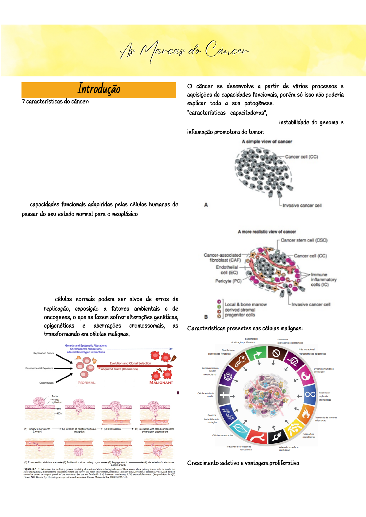 Sandy Vanessa Med 08 - UFPE-CAA Introdução 7 características do câncer: ● Crescimento seletivo e vantagem proliferativa ● Resposta alterada ao estresse, favorecendo a sobrevida global ● Vascularização ● Invasão e metástase ● Religação metabólica ● Microambiente cúmplice ● Modulação imunológica As Marcas do Câncer são propostas como um conjunto de capacidades funcionais adquiridas pelas células humanas de passar do seu estado normal para o neoplásico → capacidades que são cruciais para seu poder de formar tumores malignos. ● O objetivo das marcas é fornecer uma estrutura organizacional de propriedades celulares descobertas durante a transformação de células (fenotipicamente) normais - quer tal transformação pare em um estágio de crescimento benigno ou continue na direção de um estágio de crescimento mais evoluído e ameaça de malignidade. ● As células normais podem ser alvos de erros de replicação, exposição a fatores ambientais e de oncogenes, o que as fazem sofrer alterações genéticas, epigenéticas e aberrações cromossomais, as transformando em células malignas. O câncer se desenvolve a partir de vários processos e aquisições de capacidades funcionais, porém só isso não poderia explicar toda a sua patogênese. → Foram adicionadas as “características capacitadoras”, que são consequências da condição aberrante da neoplasia → instabilidade do genoma e inflamação promotora do tumor. Características presentes nas células malignas: Crescimento seletivo e vantagem proliferativa ● As células normais dependem da sinalização de crescimento de um ciclo celular fortemente regulado 1 Sandy Vanessa Med 08 - UFPE-CAA para proliferar de forma controlada e manter a homeostase dos tecidos → interrompido no caso de câncer. ● Considera-se que nas células cancerígenas, as vias de crescimento e sinalização proliferativa abrigam uma ou mais alterações de condução dentro de seus compartimentos, dando-lhes uma vantagem de sobrevivência. ● Incluem ligantes de crescimento, seus receptores ou moléculas de sinalização citosólica. Mecanismos Sinalização proliferativa sustentada ● O gatilho para isso ocorrer é a mutação de um ou mais genes (ex.: HER/2). 🌓 As células tumorais produzem substâncias/fatores de crescimento para o próprio tumor→ produção autócrina ● Produção de fatores de crescimento pelo microambiente tumoral. A mutação genética resulta na hiperexpressão/modificação de receptores transmembrana → importantes para o núcleo da célula receber o estímulo para continuar se multiplicando. Além disso, ainda pode haver modificação das vias de sinalização intracelular. Para que essa sinalização sustentada acontecer existem alguns condicionantes: ● Ligantes ○ Fatores de crescimento ● Receptores celulares ○ Superexpressos ○ Mutados ○ Degradação comprometida ● Sinalizadores citoplasmático → a ativação do núcleo para que ele continue se replicando acontece mesmo sem ter a sinalização dos receptores transmembrana. Hiperexpressão/modificação de receptores de membrana celular → Via de sinalização MAPK (via de ativação do RAS, que é um gene regulador da divisão celular) ● Nas membranas celulares há receptores transmembrana da família da tirosina quinase. Quando eles se ligam a um ligante, sofrem dimerização e isso ativa moléculas intracelulares, como o RAS. Estas ativam outras moléculas até chegarem ao núcleo. ● No caso do RAS, quando ele é ativado, se liga e ativa outra molécula, chamada de RAF. Esta irá fazer parte de um complexo molecular e ativar mais outras 2 moléculas (MEK e ERK). O ERK ativado vai até o núcleo e o sinaliza para replicação e transcrição. 🤙Modificação das vias de sinalização intracelular!! 2 Sandy Vanessa Med 08 - UFPE-CAA 💊 O cetuximabe bloqueia o receptor EGFR (receptor transmembrana). ● Se o paciente com tumor colorretal NÃO tiver mutação do K-RAS e usar cetuximabe, tem uma sobrevida maior. ● Nos pacientes que tem o K-RAS mutado, eles não precisam do receptor transmembrana para enviar a informação da replicação da célula, pois o K-RAS já é intracelular e estará ativado. Via de sinalização do HER/2 ● Quando o HER/2 é mutado, ele pode superexpressar esses receptores da membrana. ● Se houver + receptores, há ↑ dimerização ↑ cascata de ativação intracelular↑ replicação. ● 💊O trastuzumabe bloqueia o receptor HER/2.→ no câncer de mama, se a paciente apresenta mutação do HER/2 e utiliza o transtuzumabe a sobrevida é maior. 🤔 Tumores que superexpressam o HER/2: mama, gástrico, ovário, útero, pulmão. Evasão dos supressores tumorais É a característica do “freio”. Nesse caso, tem a alteração dos genes SUPRESSORES tumorais, como o TP53 e o retinoblastoma (RB). Ação do Gene p53 → reconhece alterações e corrige o processo. 3 Sandy Vanessa Med 08 - UFPE-CAA Pode haver perda da inibição do contato ● NF-2 ● Merlin ● e-Caderina → responsável pela adesão celular → se tenho pouca a célula fica frouxa e mais propensa a metástase Corrupção da via TGF-beta ● Quando é produzido pelo microambiente tumoral, funciona como um indicativo negativo para replicação celular. Resistência à morte celular Fisiologicamente, as células adotam uma variedade de respostas para se adaptarem ao estresse, se possível, ou, quando o estresse é insuportável, são altruisticamente eliminadas em prol de um tecido saudável inteiro. Esses mecanismos são subvertidos nas células cancerígenas para o resultado de sua sobrevivência e propagação global ● Uma resposta ao estresse associado à transformação, incluindo danos irreparáveis ao DNA, proliferação descontrolada ou descolamento da matriz, envolve morte celular por apoptose Os mecanismos de apoptose estão corrompidos. ● Circuito extrínseco → Fas, TBF, TRAIL ligante/re