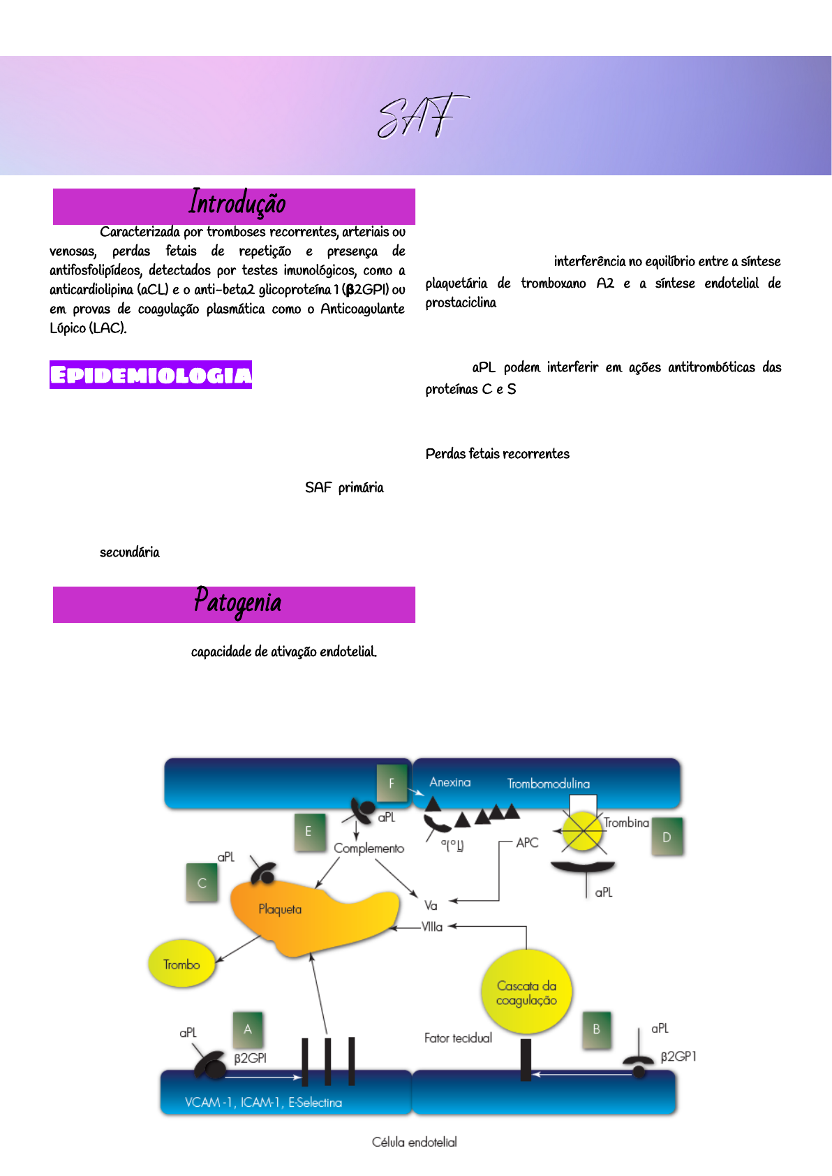 Sandy Vanessa Med 08 - UFPE-CAA Introdução Caracterizada por tromboses recorrentes, arteriais ou venosas, perdas fetais de repetição e presença de antifosfolipídeos, detectados por testes imunológicos, como a anticardiolipina (aCL) e o anti-beta2 glicoproteína 1 (β2GPI) ou em provas de coagulação plasmática como o Anticoagulante Lúpico (LAC). Epidemiologia ● Trombofilia adquirida mais comum ● Postula-se que 30% dos pacientes que se apresentam com TVP terão SAF, assim como outros 46% de pacientes que tiveram um AVE com menos de 50 anos. ● Pode ocorrer isolada, chamada de SAF primária, ou acompanhada por outras doenças sistêmicas autoimunes, particularmente o LES, sendo chamada de secundária. Patogenia Diversos mecanismos podem estar relacionados → um dos principais é relacionado à capacidade de ativação endotelial. ● Os anticorpos antifosfolípides, na ligação com o complexo cofator fosfolipídio, aumentam a expressão de moléculas de adesão endotelial e a síntese de citocinas e prostaglandinas. → Estado de hiperativação celular → trombose Indícios tbm apontam a interferência no equilíbrio entre a síntese plaquetária de tromboxano A2 e a síntese endotelial de prostaciclina → favorecimento do surgimento de eventos trombóticos. Alguns aPL podem interferir em ações antitrombóticas das proteínas C e S e que monócitos de indivíduos com aPL podem expressar maior quantidade de fator tecidual. Perdas fetais recorrentes ● Trombose dos vasos placentários. ● Outro mecanismo seria o deslocamento de anexina V de seus locais de ligação nos fosfolipídeos placentários. → Anexina V como um cofator placentário → anticoagulante natural presente na placenta e que exerce seu efeito ligando com fosfolipídeos, competindo com os aPL pela ligação com estes ● Papel do sistema complemento na fisiopatologia em questão. → C3a e C5a são potentes indutores de ativação das plaquetas e de células endoteliais. 1 Sandy Vanessa Med 08 - UFPE-CAA Trombose ● Inibição dos sistemas anticoagulantes naturais, juntamente com outras propriedades pró-coagulantes diretas e antifibrinolíticas. ● Ativação de vários tipos de células induzida por aPL, resultam em múltiplos efeitos pró-coagulantes e pró-inflamatórios + ativação do complemento → principais impulsionadores das complicações vasculares e obstétricas da síndrome antifosfolipídica (SAF). Ativação de células vasculares e imunológicas ● Regulação positiva de moléculas de adesão superficial e da liberação de citocinas pró-inflamatórias e substâncias pró-coagulantes, incluindo vesículas extracelulares e outros remanescentes celulares. ● As células que são ativadas em resposta ao aPL incluem células endoteliais, monócitos, neutrófilos e plaquetas. A importância relativa de cada tipo de célula na promoção da trombose provavelmente depende do leito vascular específico. Interações com sistemas de coagulação e fibrinolíticos – os aPL parecem interferir na atividade das proteínas anticoagulantes naturais, incluindo as proteínas S e C, bem como no sistema fibrinolítico, que decompõe a fibrina. ● Proteína C → aPL inibe a ativação da proteína C e a capacidade da proteína C ativada de inativar os fatores V e VIII (ou seja, resistência à proteína C ativada) ● Atividade antitrombina → os aPL também reduzem a atividade da antitrombina (AT), inibindo a ligação da heparina necessária para a ativação completa da AT . aPL com atividade contra a trombina pode reduzir ainda mais a inativação da trombina pela AT enquanto os anticorpos contra os fatores X e IX ativados também interferem na regulação negativa pela AT. ● Fibrinólise → o aPL pode inibir a fibrinólise neutralizando a capacidade do beta2GPI de estimular a ativação do plasminogênio tecidual (tPA) e a fibrinólise ● Interações com vias pró-coagulantes → A atividade do fator tecidual pode ser potencializada na SAF por meio da inibição do inibidor da via do fator tecidual (TFPI) em pacientes com anticoagulante lúpico (LA) positivo e/ou anticorpos anti-beta2GPI Também foi relatado que anticorpos anti-beta2GPI prejudicam a capacidade do beta2GPI de inibir a agregação plaquetária dependente do fator de von Willebrand (VWF). ● Anexina A5 → se liga à fosfatidilserina (PS) para formar uma rede bidimensional, ou "escudo anticoagulante", sobre os fosfolipídios expostos nas superfícies celulares. → O complexo de beta2GPI e anti-beta2GPI rompe esse escudo protetor, expondo o PS pró-coagulante e promovendo trombose. ● Ativação do complemento Fatores de risco adicionais ● LES ● Trombofilia hereditária ● Câncer ● Fumar ● Gravidez ● Uso de contraceptivos orais contendo estrogênio ● Imobilização ● Obesidade ● Hipertensão ● Hipercolesterolemia Testes Laboratoriais Diagnóstico baseado na detecção de aPL através de testes de ELISA para anticorpos anticardiolipina (aCL) e para anti-β2GPI ou através de ensaios funcionais da coagulação para a detecção de anticorpos com atividade de LAC. ● ELISA utiliza a cardiolipina como antígeno. → Em outros labs também são utilizados outros fosfolipídeos, como a fosfatidilserina e a fosfatidilcolina, misturados à cardiolipina. ● Alguns autores sugeriram que o ensaio para aβ2GPI seria mais específico para as manifestações de SAF que a cardiolipina, ● O termo LAC é usado para denominar os ensaios que detectam aPL com capacidade de prolongar testes da coagulação, em virtude de sua atividade inibitória. ● Os termos aCL e o anti-2GPI designam anticorpos que reagem positivamente em ensaios de fase sólida de ELISA, contendo como antígeno a cardiolipina. ● Em 10 a 15% dos pacientes o LAC pode ser positivo, e aCL, negativo, e o contrário também se aplica. ● O LAC costuma ser mais específico para as manifestações de SAF, porém os aCL são mais sensíveis. Anti