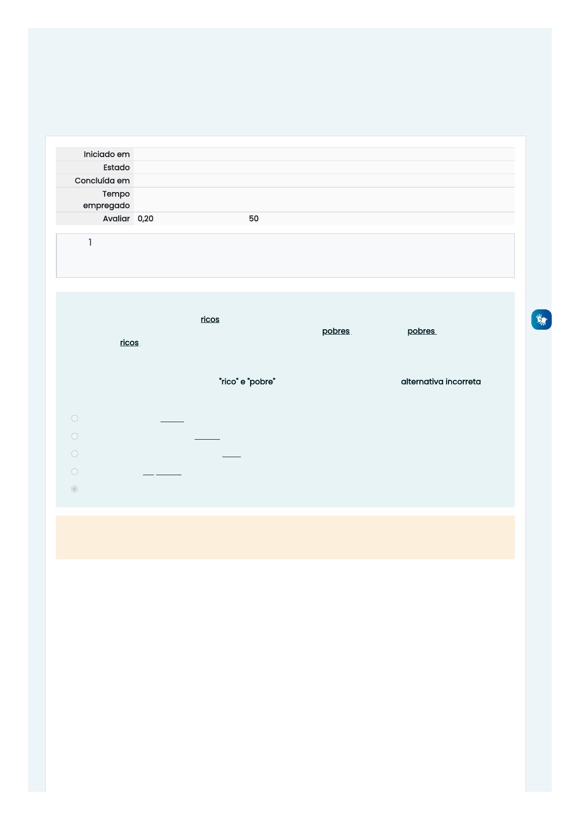 10/07/2021 AP2: Revisão da tentativa 1/4 Iniciado em sábado, 10 Jul 2021, 13:49 Estado Finalizada Concluída em sábado, 10 Jul 2021, 13:54 Tempo empregado 4 minutos 27 segundos Avaliar 0,20 de um máximo de 0,40(50%) Questão 1 Correto Atingiu 0,10 de 0,10 Leia o trecho abaixo: “Segundo a ONU, os subsídios dos ricos prejudicam o Terceiro Mundo de várias formas: 1. Mantêm baixo os preços internacionais, desvalorizando os exportações dos países pobres; 2. Excluem os pobres de vender para os mercados ricos; 3. Expõem os produtores pobres à concorrência de produtos mais baratos em seus próprios países.” (Folha de S. Paulo) Sabemos que uma palavra pode se comportar como substantivo ou adjetivo, dependendo do contexto em que está inserida. Considerando os termos "rico" e "pobre" do parágrafo acima, marque a alternativa incorreta: Escolha uma opção: a. Em "subsídios dos ricos" o termo grifado é substantivo. b. Na expressão "dos países pobres", o termo grifado é adjetivo. c. Na expressão "para os mercados ricos", o termo grifado é adjetivo. d. Em "excluem os pobres", o termo grifado é substantivo. e. O termo "ricos" é adjetivo nas duas ocorrências destacadas no texto. Sua resposta está correta. A resposta correta é: O termo "ricos" é adjetivo nas duas ocorrências destacadas no texto. https://ead.ifms.edu.br/ https://ead.ifms.edu.br/course/view.php?id=22096 https://ead.ifms.edu.br/course/view.php?id=22096§ion=3 https://ead.ifms.edu.br/mod/quiz/view.php?id=402159 10/07/2021 AP2: Revisão da tentativa 2/4 Questão 2 Incorreto Atingiu 0,00 de 0,10 Questão 3 Incorreto Atingiu 0,00 de 0,10 Alguns substantivos mudam de significado quando usados no masculino ou feminino. Marque a alternativa em que o substantivo destacado deve ser usado no feminino: Escolha uma opção: a. Carlos é ___________ da equipe. (o cabeça / a cabeça) b. José, levante __________. Ânimo, meu rapaz! (o moral / a moral) c. Liguei para ___________ para ouvir músicas. (o rádio / a rádio) d. Comprei ____________ gramas de mortadela. (duzentos / duzentas) e. Não tenho ____________ para comprar um carro novo. (o capital / a capital) Sua resposta está incorreta. A resposta correta é: Liguei para ___________ para ouvir músicas. (o rádio / a rádio) Marque a alternativa em que a classificação das palavras destacadas está correta, respectivamente: "Eu tenho o sono muito leve, e numa noite dessas notei que havia alguém andando sorrateiramente no quintal de casa". (Luís Fernando Veríssimo) Escolha uma opção: a. pronome, advérbio, verbo, substantivo, conjunção b. substantivo, adjetivo, verbo, substantivo, preposição c. pronome, adjetivo, verbo, pronome, preposição d. substantivo, adjetivo, verbo, pronome, conjunção e. pronome, advérbio, verbo, substantivo, preposição Sua resposta está incorreta. A resposta correta é: pronome, adjetivo, verbo, pronome, preposição 10/07/2021 AP2: Revisão da tentativa 3/4 Questão 4 Correto Atingiu 0,05 de 0,05 Leia a letra da música 'Esse cara", de Caetano Veloso, gravada por Maria Bethânia: Ah! Que esse cara tem me consumido A mim e a tudo que eu quis Com seus olhinhos infantis Como os olhos de um bandido Ele está na minha vida porque quer Eu estou pra o que der e vier Ele chega ao anoitecer Quando vem a madrugada, ele some Ele é quem quer Ele é o homem Eu sou apenas uma mulher… Com relação às palavras usadas no texto, marque a alternativa incorreta: Escolha uma opção: a. A interjeição inicial indica um sentimento misto de lamento e saudade. b. O uso do diminutivo no par "olhos/olhinhos" dão uma ambiguidade ao comportamento do homem de quem o eu lírico fala. c. Em "tem-me consumido" e " a mim", a repetição do pronome pessoal em primeira pessoa reforça o sentimento do eu lírico. d. Nos dois versos finais, o uso dos artigos definido/indefinido (o homem, uma mulher) indica que a mulher está segura sente-se segura e superior neste relacionamento. e. O pronome pessoal "Ele" tem o mesmo referente em todas as ocorrências do texto. Sua resposta está correta. A resposta correta é: Nos dois versos finais, o uso dos artigos definido/indefinido (o homem, uma mulher) indica que a mulher está segura sente-se segura e superior neste relacionamento. 10/07/2021 AP2: Revisão da tentativa 4/4 Questão 5 Correto Atingiu 0,05 de 0,05 Leia um trecho da música 'Tijolão" gravada por Jorge e Matheus: "Eu vou trocar meu celular num Nokia tijolão Que só manda mensagem e faz ligação Se eu ver mais um vídeo seu, sem eu, sendo feliz Certeza que a minha vida vai 'tá por um triz" Me mata não, essa internet virou arma na sua mão (...)" Marque a alternativa que analisa erroneamente as palavras do texto: Escolha uma opção: a. "Vou trocar" é uma variante coloquial da forma verbal no futuro "trocarei". b. "Virou" é a forma verbal no pretérito perfeito do indicativo e significa que o interlocutor do eu lírico já usa a internet há algum tempo. c. Os pronomes de primeira pessoa (meu, eu, me) indicam que o eu lírico põe seus sentimentos em destaque na canção. d. A forma no aumentativo "tijolão" é substantivo e faz referência ao tamanho do tijolo. e. O uso correto do pronome de primeira pessoa na expressão "sem eu" deveria ser "sem mim". Sua resposta está correta. A resposta correta é: A forma no aumentativo "tijolão" é substantivo e faz referência ao tamanho do tijolo. https://ead.ifms.edu.br/mod/quiz/view.php?id=402158&forceview=1 https://ead.ifms.edu.br/admin/tool/dataprivacy/summary.php https://download.moodle.org/mobile?version=2020061503.02&lang=pt_br&iosappid=633359593&androidappid=com.moodle.moodlemobile