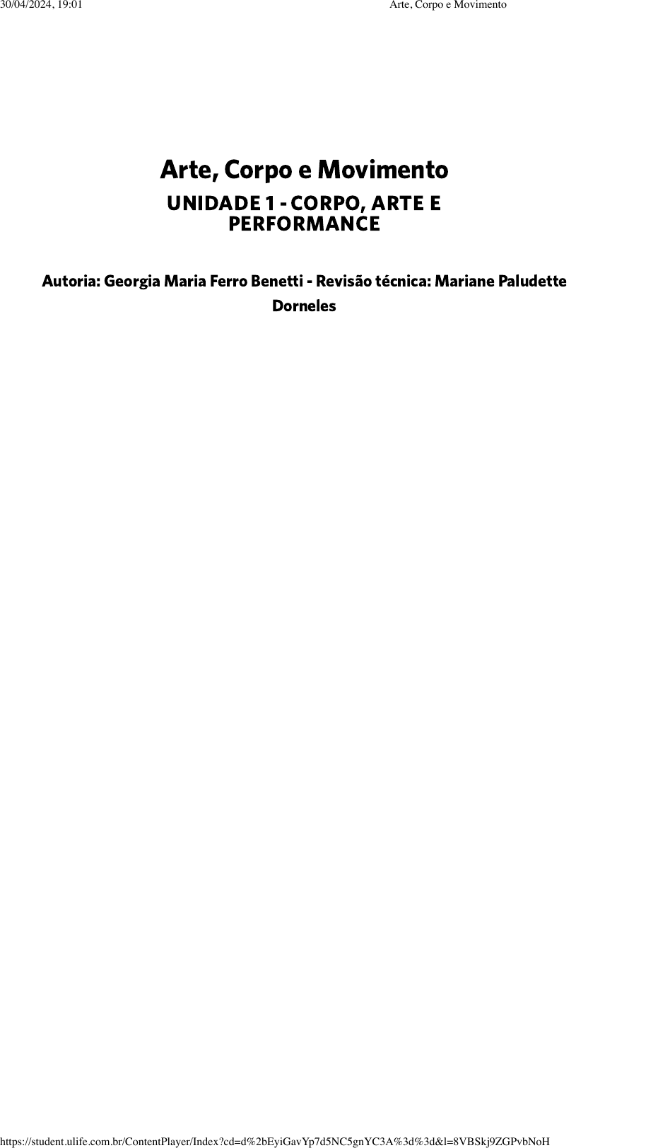 Autoria: Georgia Maria Ferro Benetti - Revisão técnica: Mariane Paludette Dorneles Arte, Corpo e Movimento UNIDADE 1 - CORPO, ARTE E PERFORMANCE 30/04/2024, 19:01 Arte, Corpo e Movimento https://student.ulife.com.br/ContentPlayer/Index?cd=d%2bEyiGavYp7d5NC5gnYC3A%3d%3d&l=8VBSkj9ZGPvbNoHsYgRBHA%3d%3d&lc=JM9dU%2b… 1/22 Você já se perguntou quais foram as primeiras manifestações artísticas da humanidade e como o corpo vem se apresentando a partir delas ao longo da história? Pois nesta unidade conheceremos algumas possibilidades de uso das linguagens corporais em arte, as quais têm sido reconhecidas como relevantes no campo. Além disso, teremos acesso a conteúdos que apresentam aspectos históricos do desenvolvimento da arte, refletindo a respeito de como o corpo se mostra enquanto materialidade em diferentes perspectivas do fazer arte. Inclusive, você já fez essas conexões antes, questionando as possibilidades de interação entre corpo e arte, quando contextualizadas no campo das artes visuais e de cena? Já refletiu sobre as possíveis interfaces entre corpo e arte e como elas se relacionam com os processos de ensino e aprendizagem na escola? É importante que tomemos tais questionamentos como nossos agora que iniciamos uma jornada de construção de conhecimentos, caminhando pelas relações entre arte, cultura e sociedade. O percurso é longo e abrangente, por isso, recortes estratégicos foram aplicados para favorecer os estudos, destacando aspectos sócio-históricos que são essenciais para se compreender as intersecções entre corpo, arte e performance no cenário do ensino de artes. Bons estudos! Introdução 1.1 Arte, cultura e sociedade Para falarmos sobre arte, é preciso situarmos o tema no campo das suas relações com a cultura e a sociedade. Essas três palavras correspondem a criações humanas que estão fortemente ligadas entre si. Embora cada uma delas possa ser vista de modo particular, são inseparáveis. Nesse sentido, ao longo deste primeiro tópico, entenderemos um pouco melhor quanto ao conceito de arte e sua ligação com a cultura, a organização social, o corpo e este enquanto obra de arte. Acompanhe o conteúdo com atenção! 1.1.1 Arte e cultura 30/04/2024, 19:01 Arte, Corpo e Movimento https://student.ulife.com.br/ContentPlayer/Index?cd=d%2bEyiGavYp7d5NC5gnYC3A%3d%3d&l=8VBSkj9ZGPvbNoHsYgRBHA%3d%3d&lc=JM9dU%2b… 2/22 A arte é, talvez, uma das criações humanas mais antigas de que temos conhecimento. Os primeiros registros artísticos datam a pré-história e são anteriores à escrita ou a outras criações da humanidade, como religião e política. Por estarem relacionados à uma época tão remota, não conseguimos resgatar os motivos que levaram os seres humanos a se manifestarem por meio de linguagens artísticas. Contudo, exercitando nossa capacidade de interpretação, acredita-se que a arte seja uma consequência do desejo humano de se expressar. Assim, a arte é considerada uma forma de manifestação cultural. No entanto, o que é cultura? A compreensão de cultura tem variado bastante com o tempo, sendo que seu conceito é interesse de diversas áreas de conhecimento das ciências humanas. Entre as possibilidades, escolhemos aqui a perspectiva antropológica para definir um entendimento sobre o que é a cultura. Nessa abordagem, a cultura é vista como algo que nasce da convivência social de pessoas que se reconhecem como semelhantes ou diferentes, agrupando-se ou se separando conforme características físicas, crenças religiosas, ocupação territorial, modos de produção, sistemas econômicos, entre outros fatores. De acordo com Biancalana (2011), a cultura é composta por um conjunto de significados, atitudes e valores compartilhados que operam como um sistema. Essa reunião de elementos se reflete em nas criações artísticas, de modo que cada tempo e lugar possuem suas imagens e obras possíveis. A arte tem dimensões antropológica e sociológica, mas também empregamos recursos artísticos e performáticos nos modos como convivemos em sociedade e nos valemos deles em ritos e cerimônias de cunho social. Um exemplo que nos permite identificar como isso funciona são as danças reconhecidas como típicas de determinadas épocas e lugares. Elas reúnem um conjunto de movimentação, música e caracterização que lhe confere caráter único. É o caso das danças folclóricas indianas, gauchescas e danças de salão, a exemplo do rockabilly, charleston, tango, entre outras imagináveis. A interface com as culturas pode fazer surgir linguagens corporais particulares. No oriente, os olhos são considerados as janelas, ao passo que a dança é a expressão da alma. Talvez por isso a direção do olhar tem papel fundamental nas artes de cena oriental, em que normalmente se destacam como recursos expressivos. Observe a figura a seguir para compreender. Figura 1 - Os olhos são expressivos nas danças orientais Fonte: JN STUDIO, Shutterstock, 2021. 30/04/2024, 19:01 Arte, Corpo e Movimento https://student.ulife.com.br/ContentPlayer/Index?cd=d%2bEyiGavYp7d5NC5gnYC3A%3d%3d&l=8VBSkj9ZGPvbNoHsYgRBHA%3d%3d&lc=JM9dU%2b… 3/22 #PraCegoVer: na figura, temos a fotografia de uma dançarina em um palco. Ela está sentada, com o tronco virado para a direita e a cabeça levemente virada para a esquerda. Seu olhar segue a mesma direção. Ela está com a perna esquerda dobrada para trás, enquanto a direita está dobrada para frente, como se estivesse de joelhos. Suas mãos apoiam no joelho da perna direita. No fundo, há uma cortina preta que está fechada. Com base no que estudamos até aqui, você já pode deduzir que diferentes culturas influenciam as manifestações artísticas, definindo expressões e possibilidades de presença e uso do corpo. Agora que sabe a respeito disso, pode passar a observar e registrar diversos exemplos de como a cultura marca as expressões artística e material dos corpos. Isso também ocorre pela força d