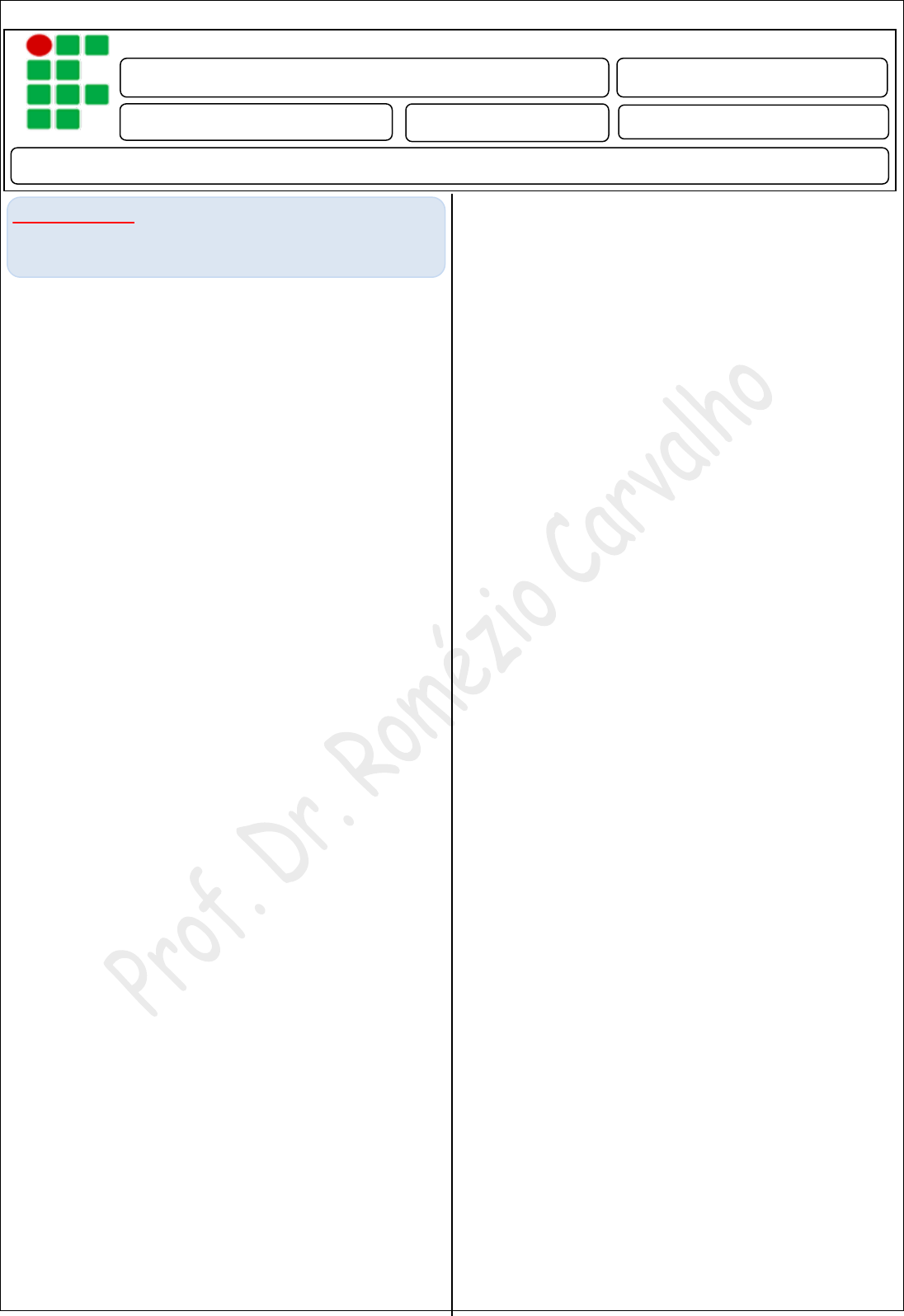 “Descobri que, se você tem vontade de viver e curiosidade, dormir não é a coisa mais importante.” (Martha Stewart) Campus Piripiri Prof.: Dr. Romézio Carvalho Séries: 1º ano Disciplina: Química Título: Reações Químicas 1 Aluno(a): ____________________________________________________________________ Nº. ____ Data: 21/01/2021 INSTITUTO FEDERAL DE EDUCAÇÃO, CIÊNCIA E TECNOLOGIA DO PIAUÍ 1 (PUC-RS) A magnetita, importante minério de ferro que deu origem às bússolas, forma-se no interior da Terra pela reação expressa na equação a seguir: x FeO(s) + y CO2(g) → z Fe3O4(s) + w CO(g) Os coeficientes estequiométricos x, y, z e w que tornam a equação corretamente balanceada são, respectivamente: (A) 2, 1, 1, 1. (B) 3, 2, 3, 2. (C) 4, 1, 2, 1. (D) 3, 1, 1, 1. (E) 2, 2, 1, 2. 2 (UFMG) A equação Ca(OH)2 + H3PO4 → Ca3(PO4)2 + H2O não está balanceada. Balanceando-a com os menores números possíveis, a soma dos coeficientes estequiométricos será: (A) 4. (B) 7. (C) 10. (D) 11. (E) 12. 3 (UEM-PR) Considere a reação de combustão completa de hidrogênio gasoso, balanceada em menores números inteiros. Comparando-se os reagentes com o produto da reação, pode-se dizer que eles apresentam igual: I. número total de moléculas; II. número total de átomos; III. massa. Dessas afirmações: (A) apenas I é correta. (B) apenas II é correta. (C) apenas I e II são corretas. (D) apenas II e III são corretas. (E) apenas I e III são corretas. 4 (PUC-PR) Fazendo-se a classificação das reações abaixo: I. CuSO4 + 2 NaOH → Cu(OH)2 + Na2SO4 II. Cu(OH)2 → CuO + H2O III. Zn + 2AgNO3 → 2Ag + Zn(NO3)2 IV. NH3 + HCl → NH4Cl a ordem correta é: (A) Decomposição, simples troca, dupla-troca, adição. (B) Dupla-troca, adição, simples troca, análise. (C) Dupla-troca, análise, deslocamento, síntese. (D) Deslocamento, análise, dupla-troca, adição. (E) Dupla-troca, decomposição, síntese, simples troca. 5 (FEEVALE-RS) O processo de revelação de uma fotografia envolve várias etapas, sendo uma delas a fixação da imagem. Nessa etapa, são utilizados os chamados fixadores, que contêm as substâncias químicas: tiossulfato de amônio, tiossulfato de sódio e sulfito de sódio, além de ácido acético ou ácido cítrico e formaldeído. Determine a alternativa correta que apresenta a classificação do tipo de reação que ocorre entre o cloreto de prata e o tiossulfato de sódio, segundo a equação: 2 AgCl + Na2S2O3 → Ag2S2O3 + 2 NaCl (A) Síntese. (B) Dupla-troca. (C) Deslocamento. (D) Decomposição. (E) Combustão. “Não permita que aquilo que você não pode fazer interfira naquilo que você pode fazer.” John Wooden BOM ESTUDO! OBSERVAÇÃO: As respostas serão aceitas somente via o preenchimento do gabarito no Google Formulários (link de acesso na Sala de aula virtual). 2