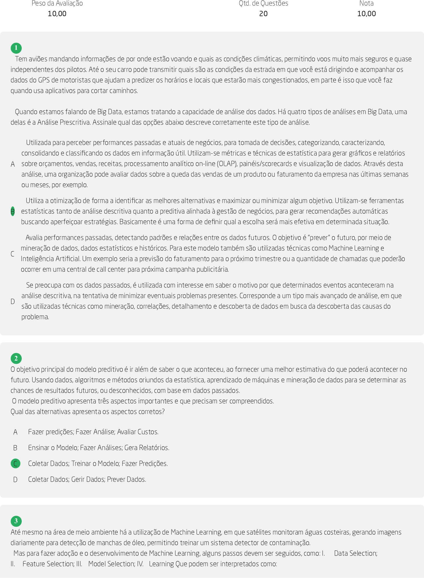 Peso da Avaliação 10,00 Qtd. de Questões 20 Nota 10,00 Tem aviões mandando informações de por onde estão voando e quais as condições climáticas, permitindo voos muito mais seguros e quase independentes dos pilotos. Até o seu carro pode transmitir quais são as condições da estrada em que você está dirigindo e acompanhar os dados do GPS de motoristas que ajudam a predizer os horários e locais que estarão mais congestionados, em parte é isso que você faz quando usa aplicativos para cortar caminhos. Quando estamos falando de Big Data, estamos tratando a capacidade de análise dos dados. Há quatro tipos de análises em Big Data, uma delas é a Análise Prescritiva. Assinale qual das opções abaixo descreve corretamente este tipo de análise. A Utilizada para perceber performances passadas e atuais de negócios, para tomada de decisões, categorizando, caracterizando, consolidando e classificando os dados em informação útil. Utilizam-se métricas e técnicas de estatística para gerar gráficos e relatórios sobre orçamentos, vendas, receitas, processamento analítico on-line (OLAP), painéis/scorecards e visualização de dados. Através desta análise, uma organização pode avaliar dados sobre a queda das vendas de um produto ou faturamento da empresa nas últimas semanas ou meses, por exemplo. B Utiliza a otimização de forma a identificar as melhores alternativas e maximizar ou minimizar algum objetivo. Utilizam-se ferramentas estatísticas tanto de análise descritiva quanto a preditiva alinhada à gestão de negócios, para gerar recomendações automáticas buscando aperfeiçoar estratégias. Basicamente é uma forma de definir qual a escolha será mais efetiva em determinada situação. C Avalia performances passadas, detectando padrões e relações entre os dados futuros. O objetivo é “prever” o futuro, por meio de mineração de dados, dados estatísticos e históricos. Para este modelo também são utilizadas técnicas como Machine Learning e Inteligência Artificial. Um exemplo seria a previsão do faturamento para o próximo trimestre ou a quantidade de chamadas que poderão ocorrer em uma central de call center para próxima campanha publicitária. D Se preocupa com os dados passados, é utilizada com interesse em saber o motivo por que determinados eventos aconteceram na análise descritiva, na tentativa de minimizar eventuais problemas presentes. Corresponde a um tipo mais avançado de análise, em que são utilizadas técnicas como mineração, correlações, detalhamento e descoberta de dados em busca da descoberta das causas do problema. O objetivo principal do modelo preditivo é ir além de saber o que aconteceu, ao fornecer uma melhor estimativa do que poderá acontecer no futuro. Usando dados, algoritmos e métodos oriundos da estatística, aprendizado de máquinas e mineração de dados para se determinar as chances de resultados futuros, ou desconhecidos, com base em dados passados. O modelo preditivo apresenta três aspectos importantes e que precisam ser compreendidos. Qual das alternativas apresenta os aspectos corretos? A Fazer predições; Fazer Análise; Avaliar Custos. B Ensinar o Modelo; Fazer Análises; Gera Relatórios. C Coletar Dados; Treinar o Modelo; Fazer Predições. D Coletar Dados; Gerir Dados; Prever Dados. Até mesmo na área de meio ambiente há a utilização de Machine Learning, em que satélites monitoram águas costeiras, gerando imagens diariamente para detecção de manchas de óleo, permitindo treinar um sistema detector de contaminação. Mas para fazer adoção e o desenvolvimento de Machine Learning, alguns passos devem ser seguidos, como: I. Data Selection; II. Feature Selection; III. Model Selection; IV. Learning Que podem ser interpretados como: 1 2 3 P - escolher as características dos dados empregados é um passo muito importante. Deve-se indicar os dados menos sensíveis a ruídos e que sejam mais fáceis de serem manipulados. Nesta ocasião é realizada a divisão entre os dados que serão utilizados para treinamento do modelo e os dados para realização dos testes. Q- carece iniciar por modelos mais simples e acrescentar a complexidade se necessário. Este modelo é uma parte de uma realidade ocorrida, em que se deve obter total controle sobre aquilo que aconteceu. Desta forma será possível realizar as fases seguintes de treinamento e testes identificando se o algoritmo será capaz de prever com o maior nível de assertividade. R- a assimilação dos dados que serão empregados para atingir o objetivo é essencial para o acontecimento do projeto. Este processo compreende a limpeza, seleção e adequação dos dados que serão empregados. Se você não tem os dados adequados, não há como buscar fazer previsões. S- a etapa de treinamento é bem importante para que o processo seja concluído com êxito. Aproxime os parâmetros adequados que minimizem o erro do algoritmo. Entenda que o algoritmo precisa destes parâmetros e dos resultados para saber como se comportar nas fases posteriores. Relacione cada passo à interpretação e marque a opção correta: A I – S; II – P; III – Q; IV – R. B I – R; II – P; III – Q; IV – S. C I – R; II – S; III – Q; IV – P. D I – P; II – Q; III – R; IV – S. Alguns autores afirmam que a IoT não se resume apenas em aplicações e objetos, sensores e Internet, ou ainda, não apenas em infraestrutura, tecnologia, objetos e software. Ainda existem os vértices denominados wearables. As informações a seguir podem ser geradas por Wearables: ( ) Exercícios físicos. ( ) Informações de saúde. ( ) Melhoria da alimentação. ( ) Encontrar promoções. ( ) Conexão com mídias sociais. ( ) Pagamento de contas. Classifique as sentenças acima como (V) verdadeiro ou (F) falso. Em seguida, marque a alternativa que apresenta a sequência correta: A V; V; V; V; V; V. B F; F; V; F; V; F. C V; V; F; F; V; V. D V; F; F; F; V; V. É difícil fa