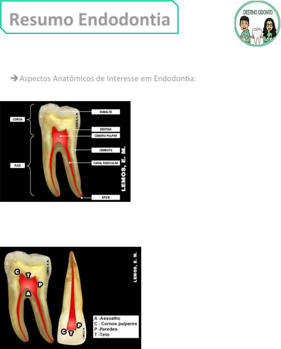@destinodonto Aspectos Anatômicos de Interesse em Endodontia: - A câmara pulpar geralmente acompanha o formato da coroa do dente. Mas a morfologia pulpar pode se alterar, como resposta às agressões sofridas. - A polpa é maior nos indivíduos jovens, que nos idosos. - Os canais tem forma irregular na quase totalidade dos casos. - A Câmara Pulpar abriga a polpa coronária, e o Canal Radicular abriga a polpa radicular. - A Câmara Pulpar possui teto, parede vestibular, parede lingual, parede mesial e parede distal. O assoalho só esta presente nos dentes com mais de uma raiz. A: Assoalho C: Cornos Pulpares T: Teto P: Paredes Laterais 1 @destinodonto Resumo Endodontia ->Ramificações radiculares são frequentes no terço apical, comuns no terço médio e raras no terço cervical. ->Canal Principal: Está presente no eixo longitudinal do dente. Segue do teto da câmara coronária ao forame apical. ->Canal Colateral: É paralelo ao canal principal, pode ou não alcançar isoladamente o forame apical. Possui menor volume que o canal principal. Se comunica com o canal principal. - É bem comum no IC inferior e no PM inferior. ->Canal Lateral (Adventício): Presente no terço cervical e começo do terço médio. Caminha em direção ao ligamento periodontal. ->Canal Secundário: Presente no terço apical, sai do canal principal e caminha em direção ao ligamento periodontal. ->Canal Acessório: Sai do canal secundário e caminha em direção ao ligamento periodontal. ->Intercanal (Interconduto): Liga o canal principal ao canal colateral. ->Canal Recorrente: Parte do canal principal, percorre um pequeno trecho e retorna ao canal principal. Não chega isoladamente a região apical. ->Canal Reticular: É o entrelaçamento de 3 ou mais canais que caminham paralelamente, a partir de ramificações do intercanal. ->Delta Apical: São as várias derivações que partem do canal principal na região apical e, originam forames múltiplos. - Embora os túbulos dentinários só possam ser vistos microscópicamente, várias bactérias podem se alojar nele. - No tratamento endodontico, nós só limpamos mecanicamente o canal principal. Os demais canais são limpos por difusão das substâncias utilizadas. - Para haver sucesso endodontico o canal deve ser limpo, desinfetado e preenchido corretamente (obturado). 2 Dicas Para a Clínica Elementos de Diagnóstico: Conjunto de testes e procedimentos realizados afim de chegar ao diagnóstico correto. (Tanto das alterações da polpa como das alterações do periápice). Sequência para Diagnóstico em Endodontia: Características Clinicas da Dor: 3 Anamnese Exame Clínico Teste de Sensibilidade Pulpar Exames Por Imagem Frequência Intermitente Contínua Origem Localizada Difusa Condição do Aparecimento Provocada Espontânea Duração Curta : Após a remoção do agente causador, a dor passa. Longa: Após a remoção do agente causador, a dor lentamente vai desaparecendo. Fatores Atenuantes Frio Quente Anamnese Qualidade da Sensação Dolorosa: - Leve: Pouco doloroso. - Moderada: Dor Suportável. - Severa: Dura semanas ou meses. - Aguda: Surge repentinamente e tem duração limitada. - Pulsátil: latejante. - Lancinante: Pontadas, picadas, fisgadas internas. Extra-oral: - Inspeção: Assimetrias Faciais. (Deve ser feita com o paciente devidamente posicionado e iluminação adequada) - Palpação: Tem por finalidade detectar e analisar as regiões que denotem aumento de volume, alteração na consistência, limites marginais da tumefação, grau de fixação ou mobilidade e sensibilidade. 4 Intra-oral: Exame Clínico - Inspeção: Avaliar dentes e tecidos moles (Edemas,Fístulas,Áreas Avermelhadas). - Palpação: Palpar a região apical exercendo uma leve pressão para avaliar a sensibilidade dos dentes e edemas. - Percussão Vertical: O teste de percussão vertical é aquele em que com um dedo ou instrumento clínico iremos exercer uma leve pressão no sentido paralelo ao longo eixo do dente. -> se o resultado for positivo é porque sugere um processo inflamatório periapical. - Percussão Horizontal: O teste de percurssão horizontal é aquele em que com o dedo ou instrumento clínico iremos exercer uma leve pressão no sentido perpendicular ao longo eixo do dente. -> se o resultado for positivo é porque sugere um processo inflamatório no periodonto da região. 5 Também conhecido como Testes de Vitalidade Pulpar, tem como objetivo estimular as fibras nervosas da polpa. Att: - Os testes térmicos possuem potencial para agravar a situação de uma polpa inflamada! - O teste Elétrico não permite informações sobre o suprimento sanguíneo pulpar, fator que determina a vitalidade pulpar! - Uma resposta Positiva aos teste térmicos nem sempre comprovará uma alteração patológica pulpar! 6 • Frio • CalorTérmicos • Abertura Coronária e Remoção do Tecido Cariado Sem Anéstesia.Cavidade • Corrente Elétrica - Uso de um aparelho específico.Elétrico • Teste para saber se a dor é difusa ou localizada, caso a dor passe, o dente anestesiado é o dente origem da dor.Anestesia Testes de Sensibilidade Pulpar Dente Origem da Dor. Dente que Reflete a Dor. - O Profissional Deve ter muita atenção antes de realizar qualquer procedimento clínico, pois o paciente durante a anamnese e exames pode relatar que a dor vem do dente sinálgico, porém ele só reflete a dor que é de origem de outro dente (Dente Algógeno), essa devida atenção previne uma intervenção incorreta! Radiografia Periapical : Nesse exame iremos avaliar não só a presença de cáries ou qualquer alteração na câmara pulpar desse dente, como devemos avaliar a porção radicular e por fim a porção periapical. [Avaliando a presença de áreas radiolúcidas ou radiopacas que podem sugerir alterações na região do periápice]. Tomografia Computadorizada. 7 Dor Reflexa Dente Algógeno Dente Sinálgico Exames Por Imagem Teoria Hemodinâmica - Essa teoria explica porque as raíze