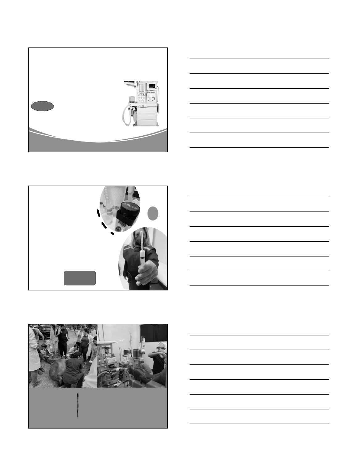 23/04/2024 1 Prof. Dra. THAIZA TAVARES EQUIPAMENTOS E CIRCUITOS ANESTÉSICOS Cap 3 1 INALATÓRIA X TIVA Equipamentos Poluição ambiental ü Maior controle de plano anestésico ü Biotransformação e eliminação rápida ü Recuperação rápida ü Administração de O2 ü Maior segurança em pacientes de alto risco ü Economia de anestésico ü Tempo anestésico ajustado de acordo com a necessidade 2 EQUIPAMENTOS 3 23/04/2024 2 INSTRUMENTAL üTodo material empregado pelo anestesista üLANTERNA üLARINGOSCÓPIO üSONDAS ENDOTRAQUEAIS üMagill üPINÇA TIRA-LÍNGUA üABRE-BOCA üMÁSCARAS üLIDOCAÍNA SPRAY/GEL 4 5 TUBOS ENDOTRAQUEAIS 6 23/04/2024 3 MÁSCARA LARÍGEA 7 8 9 23/04/2024 4 10 TUBOS ENDOTRAQUEAIS 11 SONDAS ENDOTRAQUEAIS 12 23/04/2024 5 FÓRMULA • PESO X 4 = número da sonda • 10kg • 13kg • 24kg • 56kg 2 13 SONDAS ENDOTRAQUEAIS 14 15 23/04/2024 6 CUFÔMETRO 16 17 ACESSÓRIOS • CILÍNDRO • COMPRESSORES • concentradores • VÁLVULAS REDUTORAS • 200 a 250 kg/cm2 (cilindro) • 4 kg/cm2 (aparelho) • EXTENSORES • chicotes 18 23/04/2024 7 19 CONCENTRADOR DE OXIGÊNIO 20 APARELHOS üVariedade de equipamentos üEquipamentos simples a sofisticados üCaros üEsquema simples üLiberar oxigênio üMisturar o gás anestésico üRemoção de gás carbônico 21 23/04/2024 8 APARELHO PARA RESPIRAÇÃO ESPONTÂNEA üFonte de fluxo diluente üFluxômetro (rotâmetro) üVaporizador üUniversal üCalibrado üFiltro circular üTraqueia üVálvulas inspiratória e expiratória üCaníster üCal sodada (20-25 horas) 22 VAPORIZADORES 23 24 23/04/2024 9 CANÍSTER Violeta de etila 25 ROTÔMETRO/FLUXÔMETRO L/minmL/min 26 VENTILADORES üRespiradores üAnestesia com respiração controlada üAjustar o fluxo, a pressão e o volume corrente üInspiração/expiração 1:1 27 23/04/2024 10 BALÃO RESERVATÓRIO üParte que se distende do circuito üTamanho: no mínimo o volume corrente do animal üV= 8-20mL/kg(volume corrente) ü1-3 vezes o volume corrente do paciente 28 VÁLVULA POP-OFF 29 CIRCUITOS ANESTÉSICOS üPEÇA EM "T" DE AYRES üCIRCUITO DE BAIN üCIRCUITO VAIVÉM DE WATERS üCIRCUITO COM VÁLVULA NÃO-REINALATÓRIA üSISTEMA CIRCULAR üSISTEMA VALVULAR Não reinalatório - Baraka - Bain Reinalatório -valvular circular 30 23/04/2024 11 PEÇA EM "T" DE AYRES 31 CIRCUITO DE BAIN üSimples üPrático üNão requer caníster üPoluição da sala cirúrgica 32 CIRCUITO VAIVÉM DE WATERS üVálvula de alívio üCaníster üPoder ser adaptado tanto à máscara como à sonda endotraqueal 33 23/04/2024 12 CIRCUITO COM VÁLVULA NÃO- REINALATÓRIA üAmbu üRuben üStephen-Slatter üNão há reinalação üÉ indicada para respiração controlada üNão permite acúmulo de C02 (hipercapnia) no paciente üPolui ambiente cirúrgico üOcasiona um gasto maior de anestésico 34 SISTEMA CIRCULAR üÉ o mais empregado em rotina anestesiológica üEconomia de anestésico associada à segurança e à facilidade de manipulação 35 SISTEMA VALVULAR 36 23/04/2024 13 BARAKA 37 FLUXÔMETRO/ROTÔMETRO 38 PRINCIPAIS PROBLEMAS COM EQUIPAMENTOS ANESTÉSICOS üBalão de reinspiração vazio üBalão de reinspiração esta superestendido üPaciente superfializando üPaciente profundo 39 23/04/2024 14 RESUMO 40 41