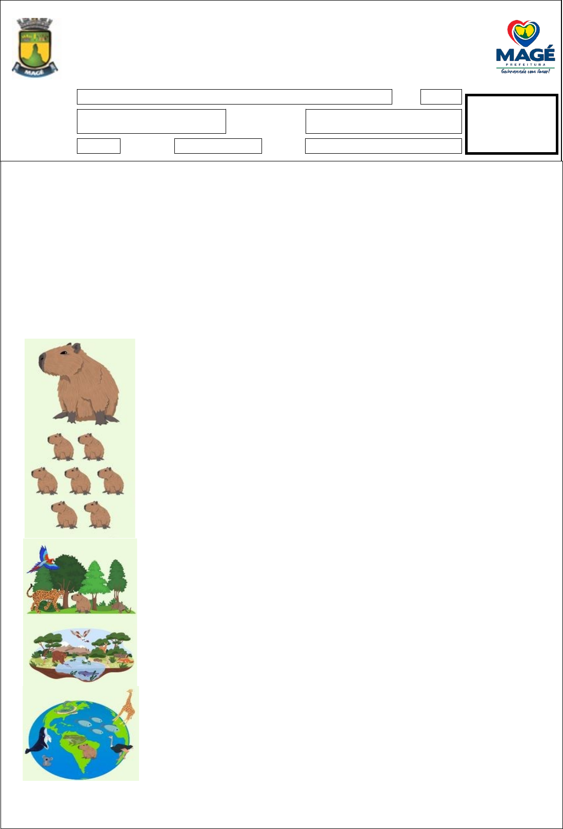 PREFEITURA MUNICIPAL DE MAGÉ SECRETARIA MUNICIPAL DE EDUCAÇÃO E CULTURA E.M. MARIA CLARA MACHADO CONCEITO: ______ Aluno: N.º: Disciplina: CIÊNCIAS Professor(a): LARISSA SOUZA Ano: 6º Turma: 604 Data: 1) Como é chamada a ciência que estuda os seres vivos e suas interações entre si e com o ambiente que vivem? Marque um X na alternativa correta: (1,0 ponto) ( ) Ecossistema ( ) Ecografia ( ) Ecoturismo ( ) Ecologia 2) Relacione as imagens e os conceitos de níveis de organização abaixo: (2,0 ponto) · Comunidade · Ecossistema · Biosfera · Organismo · Biosfera · · · · · 3) Marque um X na imagem que representa uma CADEIA ALIMENTAR: (1,0 ponto) 4) Observe o esquema de cadeia alimentar ao lado e escreva: P para PRODUTORES, C para CONSUMIDORES e D para DECOMPOSITORES (2,0 ponto) 5) Seres autotróficos são organismos capazes de produzir seu próprio alimento. Exemplo: plantas, algas e algumas bactérias. Já os seres heterotróficos são organismo incapazes de produzir seu alimento, necessitando de outro ser vivo para sua nutrição. Exemplo: animais, fungos, protozoários e algumas bactérias. Com base no texto acima responda: (2,0 pontos) a) A planta é um ser autotrófico ou heterotrófico? ________________________________________ b) O coelho é um ser autotrófico ou heterotrófico? _______________________________________ 6) Monte duas cadeias alimentares a partir da Teia alimentar abaixo: (2,0 pontos) ______________________________________________________________________________________________________________________________________________________________________________________________________________________________________________________________________________________________________________________________ image3.jpeg image5.png image6.jpeg image7.jpeg image1.png image4.png image2.png