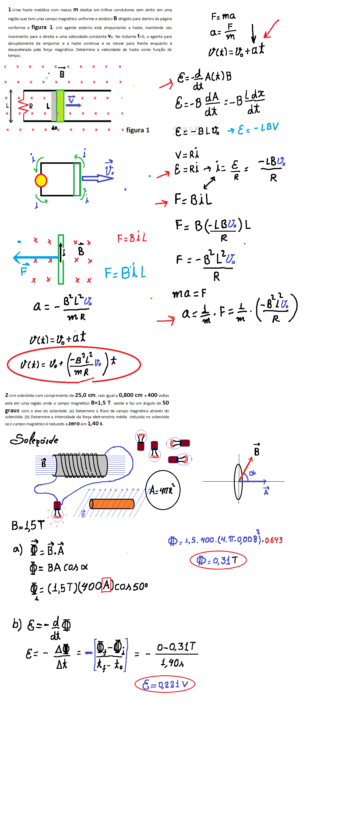 2- Um solenóide com comprimento de 25,0 cm, raio igual 0,800 cm e 400 voltas está em uma região onde o campo magnético B=1,5 T existe faz um ângulo de 50 graus com o eixo do solenóide. (a) Determine o fluxo de campo magnético através do (b) Determine a intensidade da força eletromotriz média induzida no solenóide se campo magnético é reduzido zero em B 2 4TTR A B=1,5T 2 a) (1,5T)(400A) b) dt 1,40s E=0221V