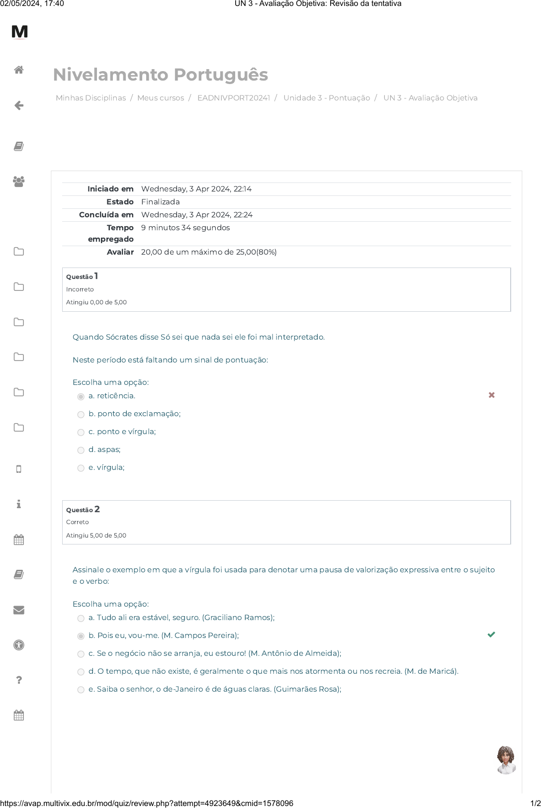 Minhas Disciplinas / Meus cursos / EADNIVPORT20241 / Unidade 3 - Pontuação / UN 3 - Avaliação Objetiva Nivelamento Português Iniciado em Wednesday, 3 Apr 2024, 22:14 Estado Finalizada Concluída em Wednesday, 3 Apr 2024, 22:24 Tempo empregado 9 minutos 34 segundos Avaliar 20,00 de um máximo de 25,00(80%) Questão 1 Incorreto Atingiu 0,00 de 5,00 Questão 2 Correto Atingiu 5,00 de 5,00 Quando Sócrates disse Só sei que nada sei ele foi mal interpretado. Neste período está faltando um sinal de pontuação: Escolha uma opção: a. reticência. b. ponto de exclamação; c. ponto e vírgula; d. aspas; e. vírgula; Assinale o exemplo em que a vírgula foi usada para denotar uma pausa de valorização expressiva entre o sujeito e o verbo: Escolha uma opção: a. Tudo ali era estável, seguro. (Graciliano Ramos); b. Pois eu, vou-me. (M. Campos Pereira); c. Se o negócio não se arranja, eu estouro! (M. Antônio de Almeida); d. O tempo, que não existe, é geralmente o que mais nos atormenta ou nos recreia. (M. de Maricá). e. Saiba o senhor, o de-Janeiro é de águas claras. (Guimarães Rosa); 02/05/2024, 17:40 UN 3 - Avaliação Objetiva: Revisão da tentativa https://avap.multivix.edu.br/mod/quiz/review.php?attempt=4923649&cmid=1578096 1/2 https://avap.multivix.edu.br/my/ https://avap.multivix.edu.br/course/view.php?id=24751 https://avap.multivix.edu.br/course/view.php?id=24751§ion=4 https://avap.multivix.edu.br/mod/quiz/view.php?id=1578096 https://avap.multivix.edu.br/my/ https://avap.multivix.edu.br/course/view.php?id=24751 https://avap.multivix.edu.br/user/index.php?id=24751 https://avap.multivix.edu.br/course/view.php?id=24751§ion=1 https://avap.multivix.edu.br/course/view.php?id=24751§ion=2 https://avap.multivix.edu.br/course/view.php?id=24751§ion=3 https://avap.multivix.edu.br/course/view.php?id=24751§ion=4 https://avap.multivix.edu.br/course/view.php?id=24751§ion=5 https://avap.multivix.edu.br/course/view.php?id=24751§ion=6 https://avap.multivix.edu.br/hooks/portal/ https://avap.multivix.edu.br/mod/page/view.php?id=1252%2F%22%20target%3D%22_blank https://avap.multivix.edu.br/calendar/view.php/ https://avap.multivix.edu.br/local/staticpage/view.php?page=biblioteca https://multivix.edu.br/office-365/ https://multivix.edu.br/acessibilidade/ https://avap.multivix.edu.br/mod/page/view.php?id=7%2F%22%20target%3D%22_blank https://docs.google.com/forms/d/e/1FAIpQLSfyH1O0KRhpI8B0cFqDv3aXT41lziF0mULzRNTBk2x0miNkNA/viewform https://avap.multivix.edu.br/ https://avap.multivix.edu.br/ https://avap.multivix.edu.br/ Questão 3 Correto Atingiu 5,00 de 5,00 Questão 4 Correto Atingiu 5,00 de 5,00 Questão 5 Correto Atingiu 5,00 de 5,00 “Desde que parti (1) duas coisas não me saem da cabeça (2) uma era o pedido de casamento que recebi (3) a outra (4) a maneira como tal atitude foi tomada (5)” Escolha uma opção: a. , ; , , . b. , . ; : . c. ; , : , ? d. : ; , : ! e. , : ; , . Escola Naval - Assinale o item que apresenta erro de pontuação: Escolha uma opção: a. A casa creio que já está alugada. b. Eu sabia, mas não podia falar. c. O Papa, que mora em Roma, tem visitado vários países. d. Eu diria que as árvores pensam. e. Sabedor, nunca o fui. Escola Naval - Assinale a frase que apresenta erro de pontuação: Escolha uma opção: a. Nenhuma das alternativas acima b. Gosto de teatro, ela de cinema. c. São palavras de Deus: “Crescei e multiplicai-vos!” d. Meu �lho, não tenha medo da vida. e. Não sabemos por que você está apressado. ◄ Unidade 3 - Vídeo 02 Seguir para... Unidade 4 - Vídeo 01 ► 02/05/2024, 17:40 UN 3 - Avaliação Objetiva: Revisão da tentativa https://avap.multivix.edu.br/mod/quiz/review.php?attempt=4923649&cmid=1578096 2/2 https://avap.multivix.edu.br/mod/page/view.php?id=1578095&forceview=1 https://avap.multivix.edu.br/mod/page/view.php?id=1578097&forceview=1 https://avap.multivix.edu.br/my/ https://avap.multivix.edu.br/course/view.php?id=24751 https://avap.multivix.edu.br/user/index.php?id=24751 https://avap.multivix.edu.br/course/view.php?id=24751§ion=1 https://avap.multivix.edu.br/course/view.php?id=24751§ion=2 https://avap.multivix.edu.br/course/view.php?id=24751§ion=3 https://avap.multivix.edu.br/course/view.php?id=24751§ion=4 https://avap.multivix.edu.br/course/view.php?id=24751§ion=5 https://avap.multivix.edu.br/course/view.php?id=24751§ion=6 https://avap.multivix.edu.br/hooks/portal/ https://avap.multivix.edu.br/mod/page/view.php?id=1252%2F%22%20target%3D%22_blank https://avap.multivix.edu.br/calendar/view.php/ https://avap.multivix.edu.br/local/staticpage/view.php?page=biblioteca https://multivix.edu.br/office-365/ https://multivix.edu.br/acessibilidade/ https://avap.multivix.edu.br/mod/page/view.php?id=7%2F%22%20target%3D%22_blank https://docs.google.com/forms/d/e/1FAIpQLSfyH1O0KRhpI8B0cFqDv3aXT41lziF0mULzRNTBk2x0miNkNA/viewform https://avap.multivix.edu.br/ https://avap.multivix.edu.br/ https://avap.multivix.edu.br/