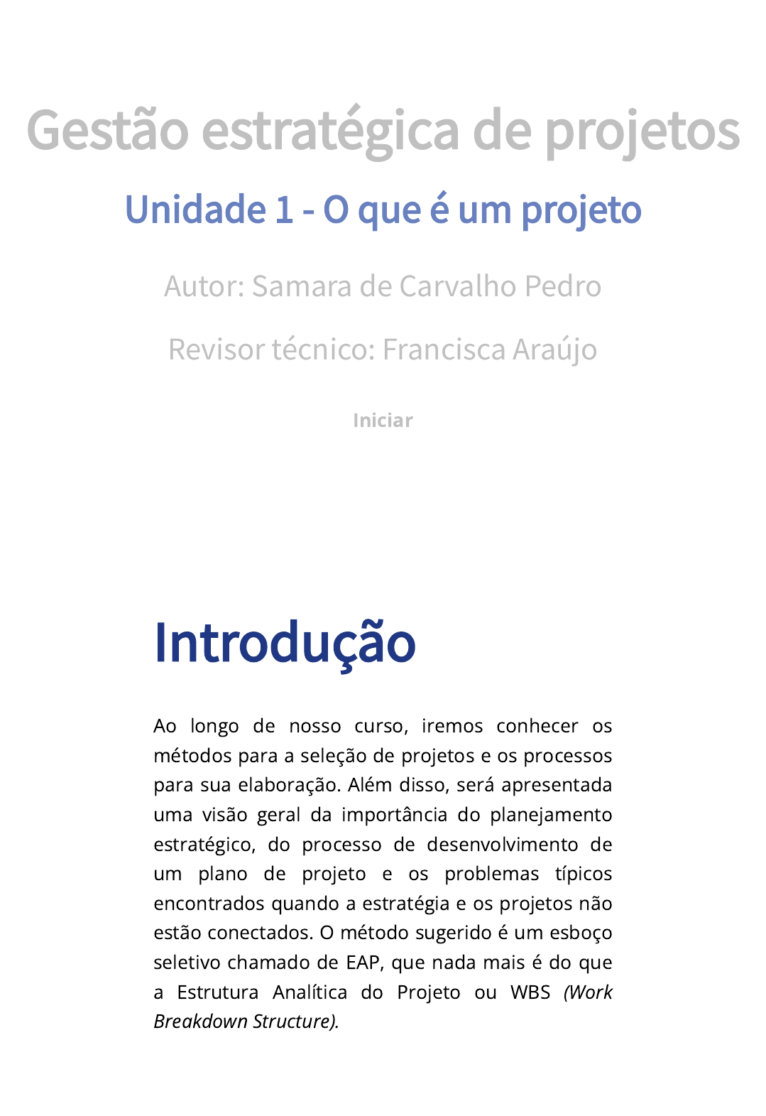 11/03/2024, 11:35 NEG_GESTES_21_E_1 https://student.ulife.com.br/ContentPlayer/Index?lc=6Yrr6o0etF8flFn%2fMOAk9A%3d%3d&l=tDV99EQCGSHxTriFTIP7xQ%3d%3d&cd=tOtquzf… 1/21 Introdução Ao longo de nosso curso, iremos conhecer os métodos para a seleção de projetos e os processos para sua elaboração. Além disso, será apresentada uma visão geral da importância do planejamento estratégico, do processo de desenvolvimento de um plano de projeto e os problemas típicos encontrados quando a estratégia e os projetos não estão conectados. O método sugerido é um esboço seletivo chamado de EAP, que nada mais é do que a Estrutura Analítica do Projeto ou WBS (Work Breakdown Structure). Gestão estratégica de projetos Unidade 1 - O que é um projeto Autor: Samara de Carvalho Pedro Revisor técnico: Francisca Araújo Iniciar 11/03/2024, 11:35 NEG_GESTES_21_E_1 https://student.ulife.com.br/ContentPlayer/Index?lc=6Yrr6o0etF8flFn%2fMOAk9A%3d%3d&l=tDV99EQCGSHxTriFTIP7xQ%3d%3d&cd=tOtquzf… 2/21 Todo projeto possui seus estágios iniciais, em que é desenvolvido o esboço, para assegurar que todas as tarefas estão identi�cadas e que os participantes do projeto adquiram um entendimento do que deve ser feito. Uma vez de�nidos o esboço e seus detalhes, um sistema de informações integrado pode ser desenvolvido para planejar o trabalho e alocar os recursos. Essas linhas de base serão usadas mais tarde para controle. E por falar em controle e alocação de recursos, não poderíamos deixar de citar o gerente de projetos. Os gerentes de projeto devem garantir que toda a equipe compartilhe uma meta �nal coletiva e trabalhe em conjunto para alcançá-la. A e�ciência geral e a produtividade de toda a equipe aumentam signi�cativamente, o que também leva a outros benefícios. Apresentado o caminho de nossa aprendizagem, vamos agora nos aprofundar em cada temática. 1. Gestão de projetos – conceitos iniciais A de�nição do nome deste curso facilita a compreensão do nosso estudo. Gestão, é o ato de gerir, de administrar, de direcionar. Projeto, é o plano para realizar um ato; um esboço inicial; uma representação grá�ca e escrita com orçamento de uma obra que será realizada. O planejamento estratégico, por sua vez, pode ser encarado, de acordo com Fischmann e Almeida (2018), como sendo uma técnica que, através da análise do ambiente de uma organização, cria a consciência das oportunidades e ameaças, dos 11/03/2024, 11:35 NEG_GESTES_21_E_1 https://student.ulife.com.br/ContentPlayer/Index?lc=6Yrr6o0etF8flFn%2fMOAk9A%3d%3d&l=tDV99EQCGSHxTriFTIP7xQ%3d%3d&cd=tOtquzf… 3/21 seus pontos fortes e fracos para o cumprimento de sua missão. E, através desta consciência, estabelece o propósito e direção que a organização deverá seguir para aproveitar as oportunidades e evitar riscos. Existem muitas de�nições para projetos e, em razão disso, optamos por um alinhamento ao conceito do PMI – ( Project Management Institute ) citado por Menezes (2003) que é: “um empreendimento único que deve apresentar um início e um �m claramente de�nidos é temporário e que, conduzidos por pessoas, possa atingir seus objetivos respeitando os parâmetros de prazo, custo e qualidade” . A iniciação do projeto precisa ser marcada pela de�nição do Patrocinador, do Gerente do projeto e da equipe básica, três elementos essenciais para o início do projeto. Para que �que claro, a equipe básica é formada por especialistas que possam auxiliar na de�nição do projeto e no seu transcorrer. A sua função inicial é a de entender a real necessidade do cliente e permitir que suas soluções se somem e agreguem valor ao cliente. A equipe básica deve ser composta por especialistas que entendam da sua área assim como do relacionamento de áreas interligadas no projeto. Esses membros são essenciais durante a fase de concepção do projeto. O início e a entrega bem-sucedidos de um projeto sempre se baseiam no patrocínio do projeto, uma função da alta administração que apoia um projeto �nanceiramente e, também, por meio de consultoria e liderança. Se o seu projeto for bem �nanciado pelo patrocinador do projeto (que de acordo com o PMI, corresponde a uma pessoa ou um grupo de pessoas que fornece recursos e suporte �nanceiro para o projeto), sua equipe obtém os recursos e suportes necessários para realizar os trabalhos, atingir os objetivos e produzir os resultados conforme o plano do projeto. O patrocinador autoriza a alocação de fundos e toma decisões importantes relacionadas aos �uxos de caixa de seu projeto. O gerente do projeto é uma pessoa com responsabilidade geral pela iniciação, planejamento, design , execução, monitoramento, controle e encerramento bem- sucedidos de um projeto. O gerente de projeto deve ter uma combinação de habilidades, incluindo a capacidade de fazer perguntas penetrantes, detectar 11/03/2024, 11:35 NEG_GESTES_21_E_1 https://student.ulife.com.br/ContentPlayer/Index?lc=6Yrr6o0etF8flFn%2fMOAk9A%3d%3d&l=tDV99EQCGSHxTriFTIP7xQ%3d%3d&cd=tOtquzf… 4/21 suposições não declaradas e resolver con�itos, bem como habilidades de gerenciamento mais gerais. Uma das principais funções de um gerente de projeto é o reconhecimento de que o risco impacta diretamente a probabilidade de sucesso e que esse risco deve ser medido tanto formal quanto informalmente ao longo da vida útil de um projeto. Uma equipe de projeto é um grupo de pessoas que trabalham em prol de um objetivo comum, trazendo habilidades valiosas e exclusivas para a mesa. De�nir os membros da equipe do projeto, de�nir a identidade da equipe e padronizar as práticas operacionais são essenciais para um projeto bem-sucedido. A equipe básica deve ser composta por especialistas que entendam da sua área, assim como o relacionamento de áreas interligadas no projeto. A �gura 1 apresenta os pontos- chave de um projeto, começando pela de�nição do escopo at